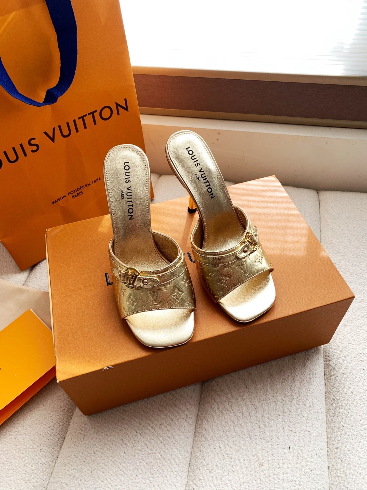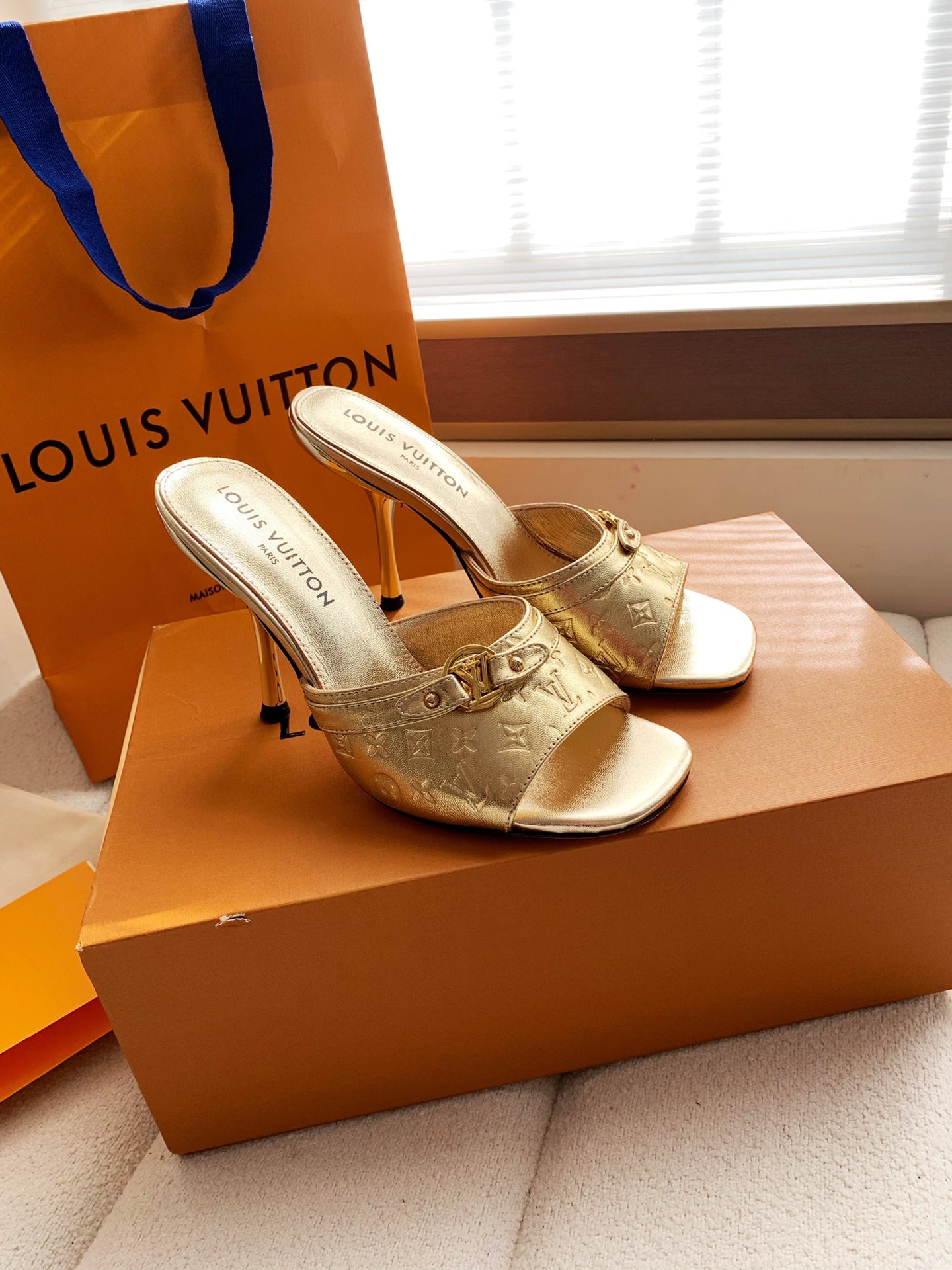 LV 26s High Heels 95 Slippers Gold Metallic Sheepskin 614989