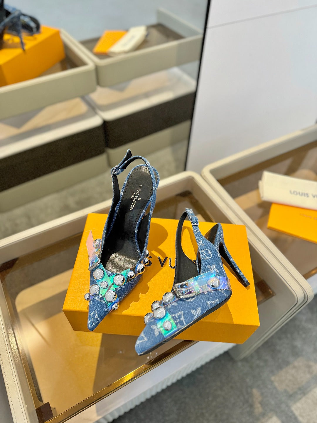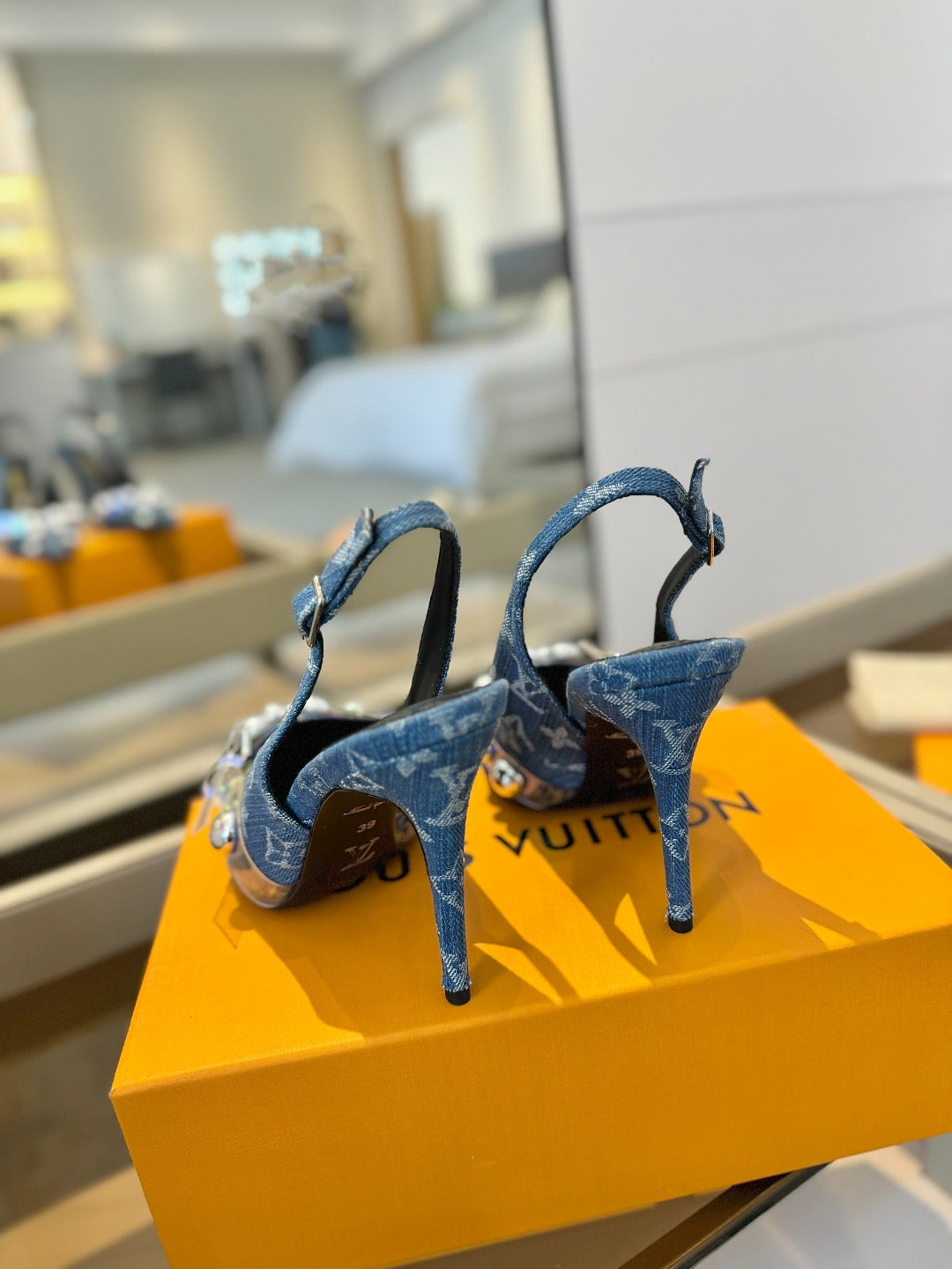 HIGH HEELS 95 MM IN CLASSIC BLUE MONOGRAM DENIM WITH CRYSTALS