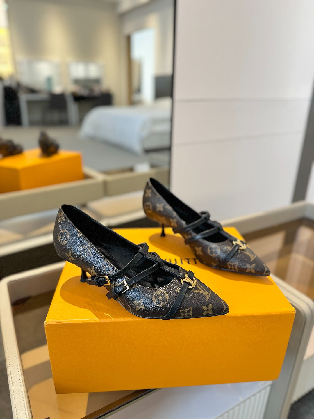 HIGH PUMP 5 CM TRIPLE-STRAP IN CHOCOLATE BROWN MONOGRAM CALFSKIN WITH BLACK STRAP