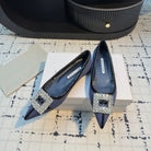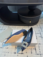 Hangisi 10mm Ballet Flat Dark Blue Linen with Black Leather Jewel Buckle 161059