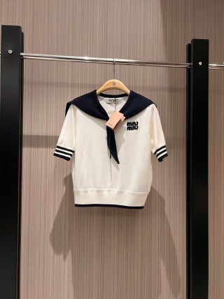 Miu Miu Collar Knotted Short-sleeved Knitted Top Wool tencel