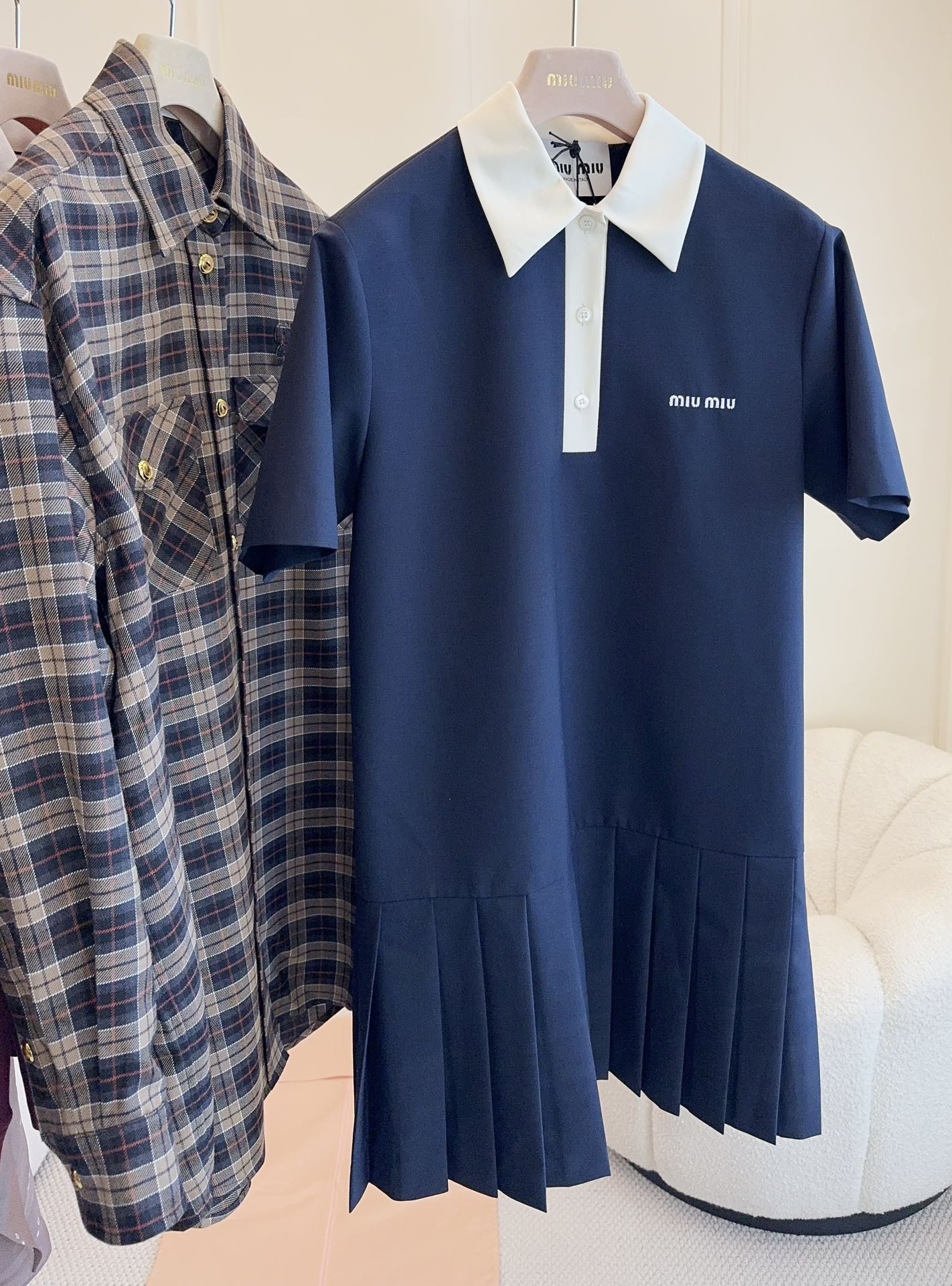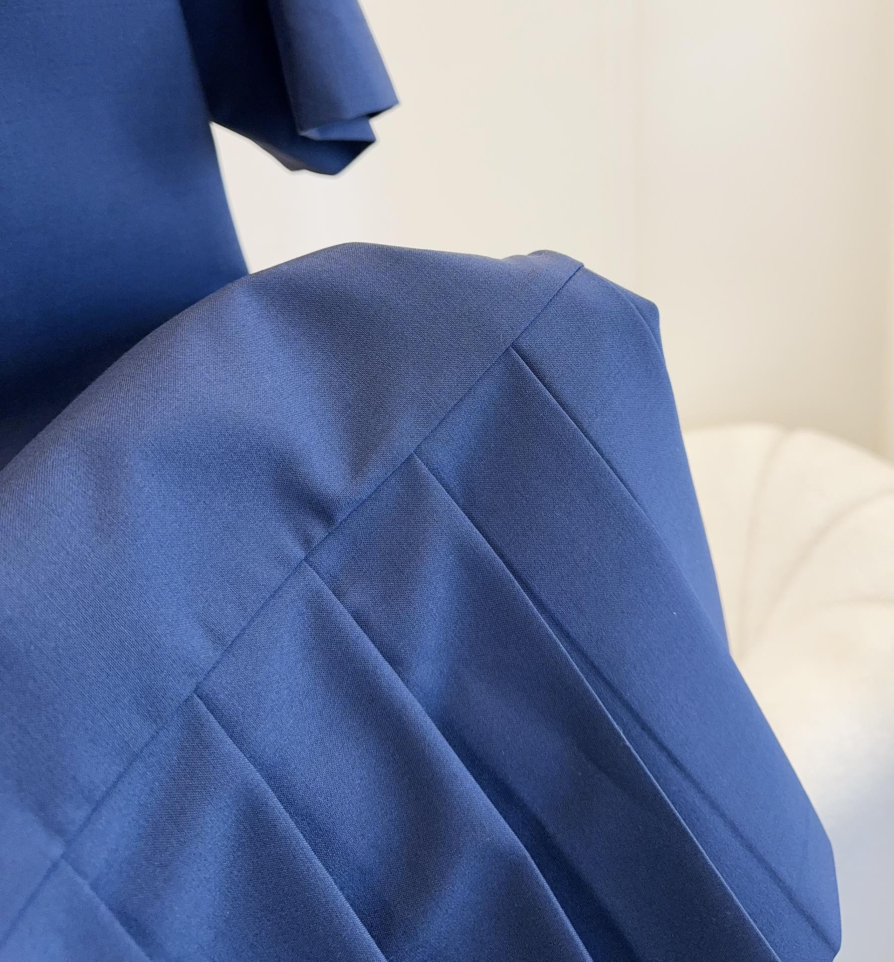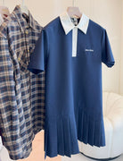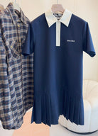 Miumiu 2025 Short-sleeved Pleated Dress Navy Blue Cotton