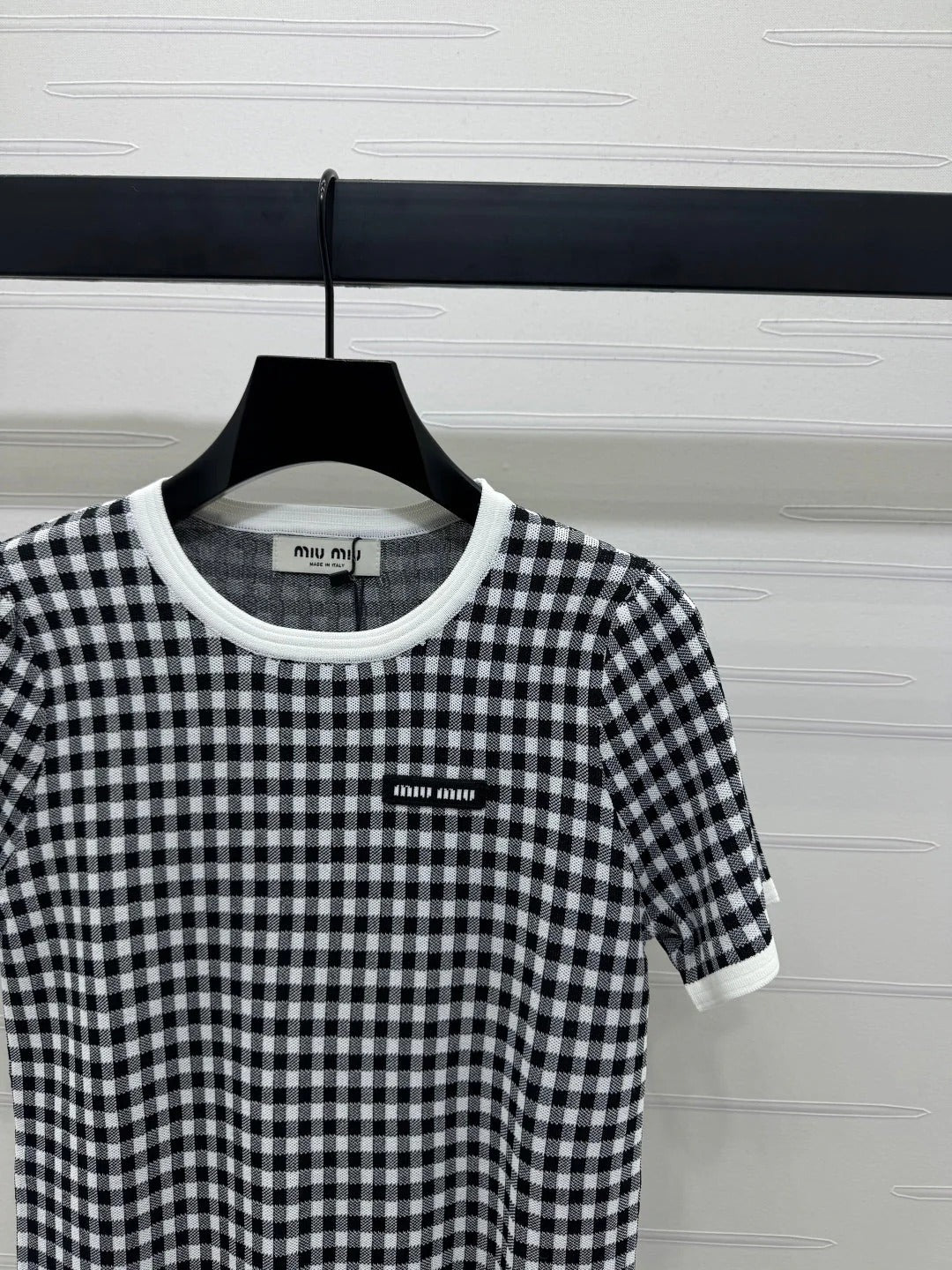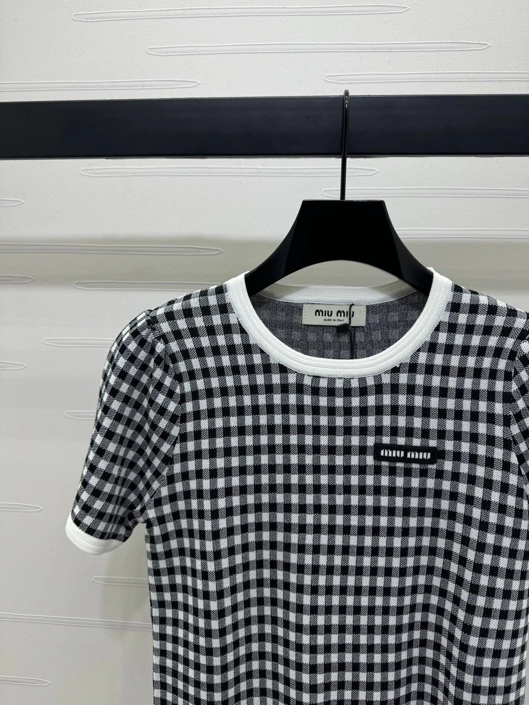 MIUMIU CREW NECK SHORT-SLEEVE PLAID KNIT TOP 274833