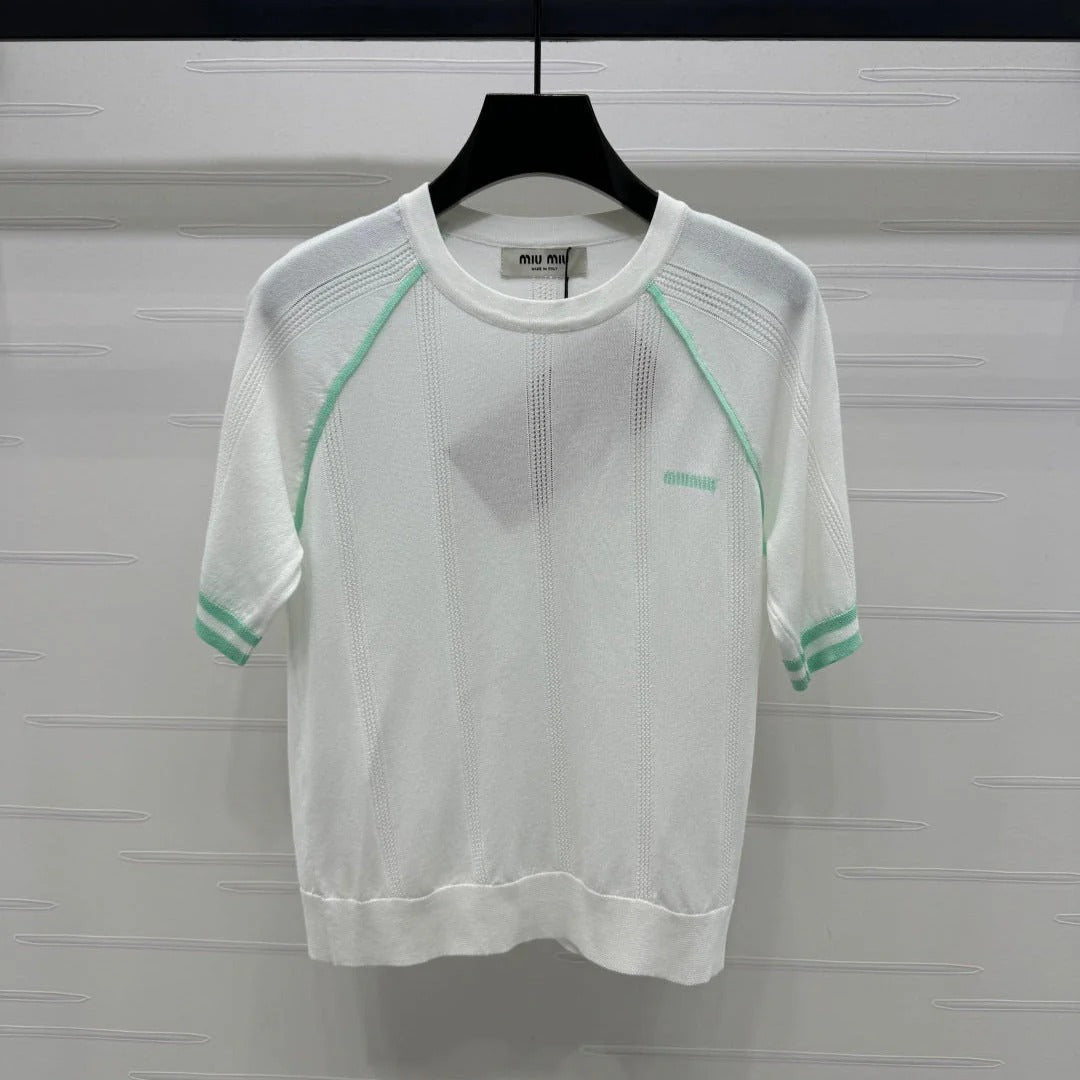 MIU 25S ROUND NECK STRIPED KNIT RAGLAN SHORT SLEEVES 264108