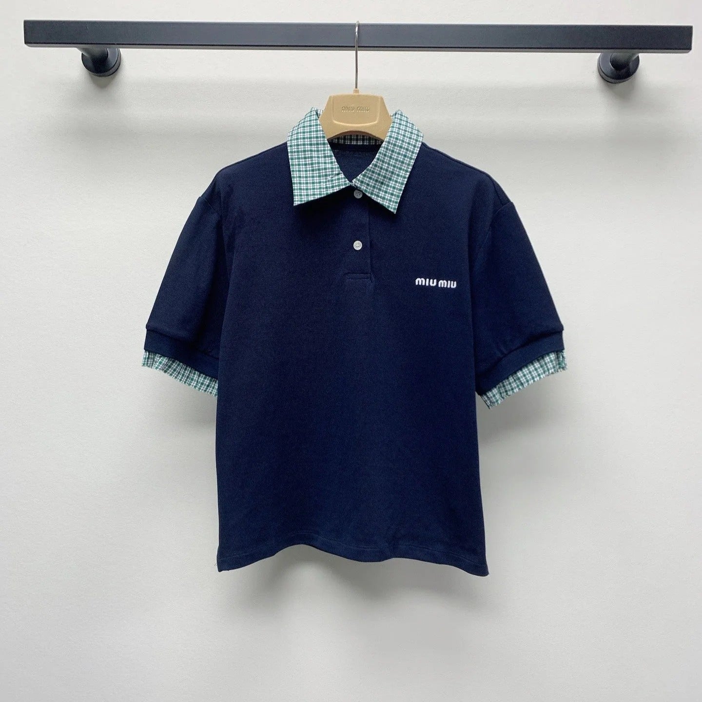 MIUMIU CREW NECK SHORT-SLEEVE PLAID KNIT TOP 274833
