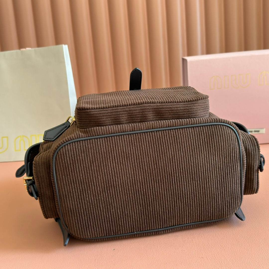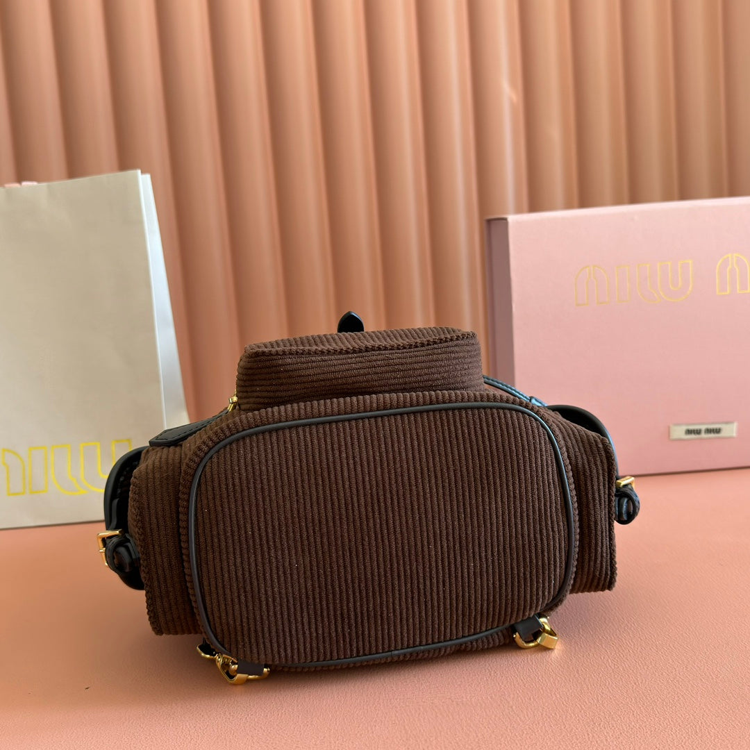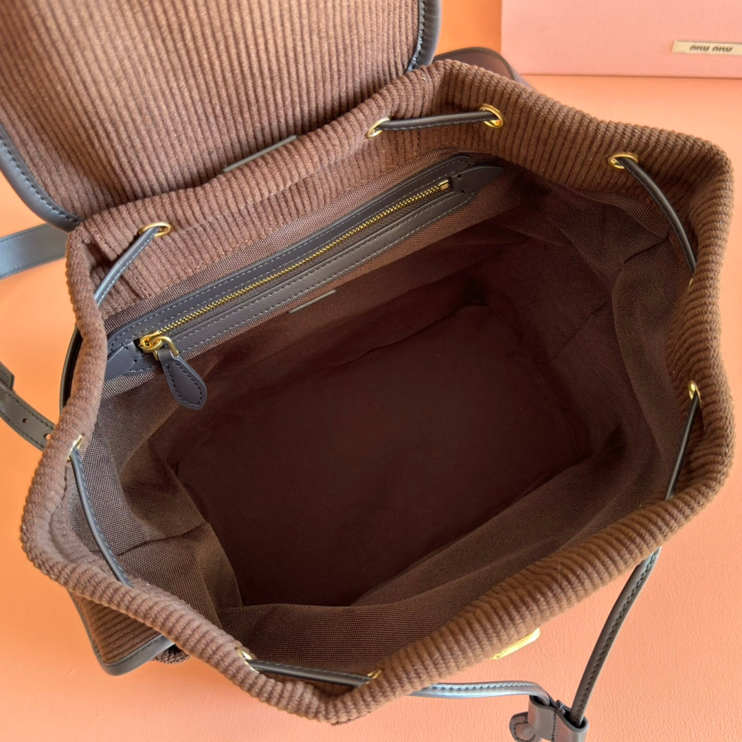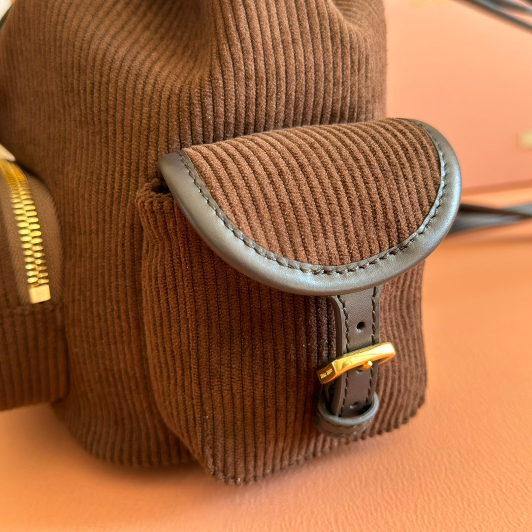 Miu Small Corduroy Backpack Dark Brown Leather-Trim