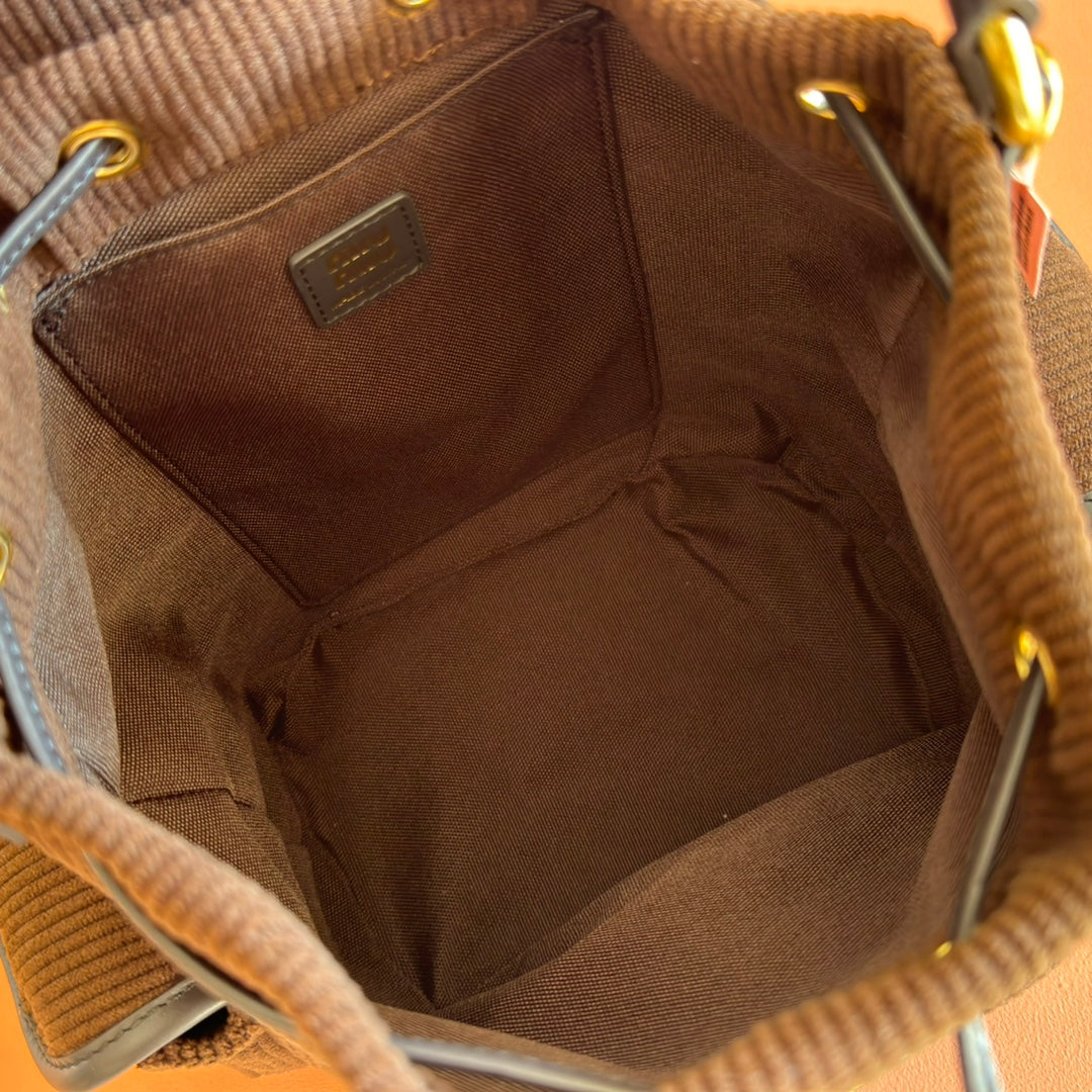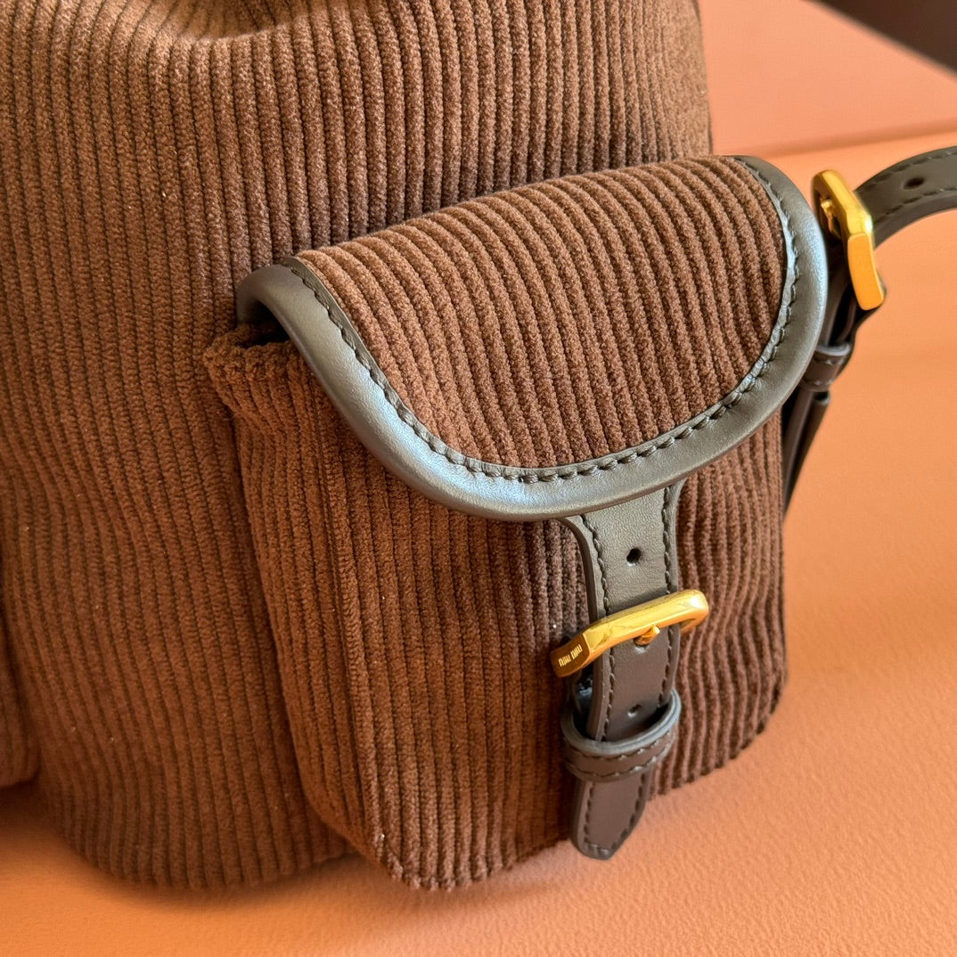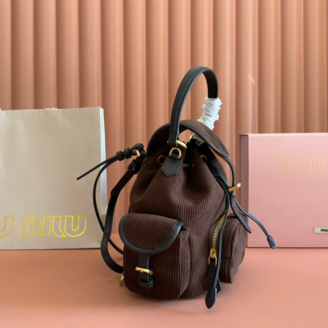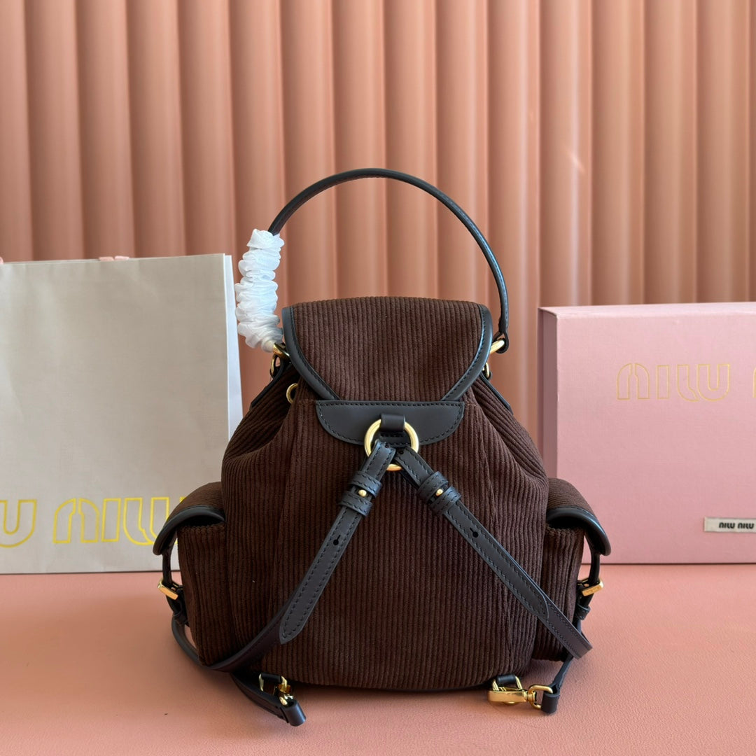 Miu Small Corduroy Backpack Dark Brown Leather-Trim