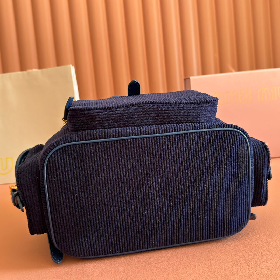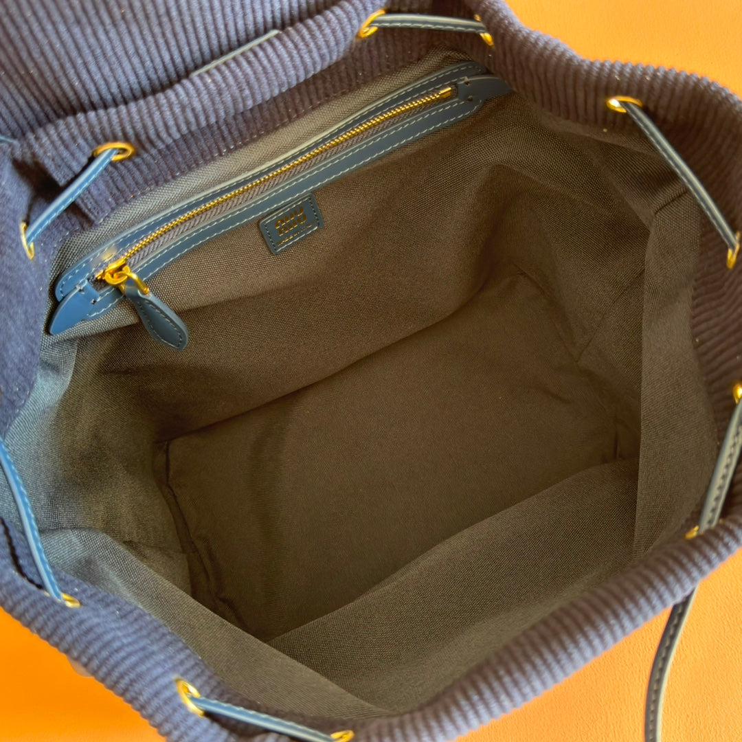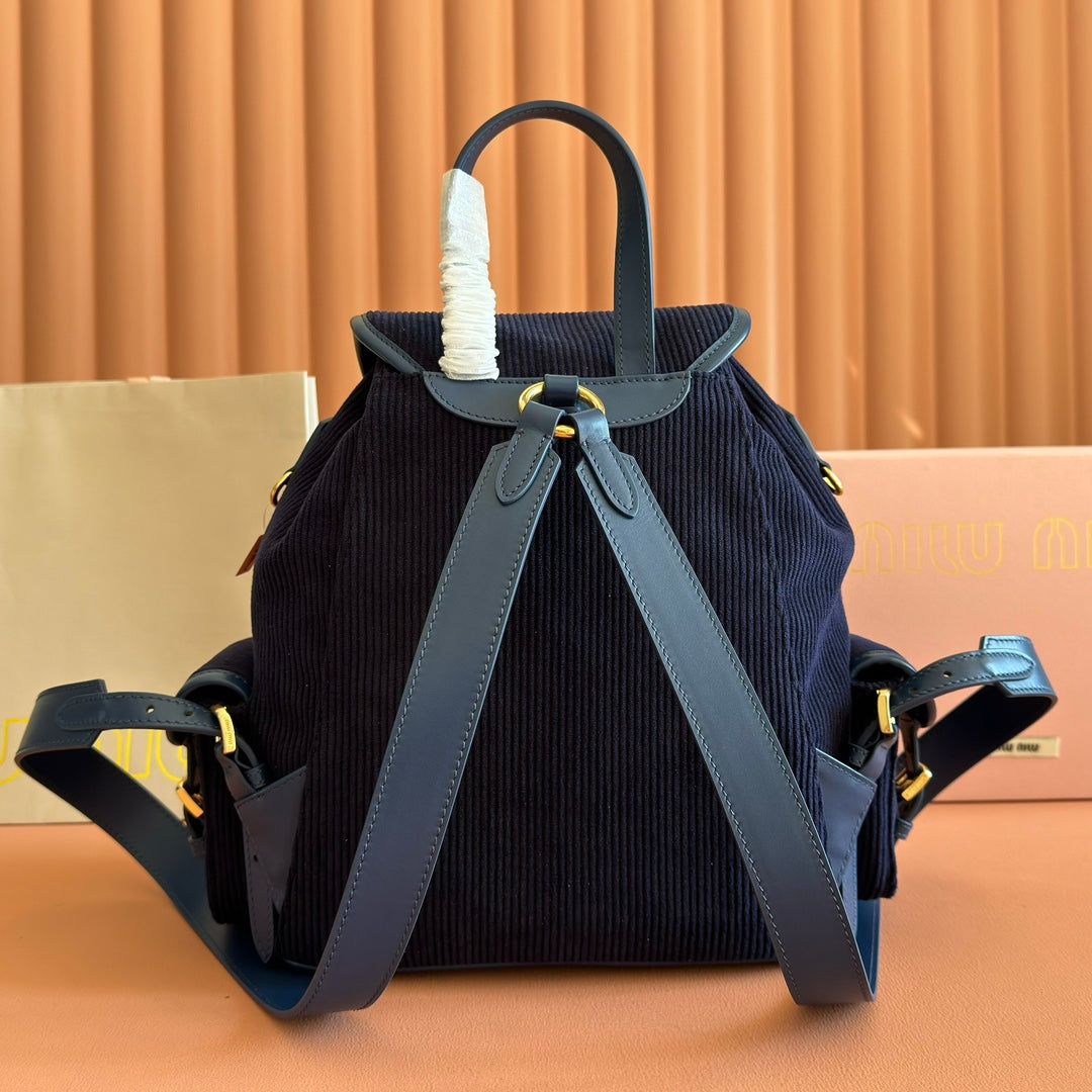 Miu Medium Corduroy Backpack Navy Blue Leather-Trim