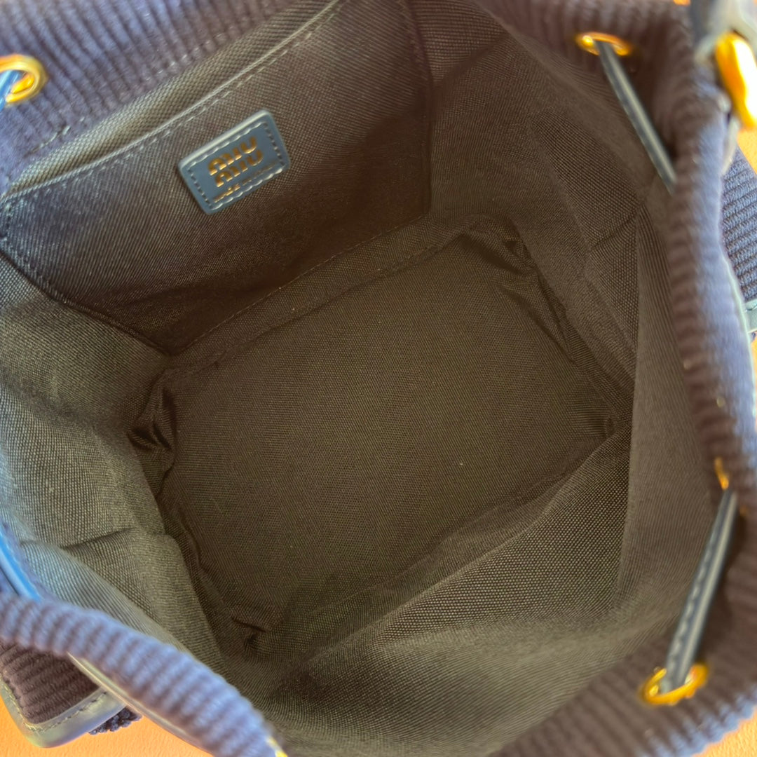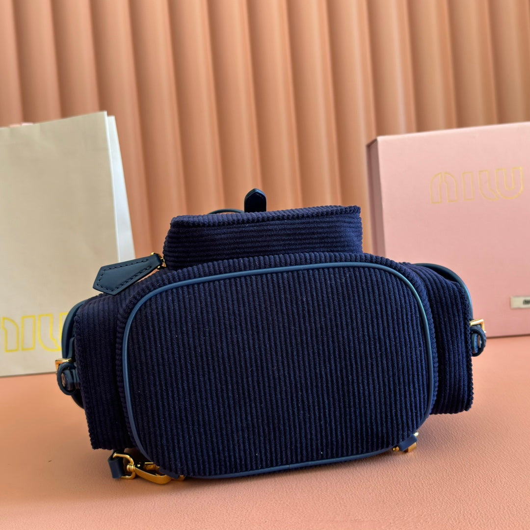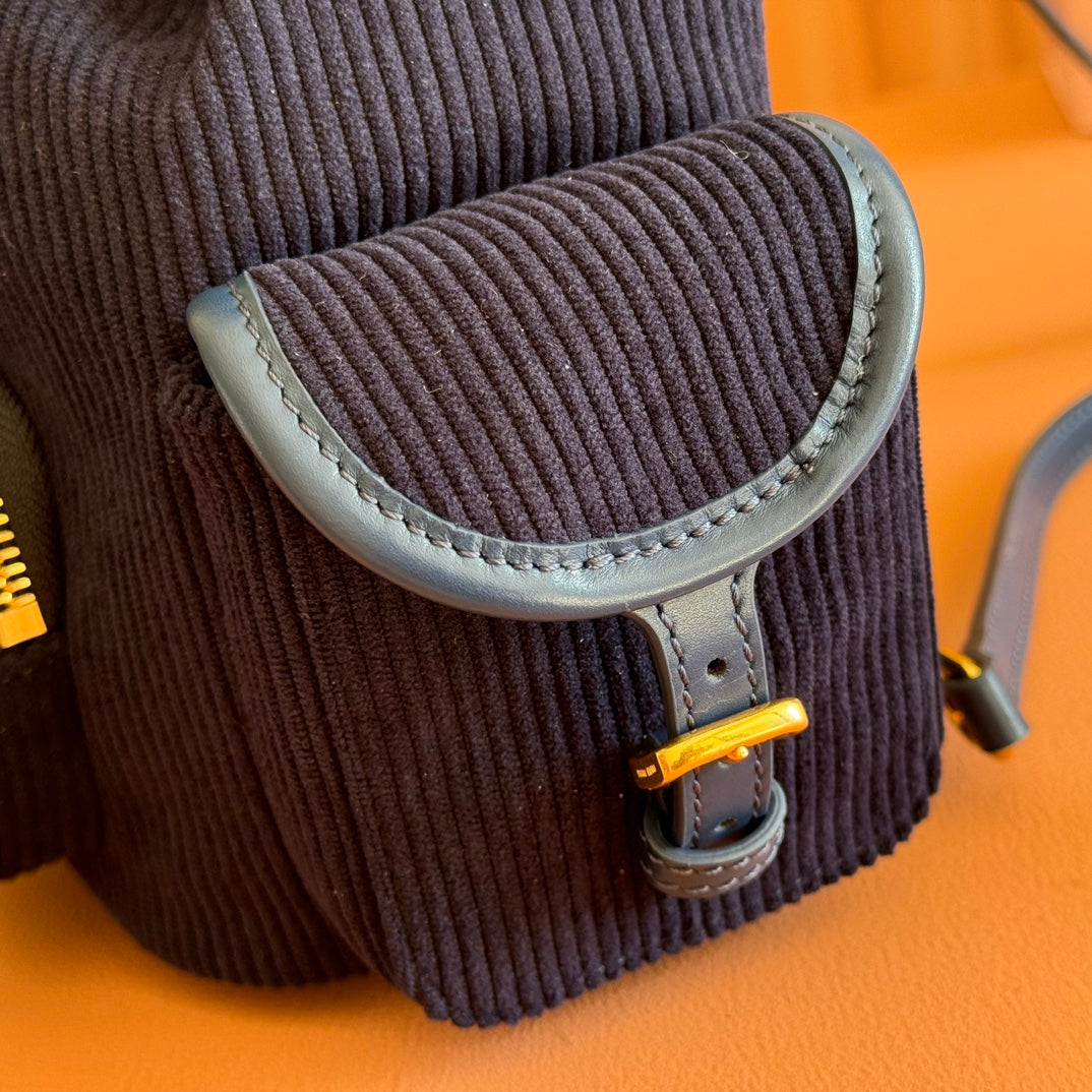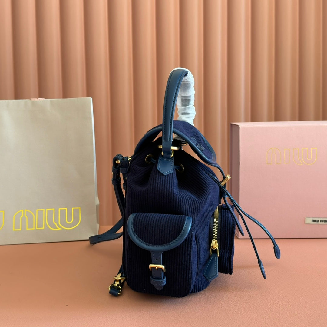 Miu Medium Corduroy Backpack Navy Blue Leather-Trim
