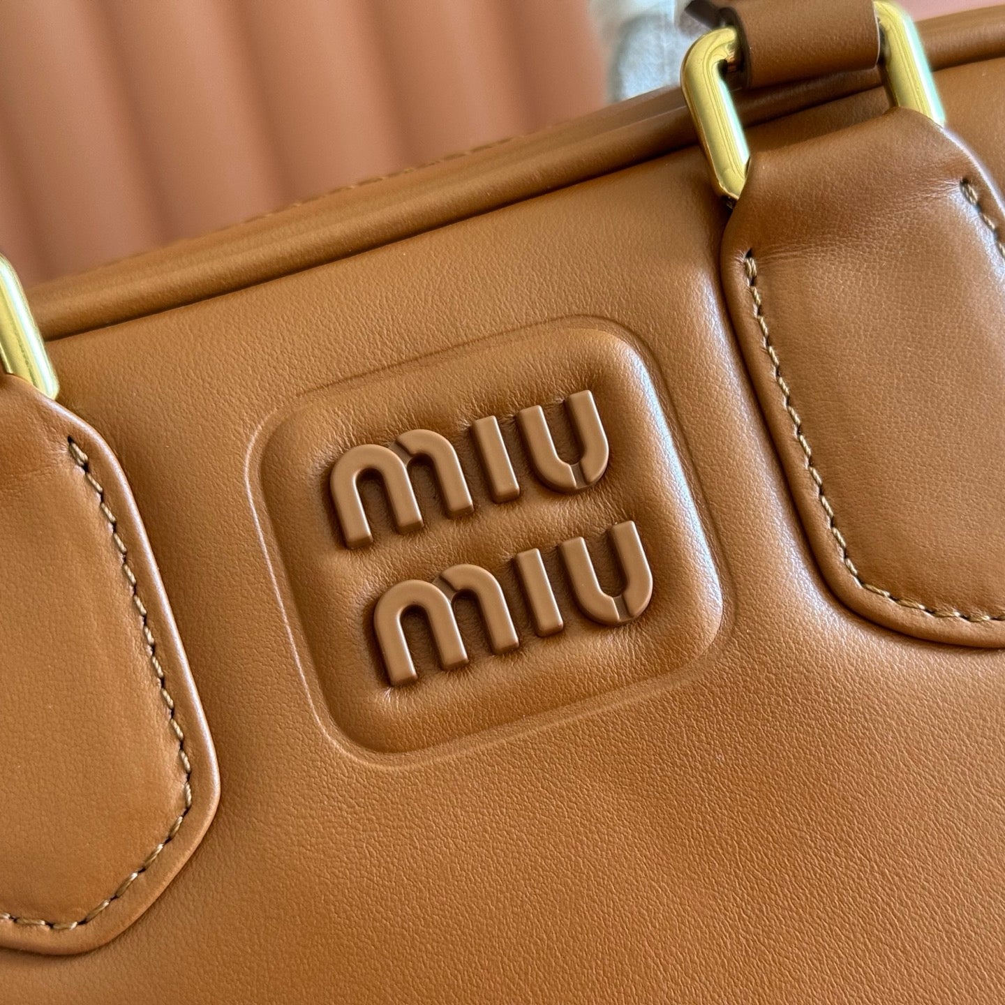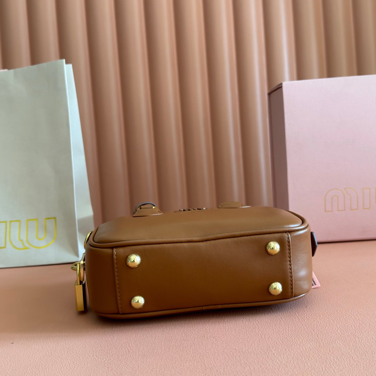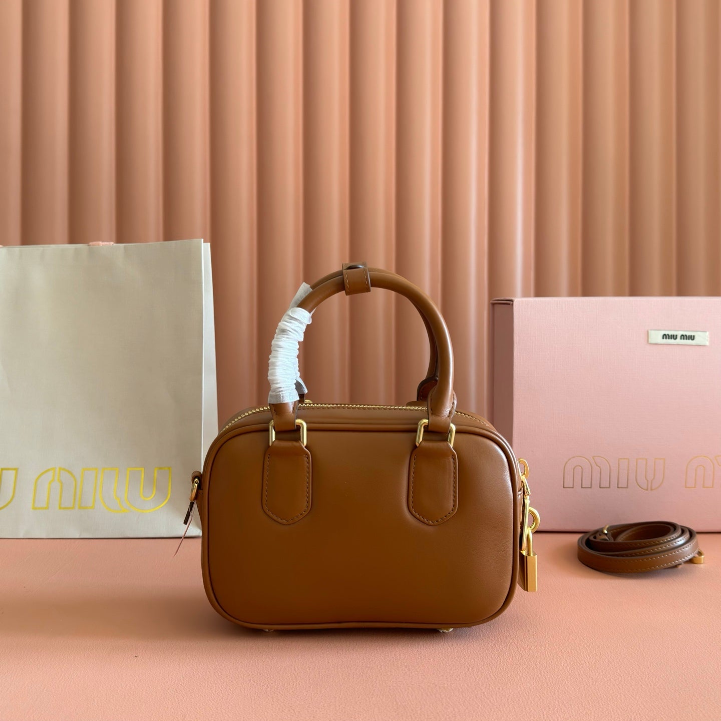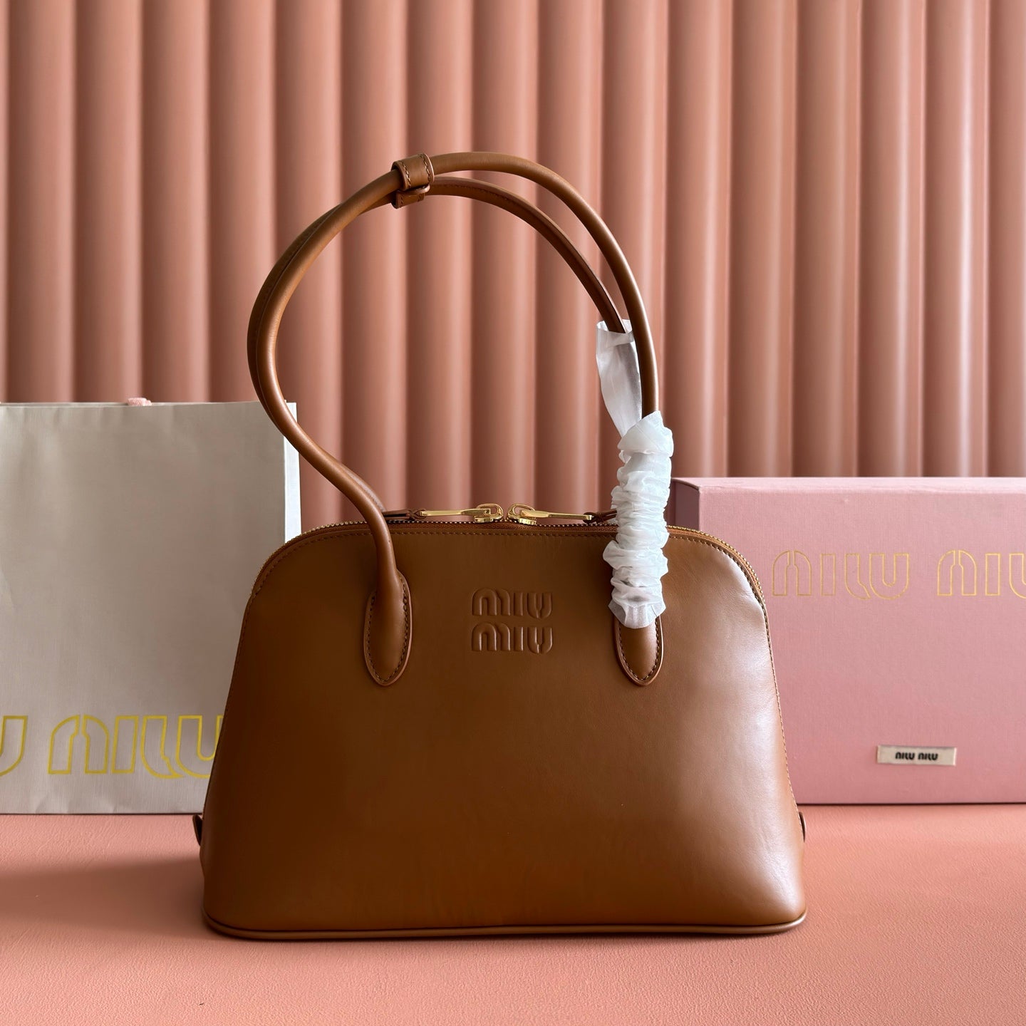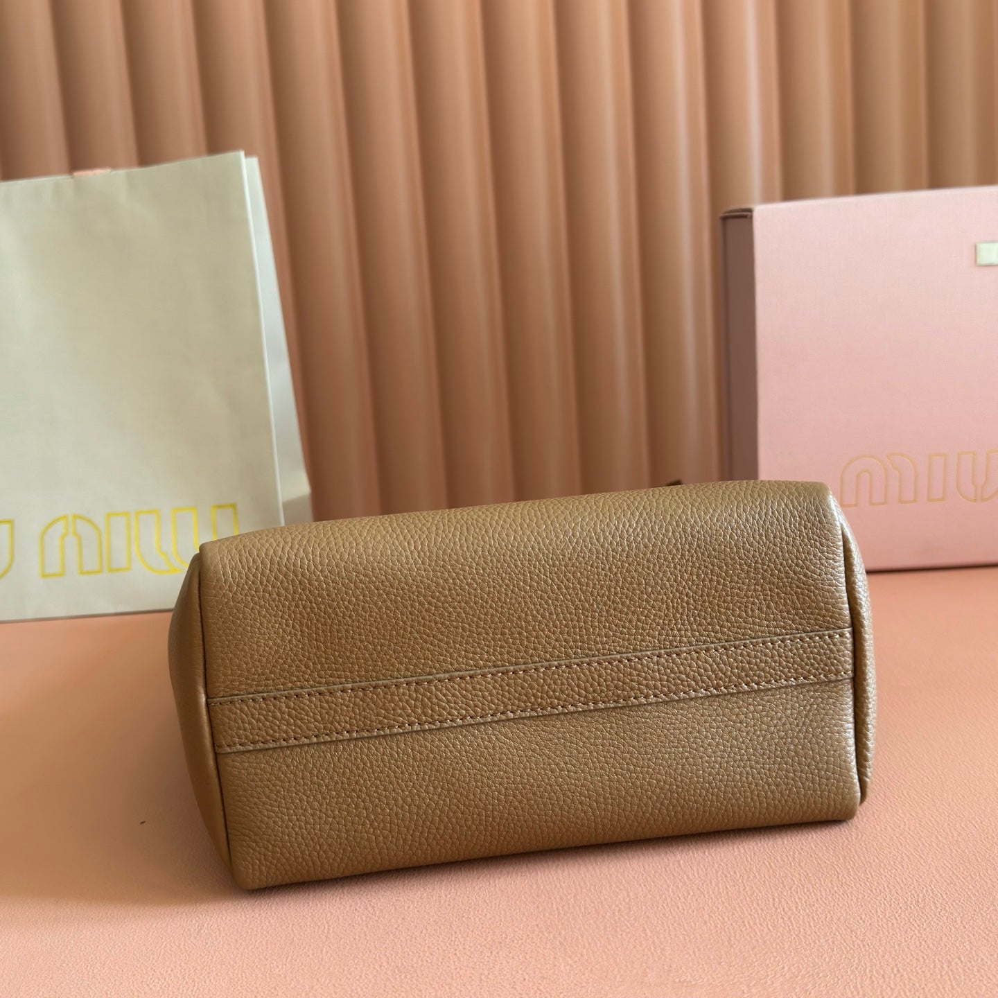 Miu Arcadie Small 19cm Bowling Handbag Camel Cowhide 280990