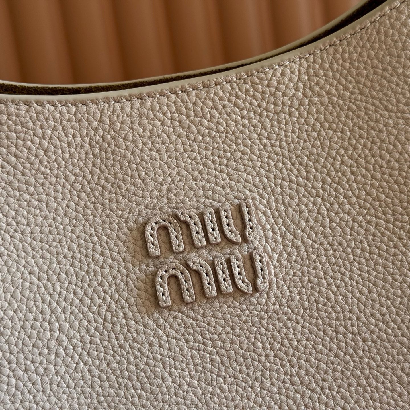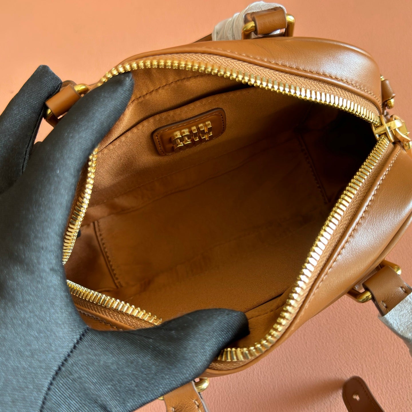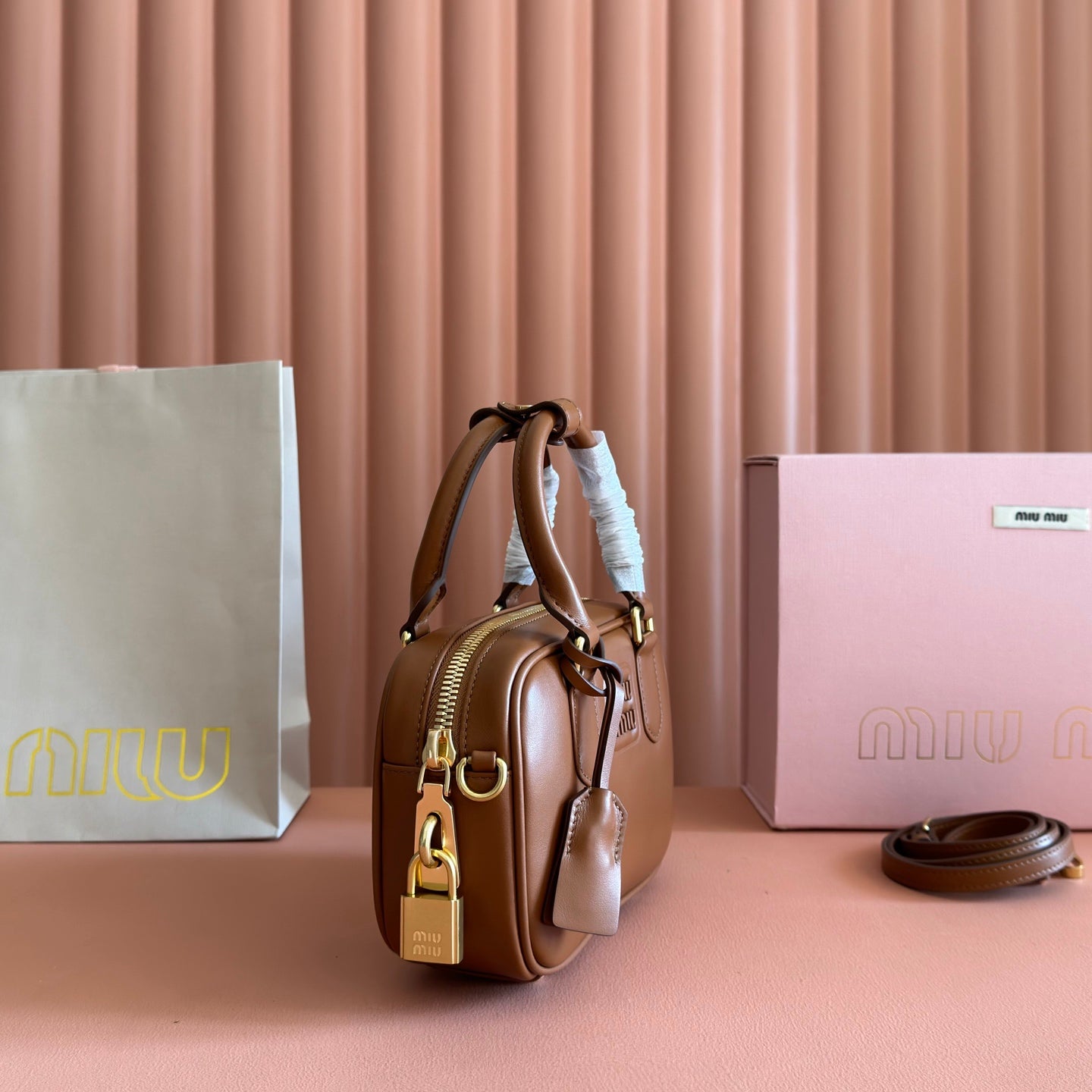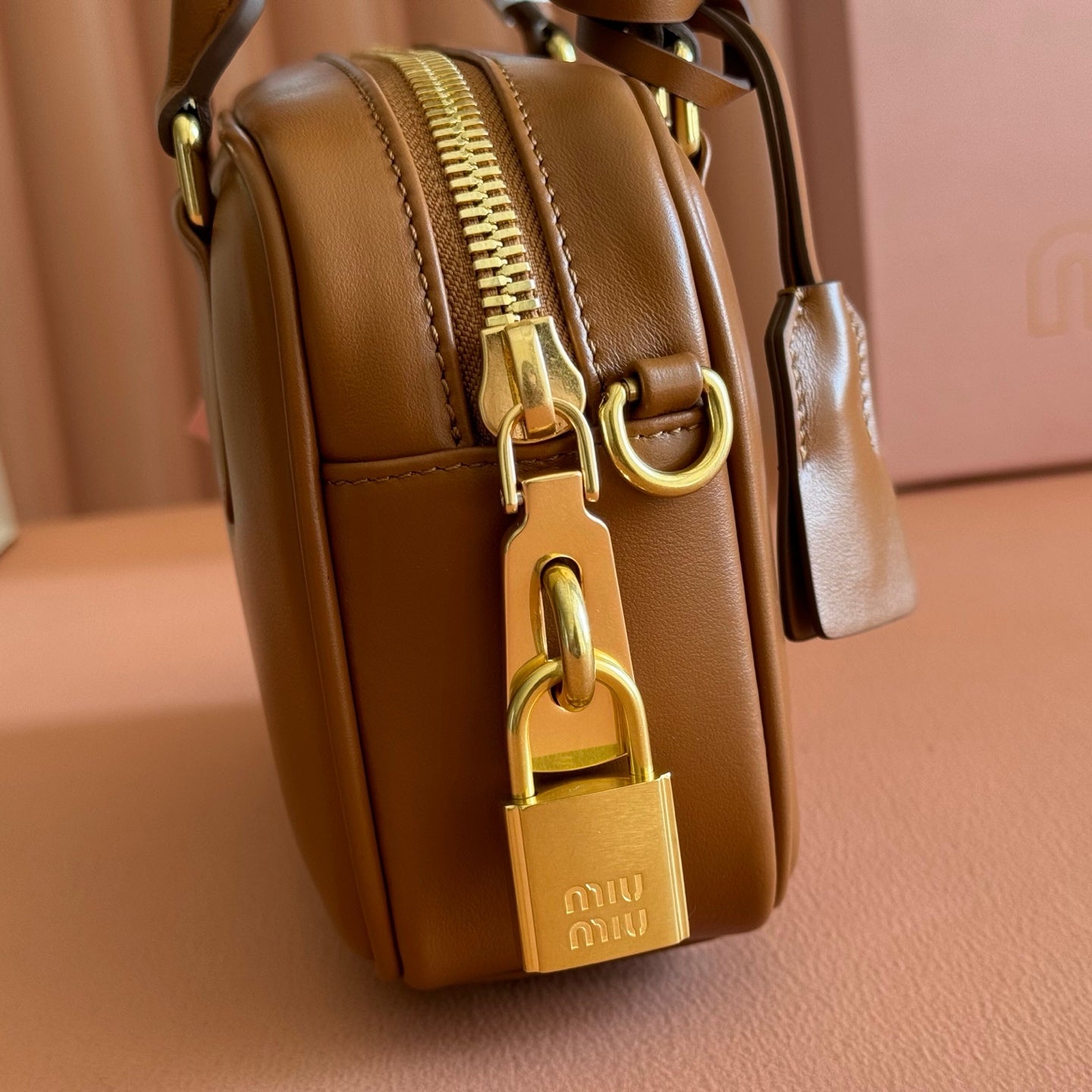 Miu Arcadie Small 19cm Bowling Handbag Camel Cowhide 280990