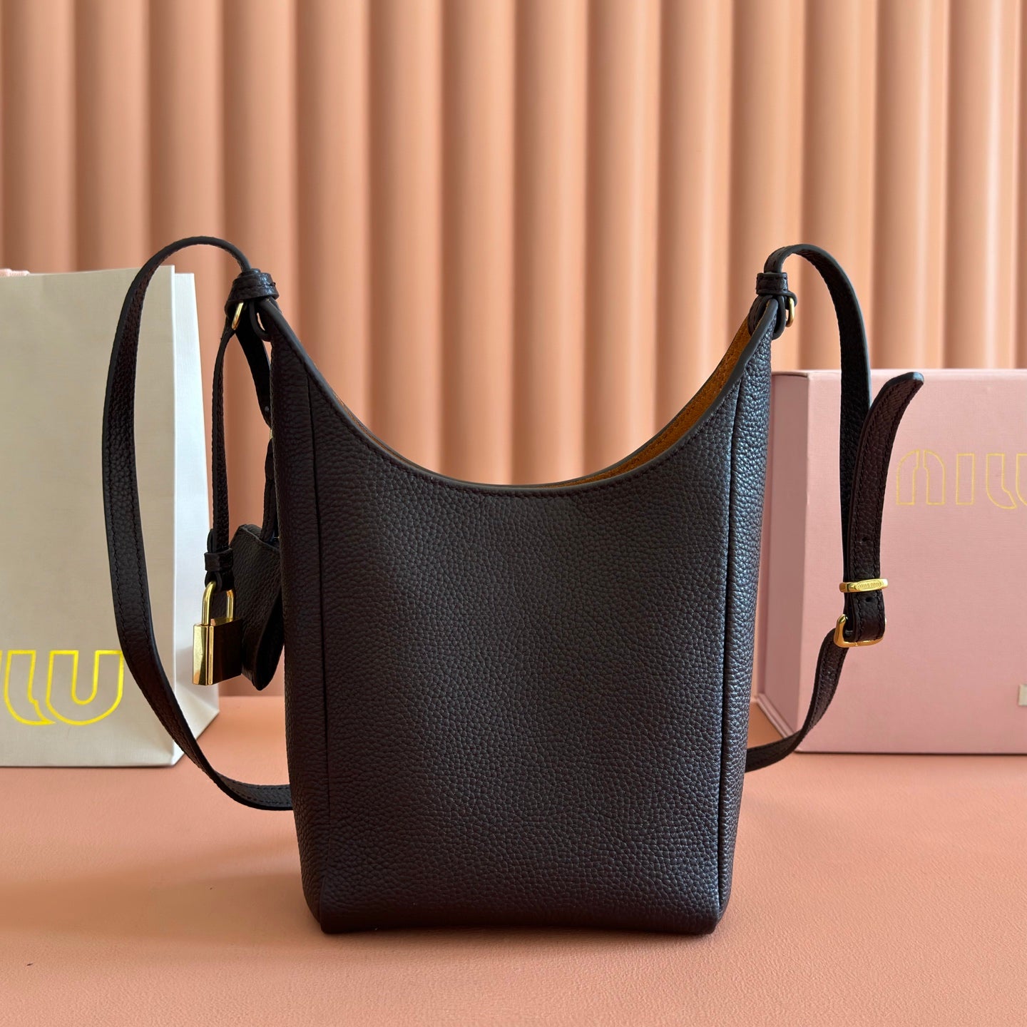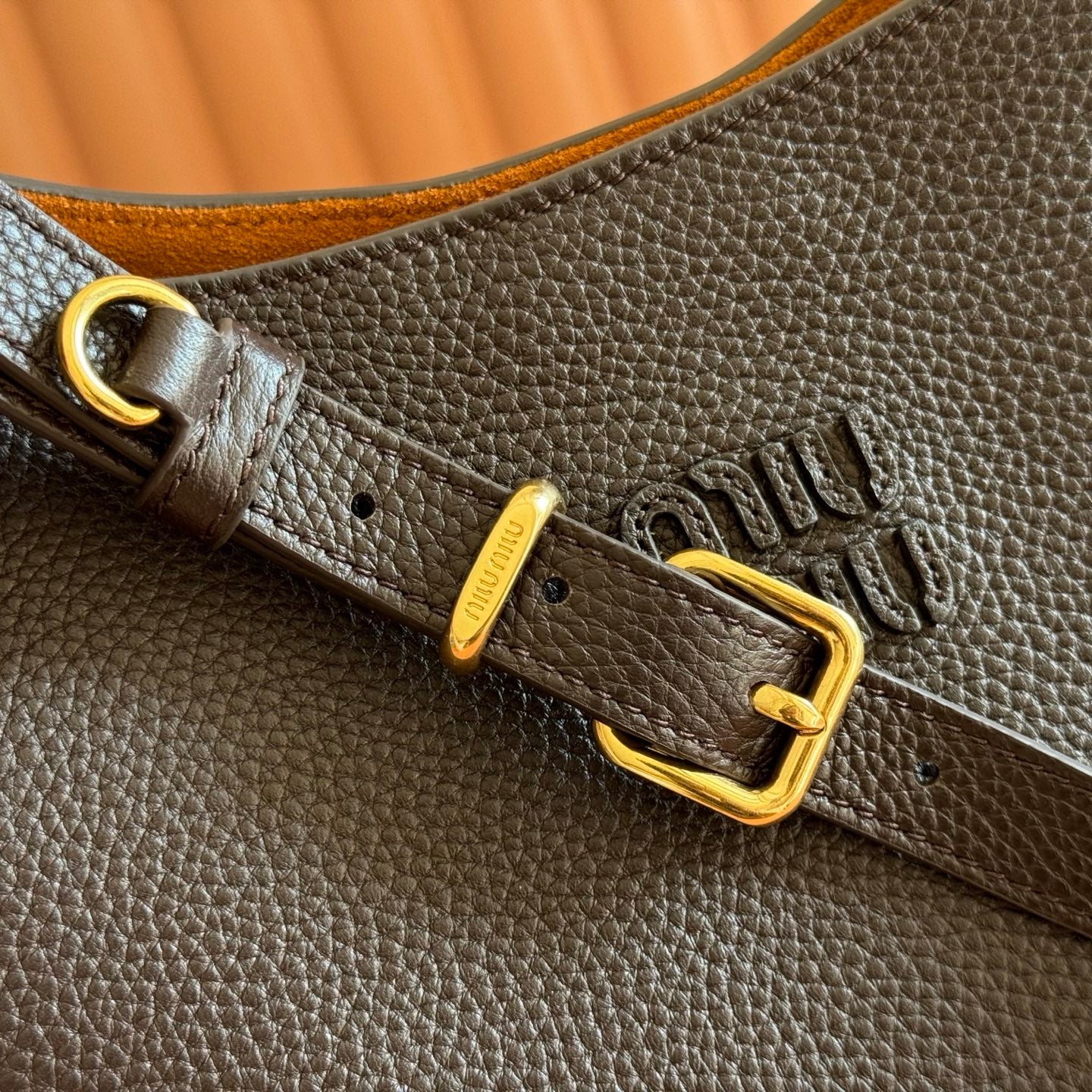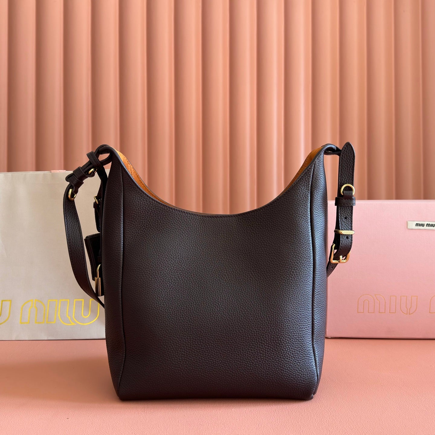 Miu Leather Bucket Bag 23cm Brown Grain Cowhide