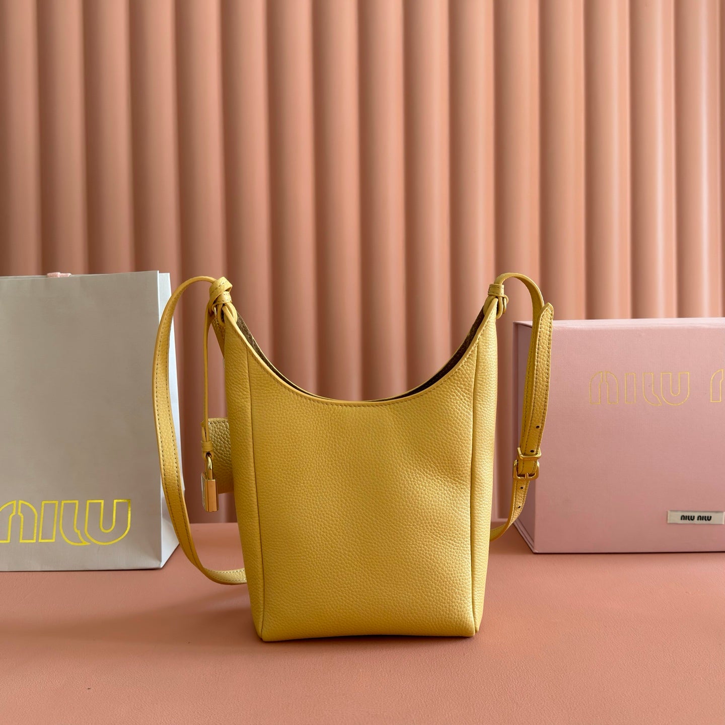 Miu Leather Bucket Bag 16cm Yellow Grain Cowhide