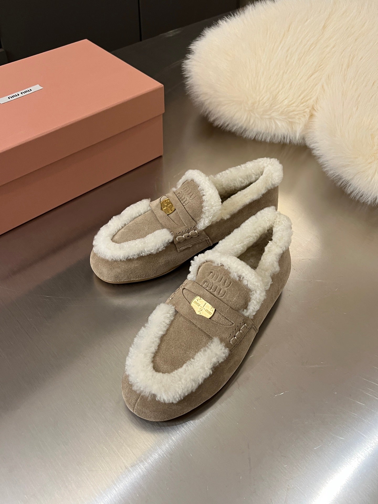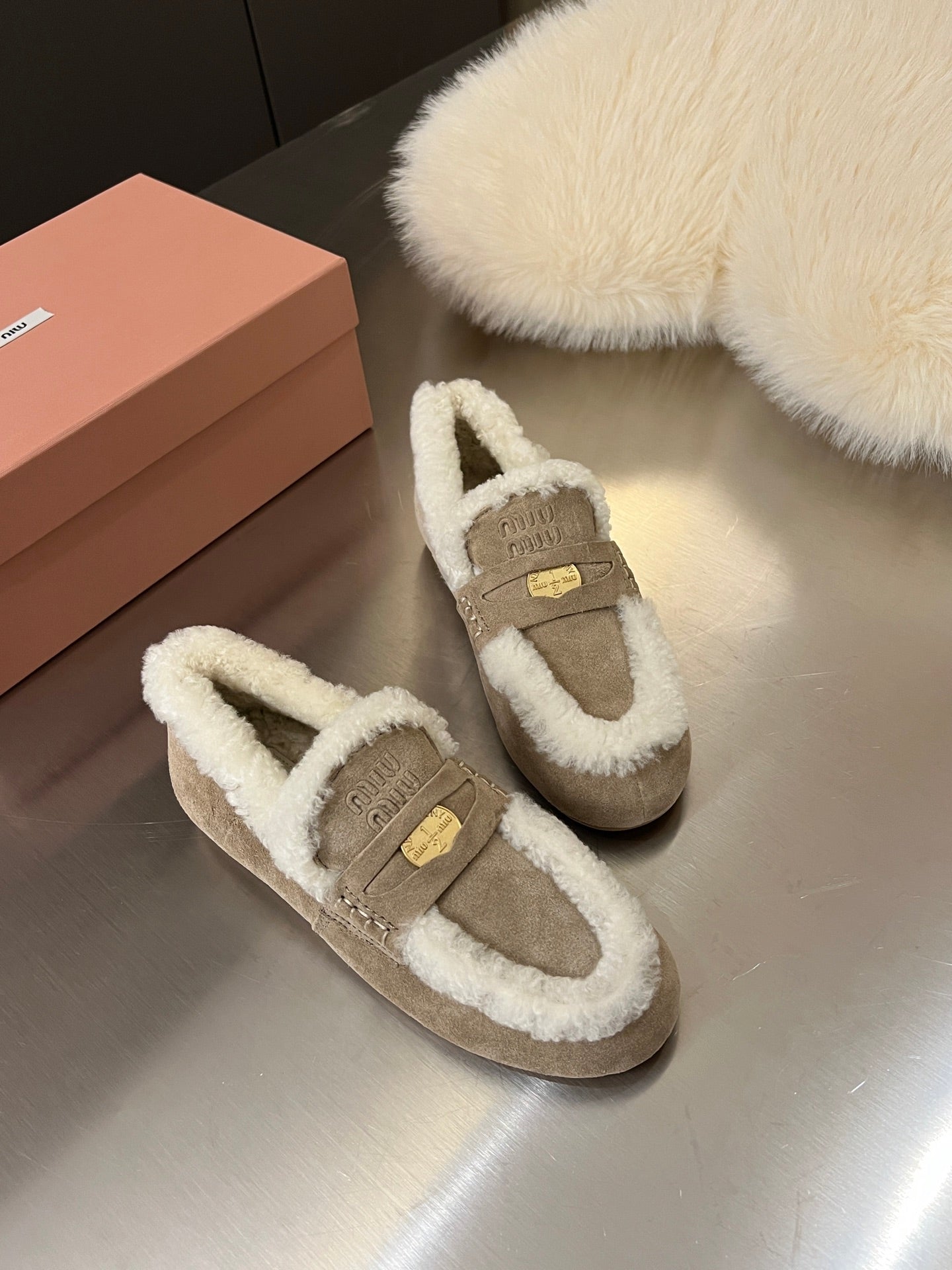 Miu Logo-Embossed Loafer Taupe Suede Shearling 455917
