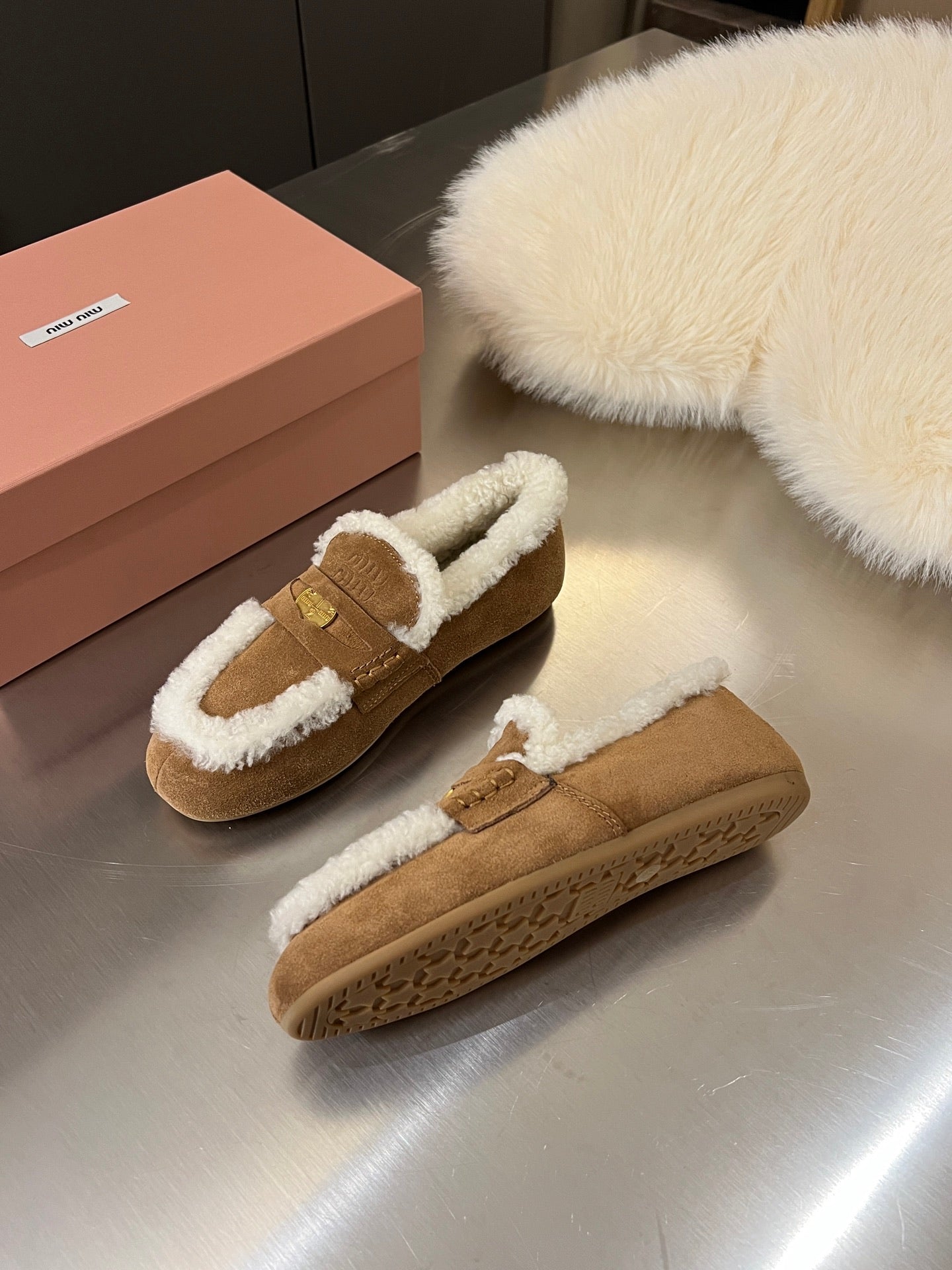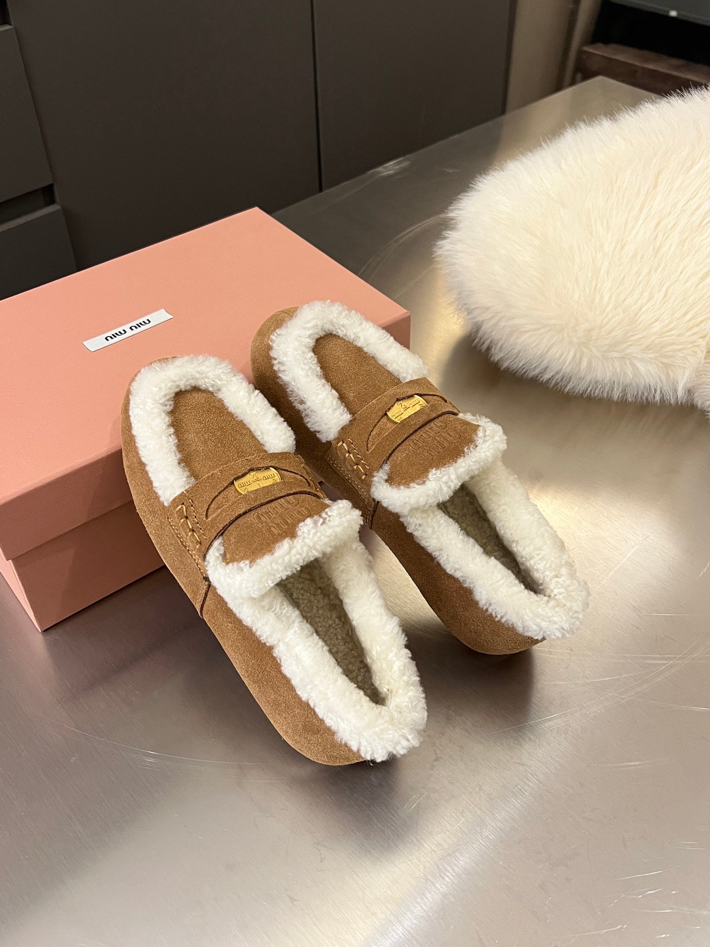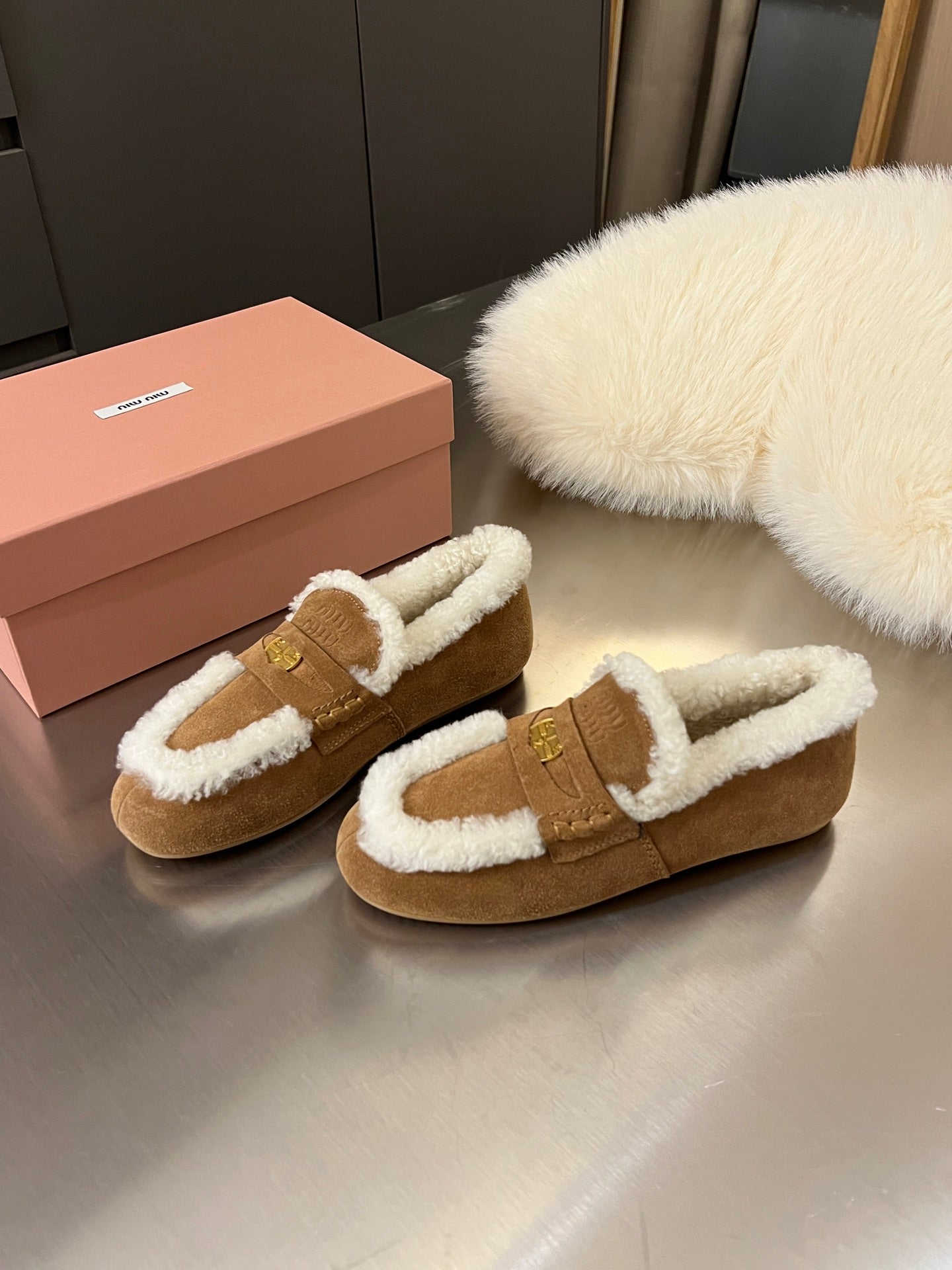 Miu Logo-Embossed Loafer Deep Neutral Suede Shearling 455916