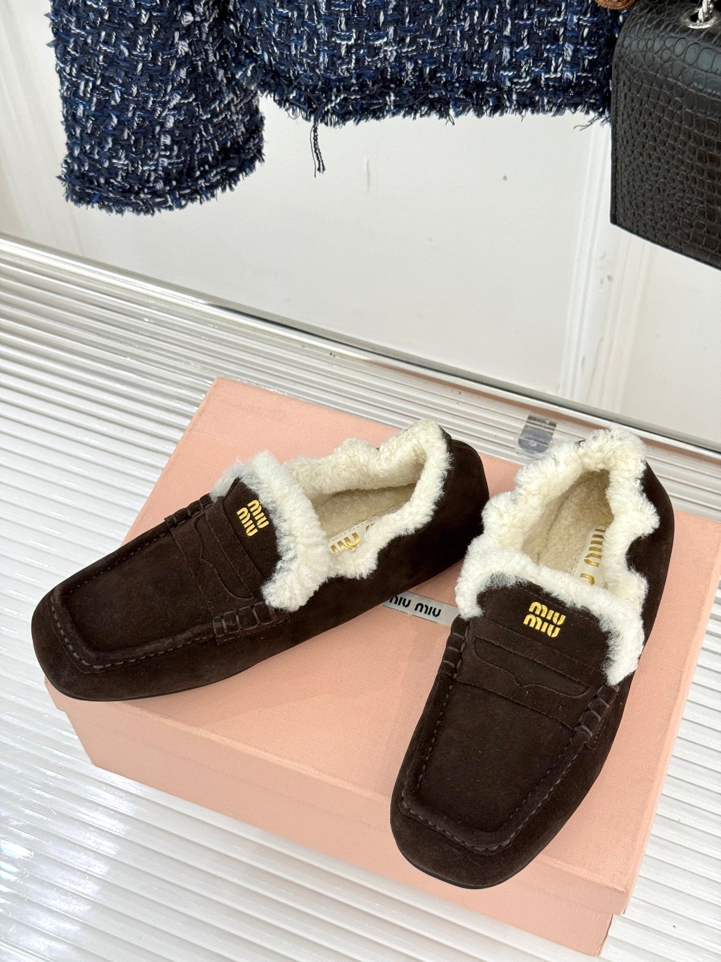 Miu Logo-Embossed Loafer Dark Brown Suede Shearling 455918