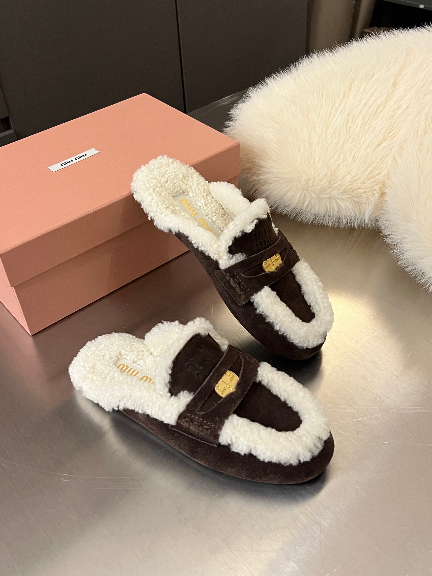 Miu Logo-Embossed Slippers Deep Neutral Suede Shearling 455920