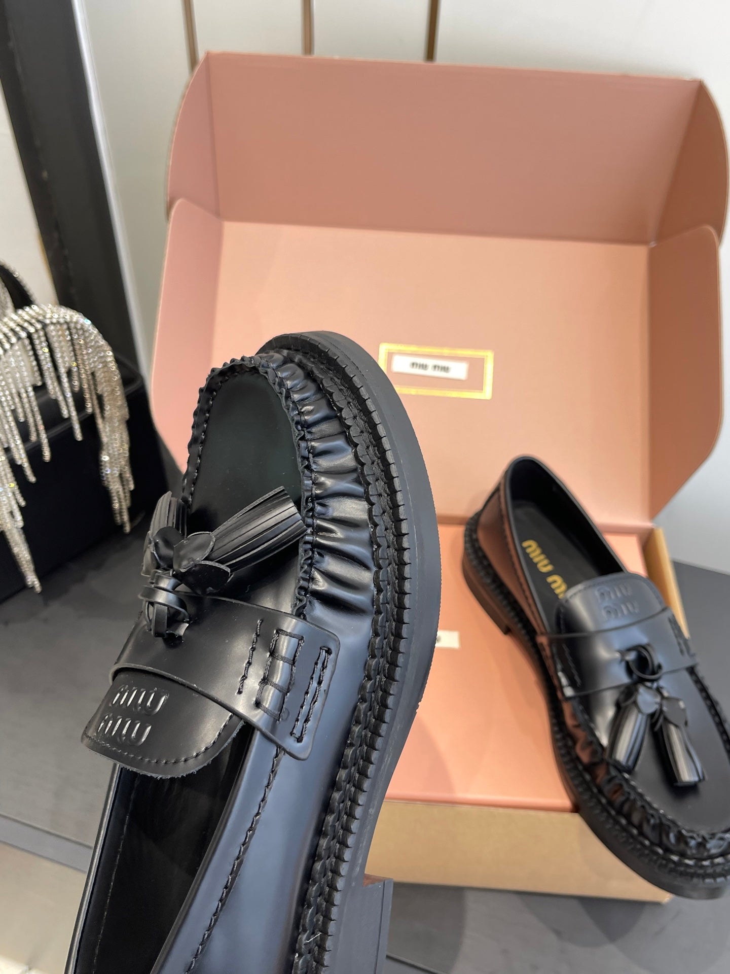 Miu Tassel Loafers Black Polished Leather 490950