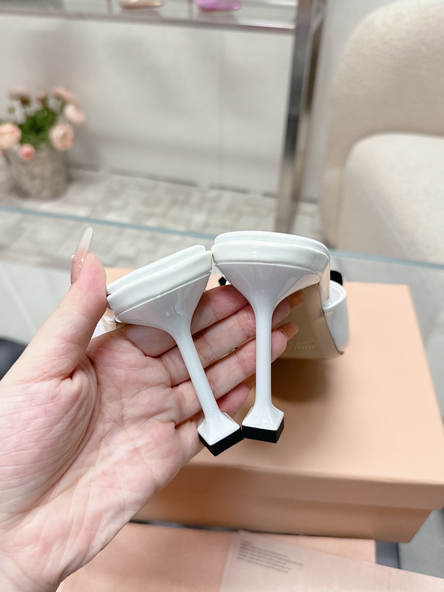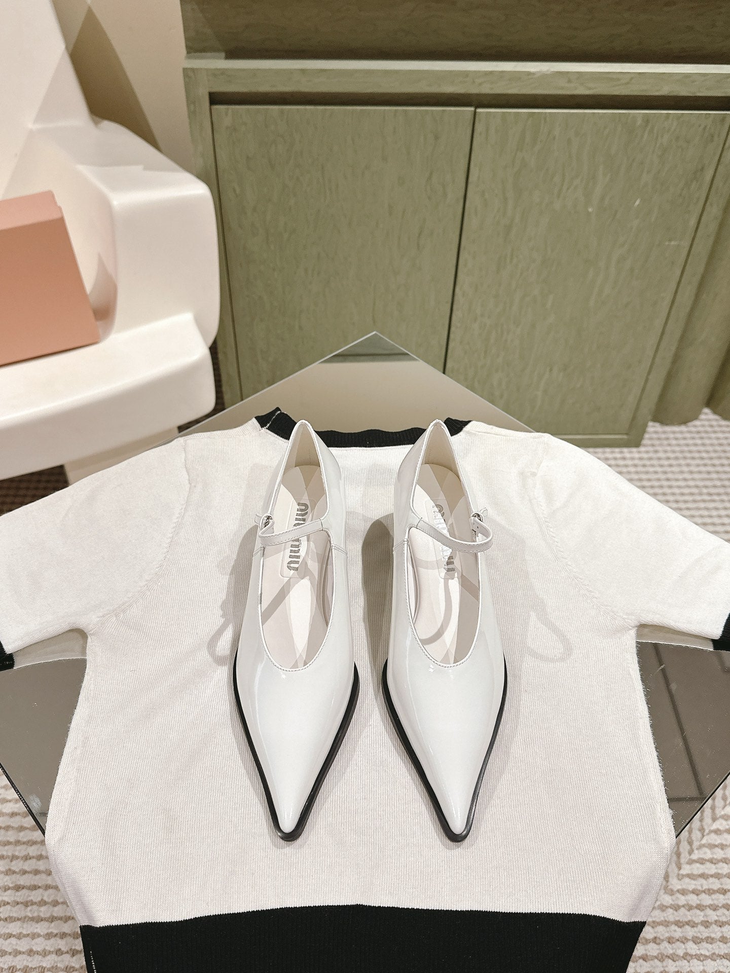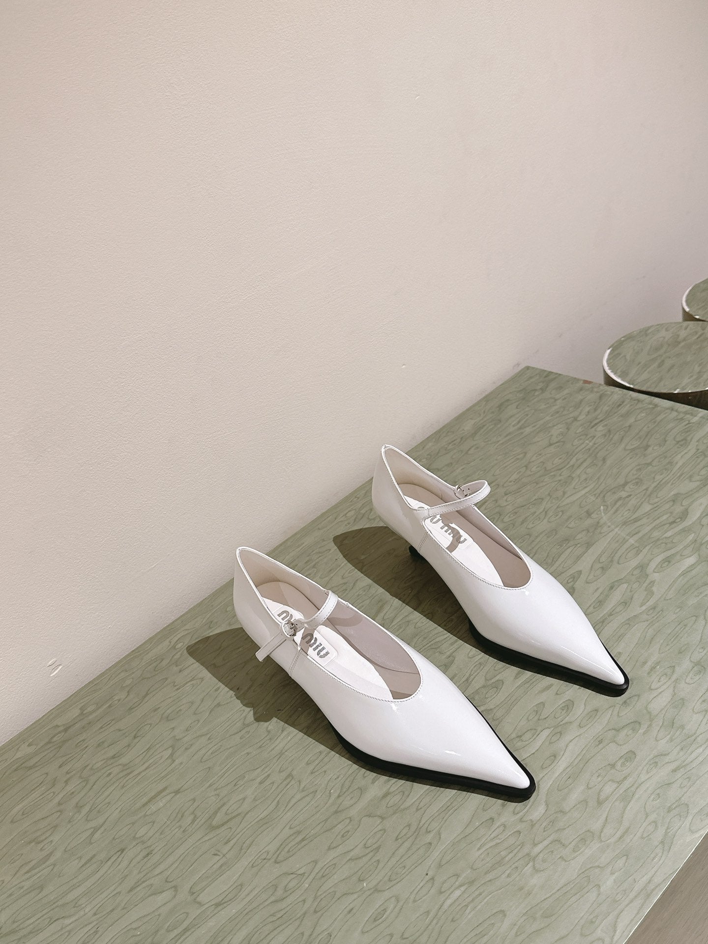 Miu×𝐵𝑎𝑙𝑎𝑛𝑐 Singback 55mm White Patent Leather 445534