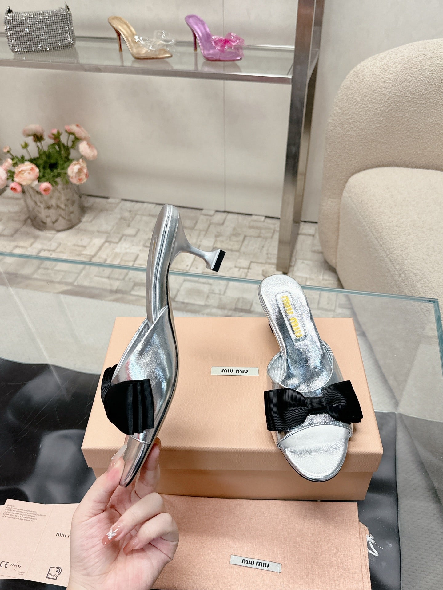 Miu Mordoré Black Bows Mules 70mm Sliver Cowhide 445513