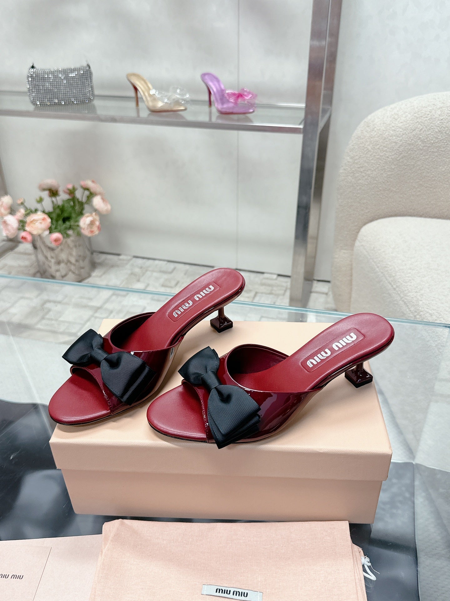 Miu Mordoré Black Bows Mules 50mm Burgundy Cowhide 445520