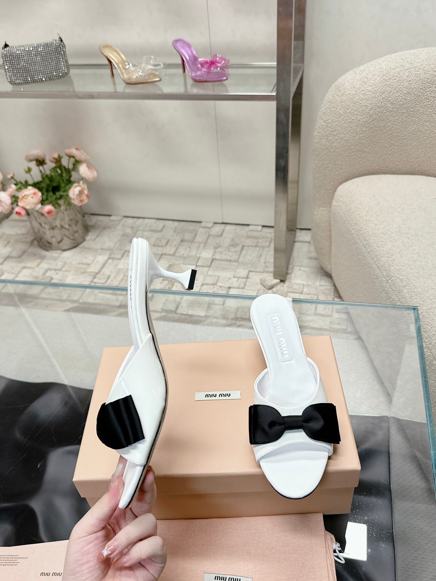 Miu Mordoré Black Bows Mules 50mm White Cowhide 445522