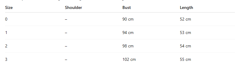 - Size : 0,1,2,3