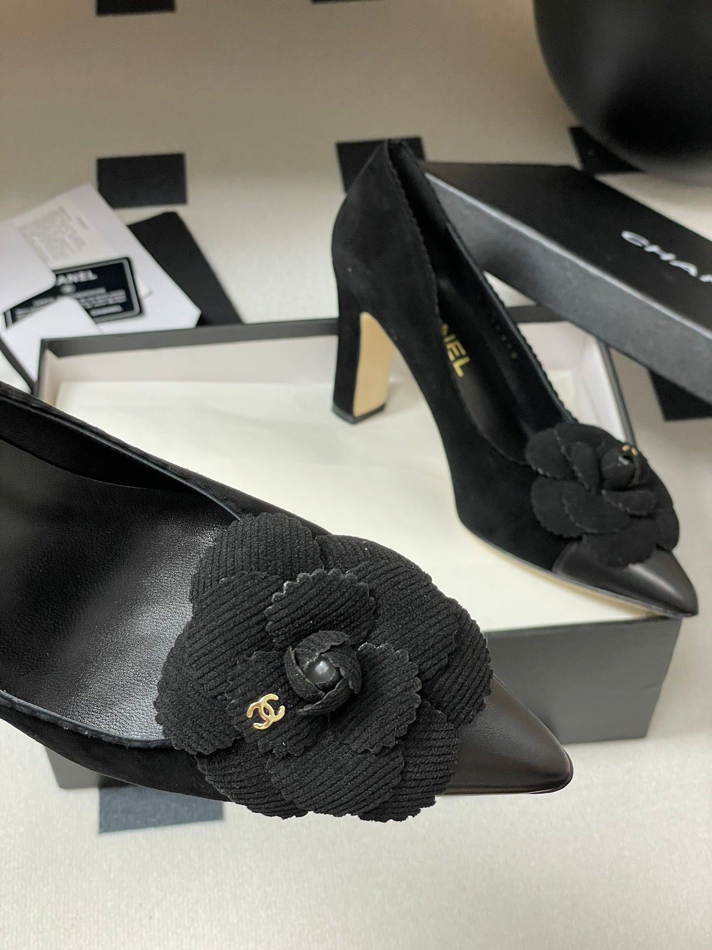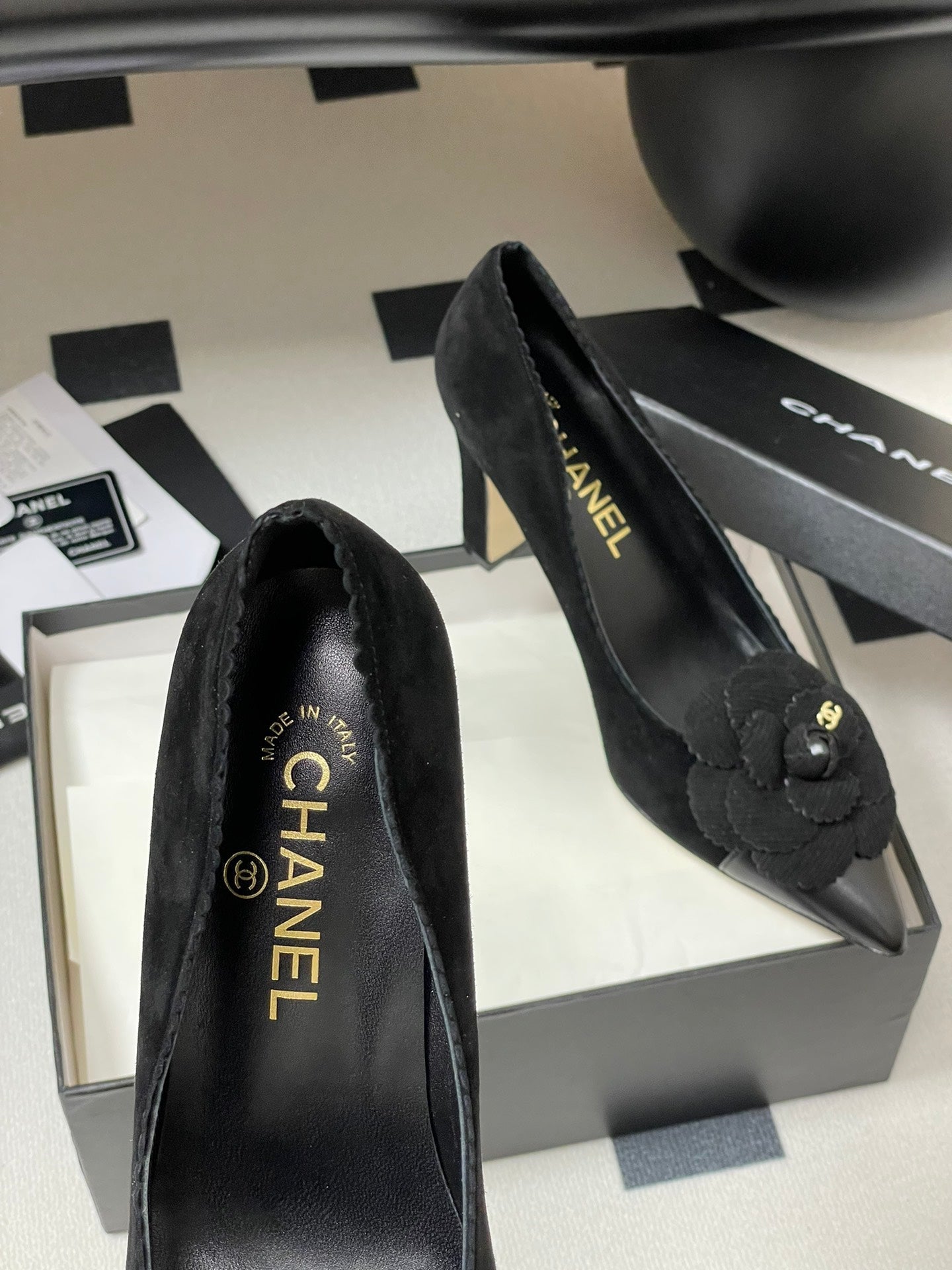 CC 25C Classic Camellia Pointed High Heels Pump 85mm Black Suede 247617