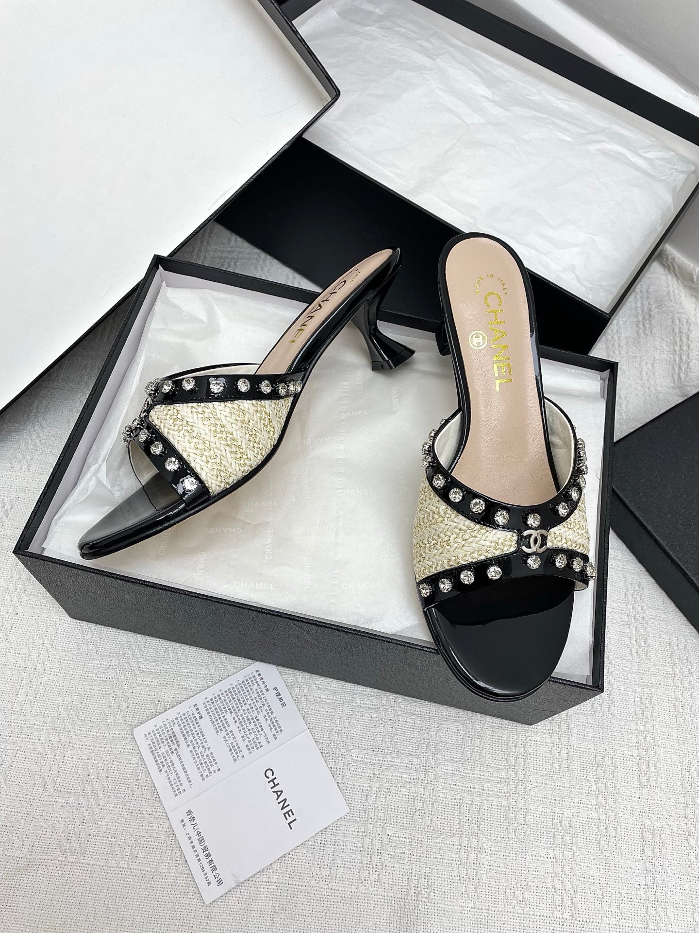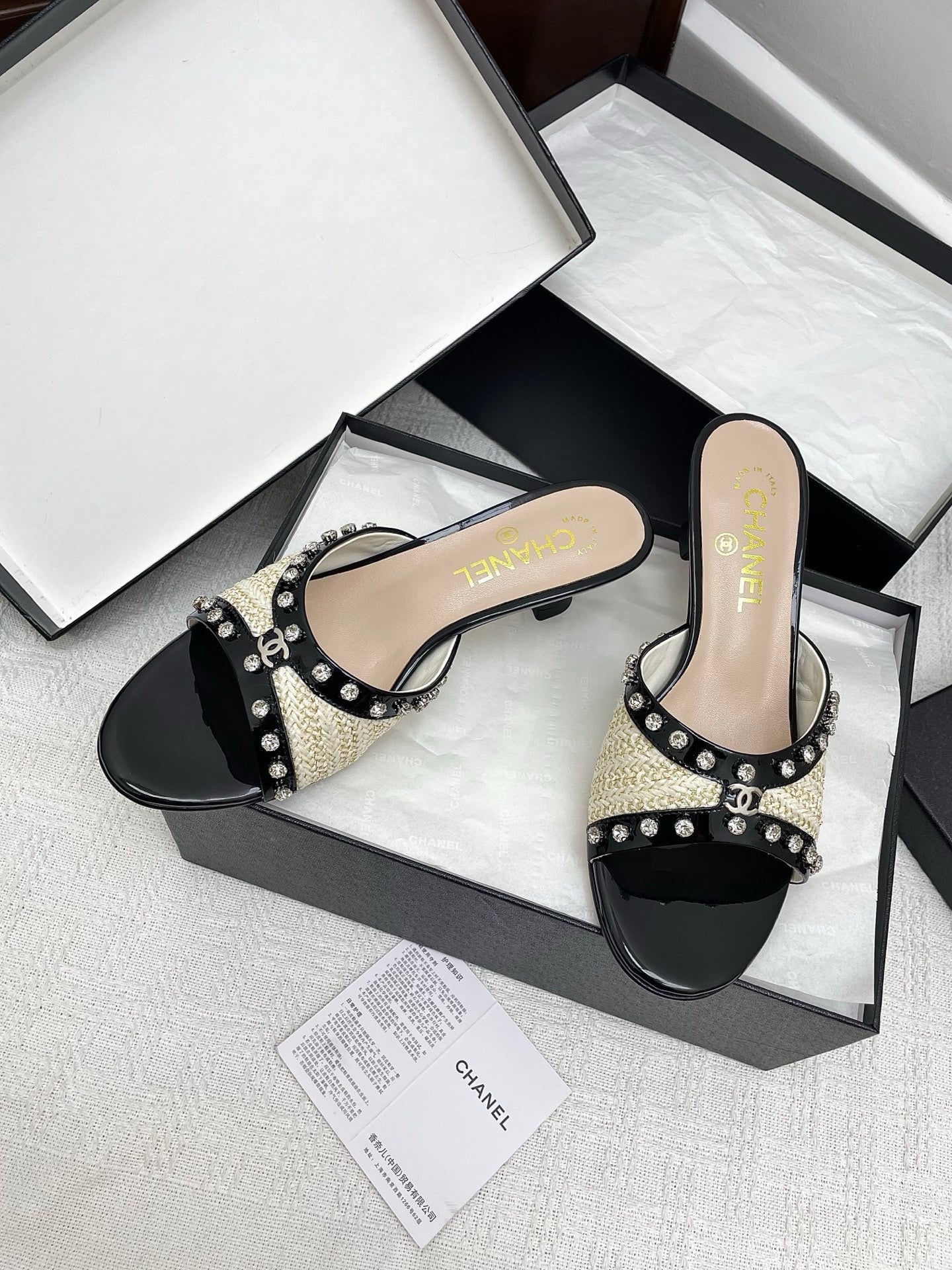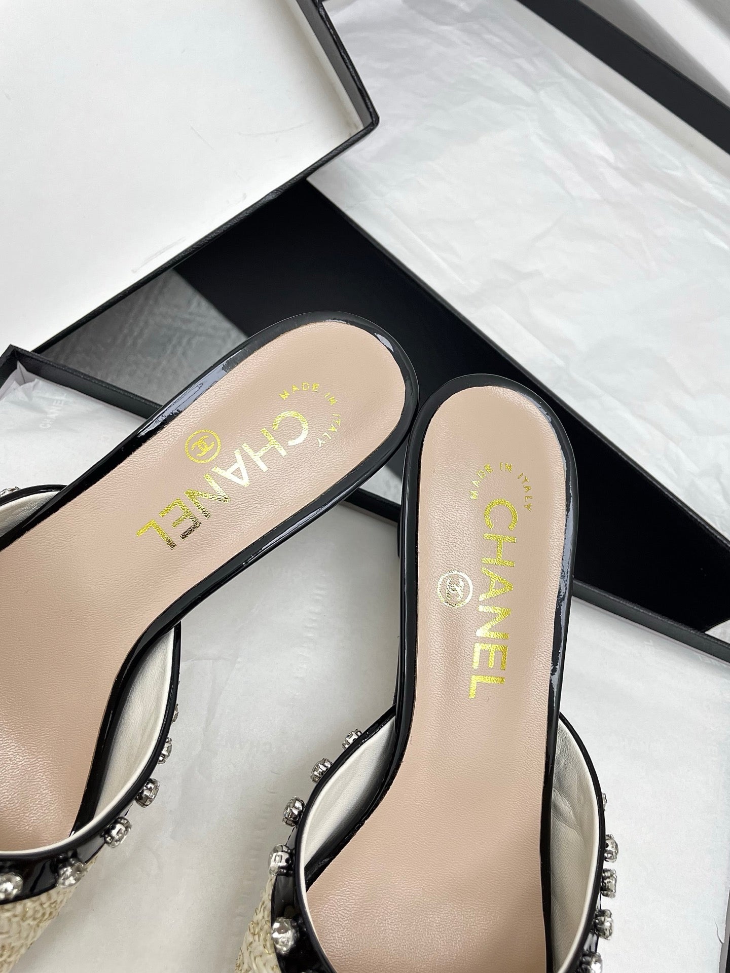 CC 25SS Slippers 5cm Light Yellow Raffia Black Patent Calfskin 338299