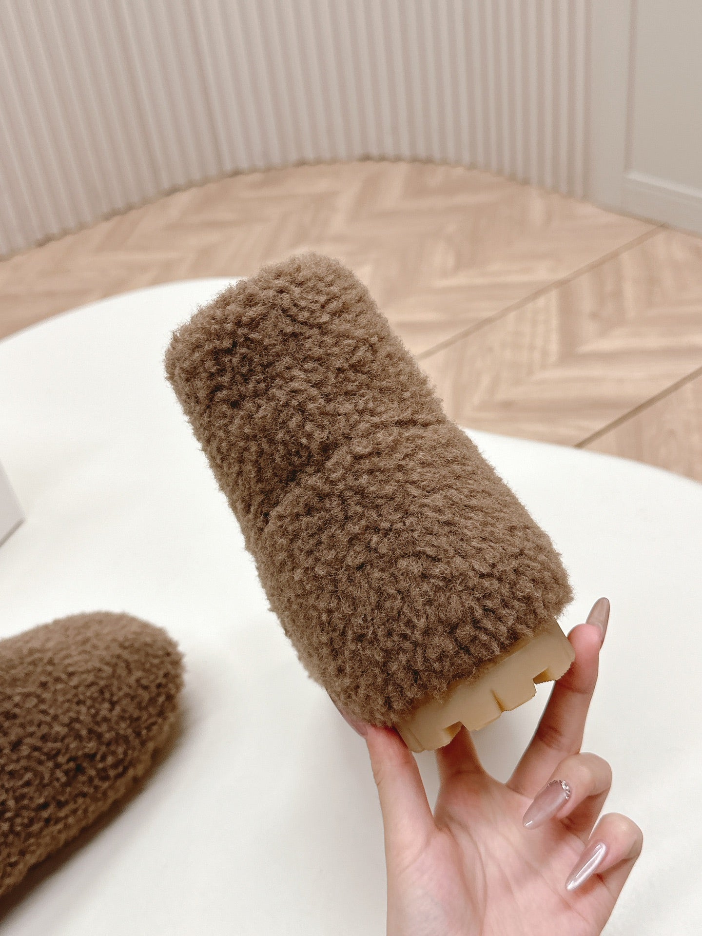 MULES ATTACHED TRIANGLE LOGO IN WOOD BROWN SHEARLING