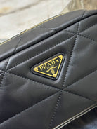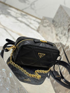 CAMERA BAG 22 IN BLACK TRIANGLE PATTERN QUILTED LAMBSKIN GOLD HARDWARE