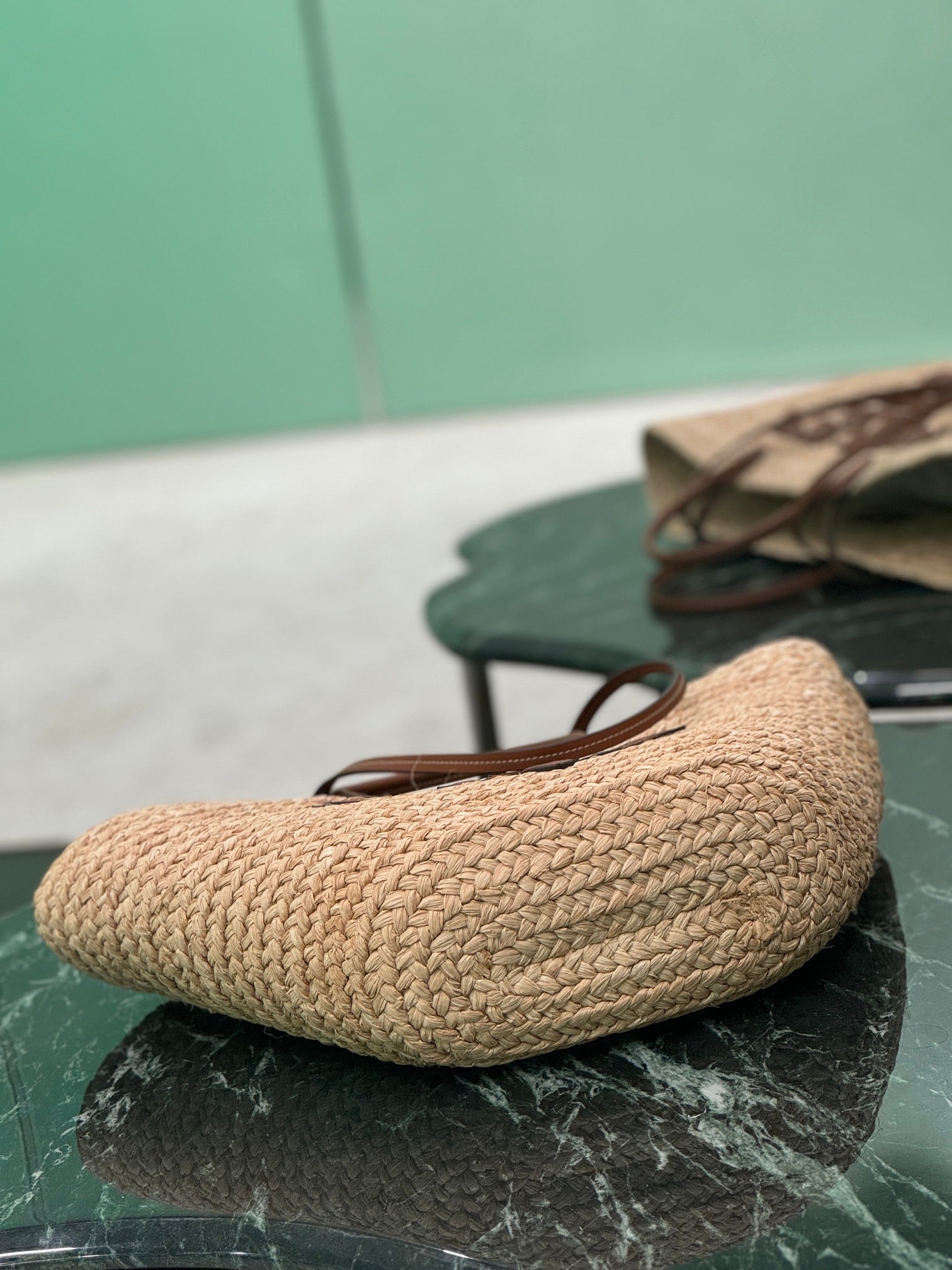• Material: Raffia grass and calfskin trim