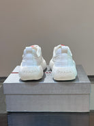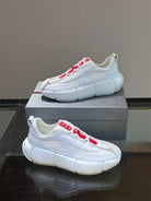 Material: Cowhide Upper with Breathable Mesh Panels, Soft and Comfortable, Breathable Tongue Decorated with PRADA Brand Letter Logo, Rubber Thick Sole with Red Tag Tongue Echo