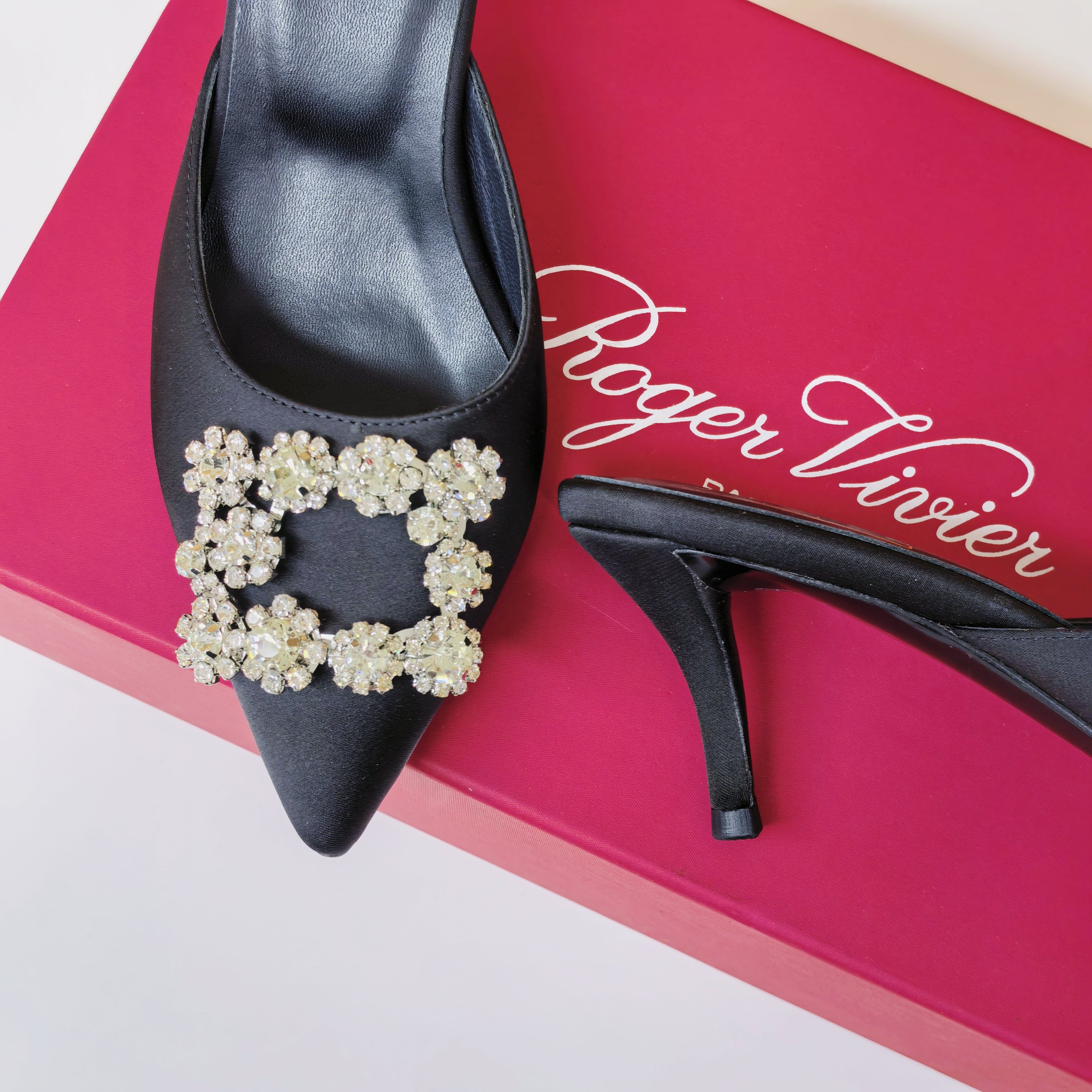 Viv 25 Crystal Diamond Buckle Flats Black Silk Satin 235396
