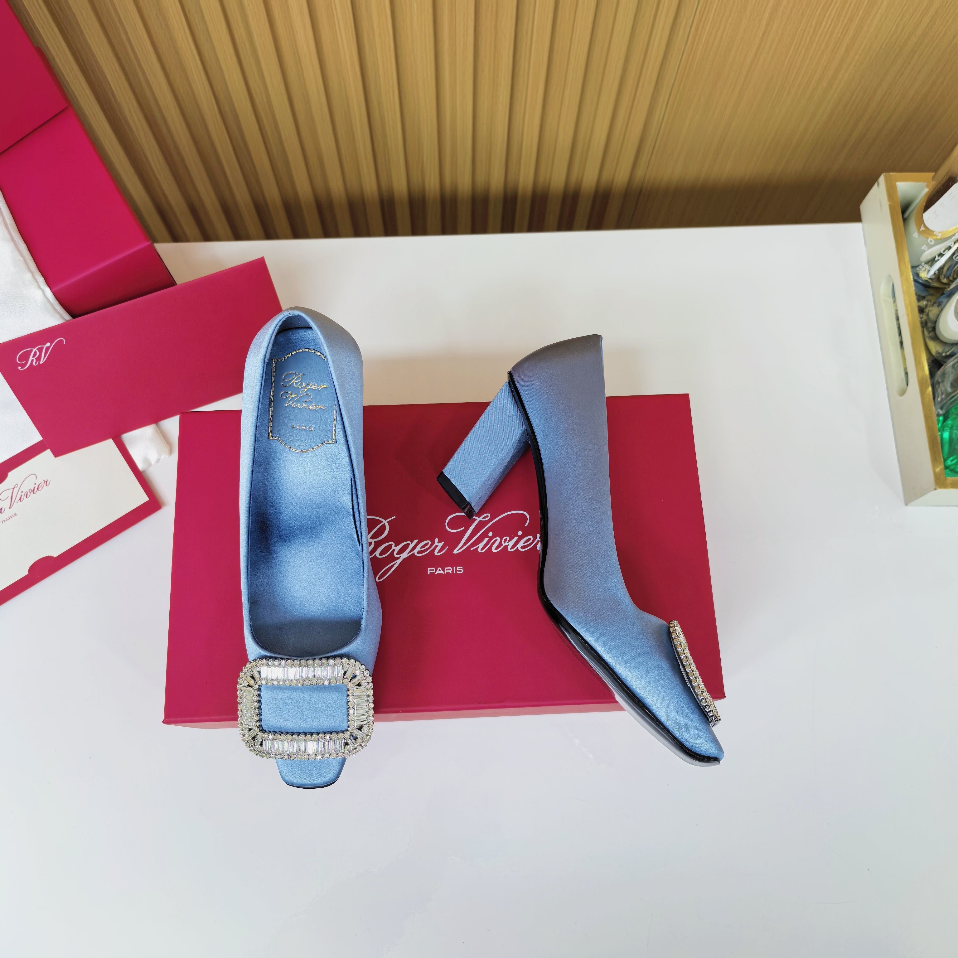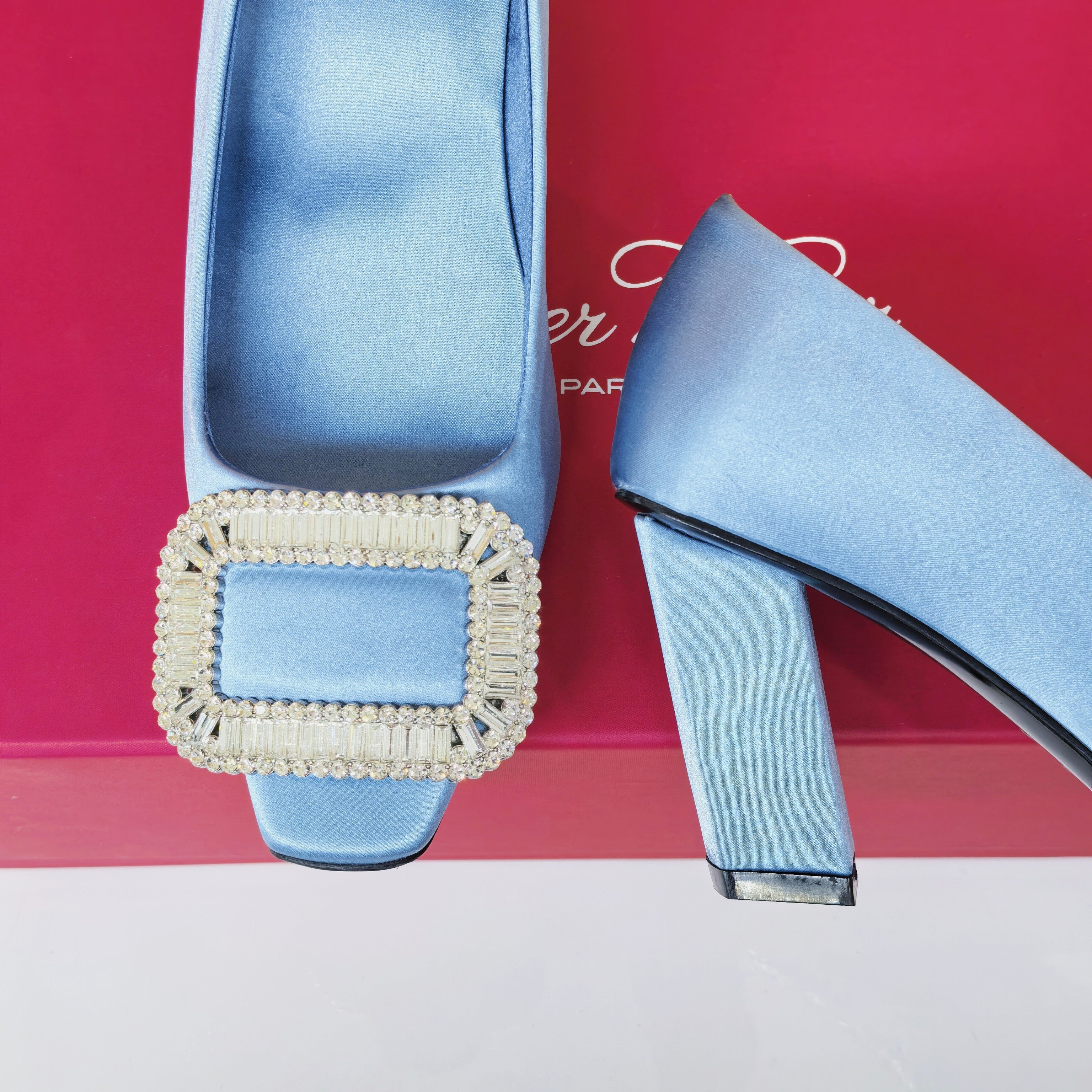 Viv 25 Crystal Diamond Buckle Flats Blue Silk Satin 235394