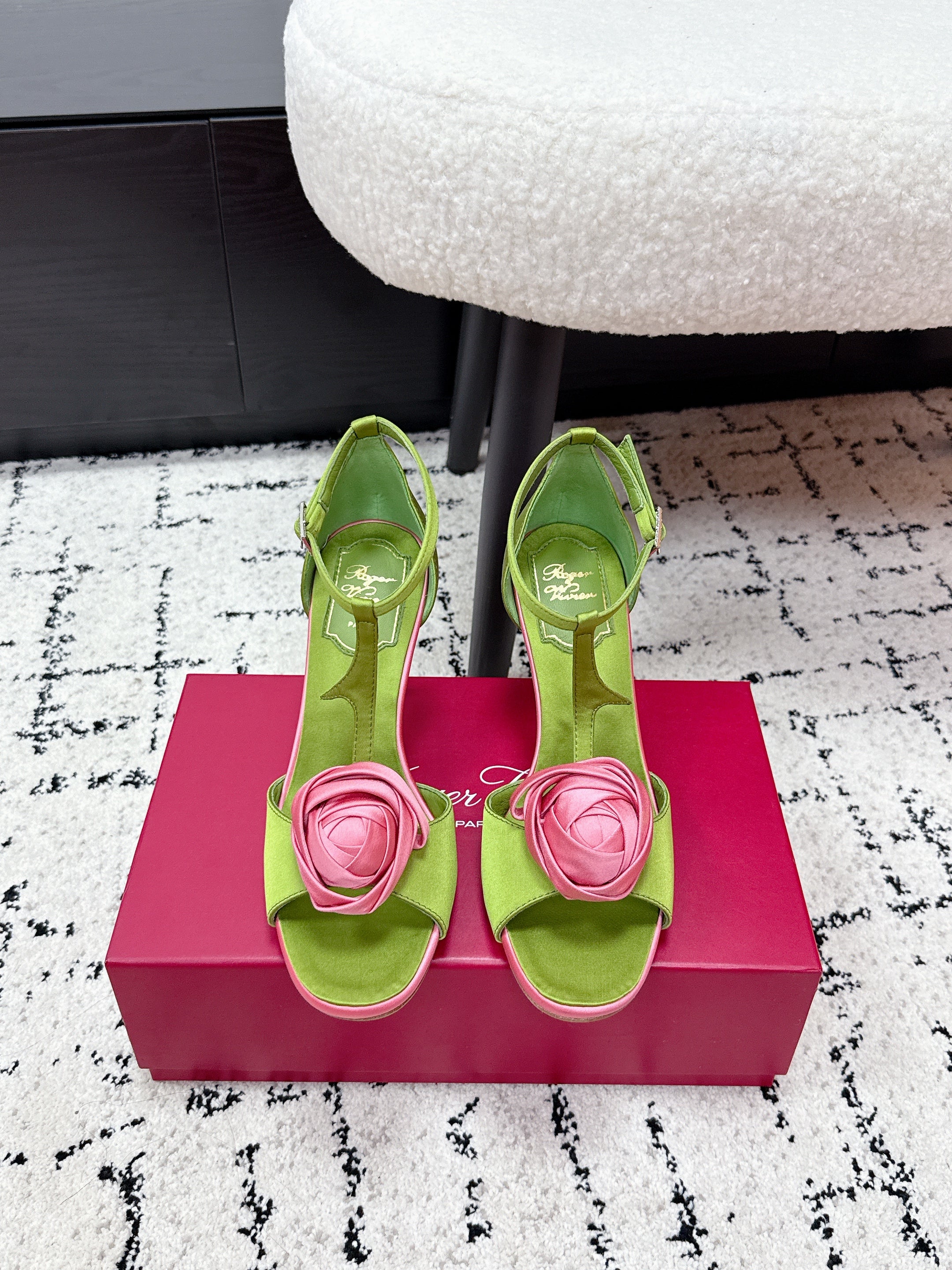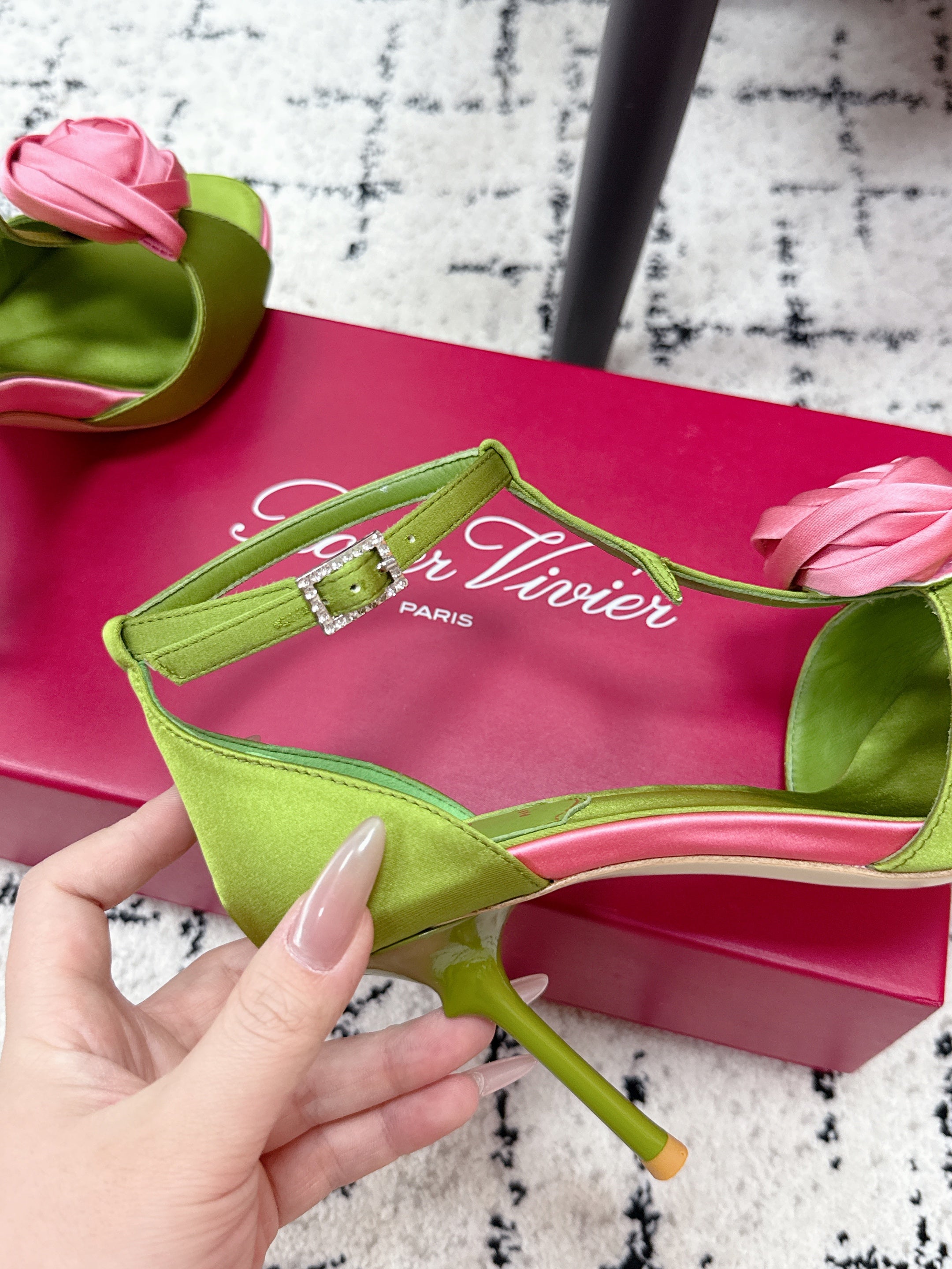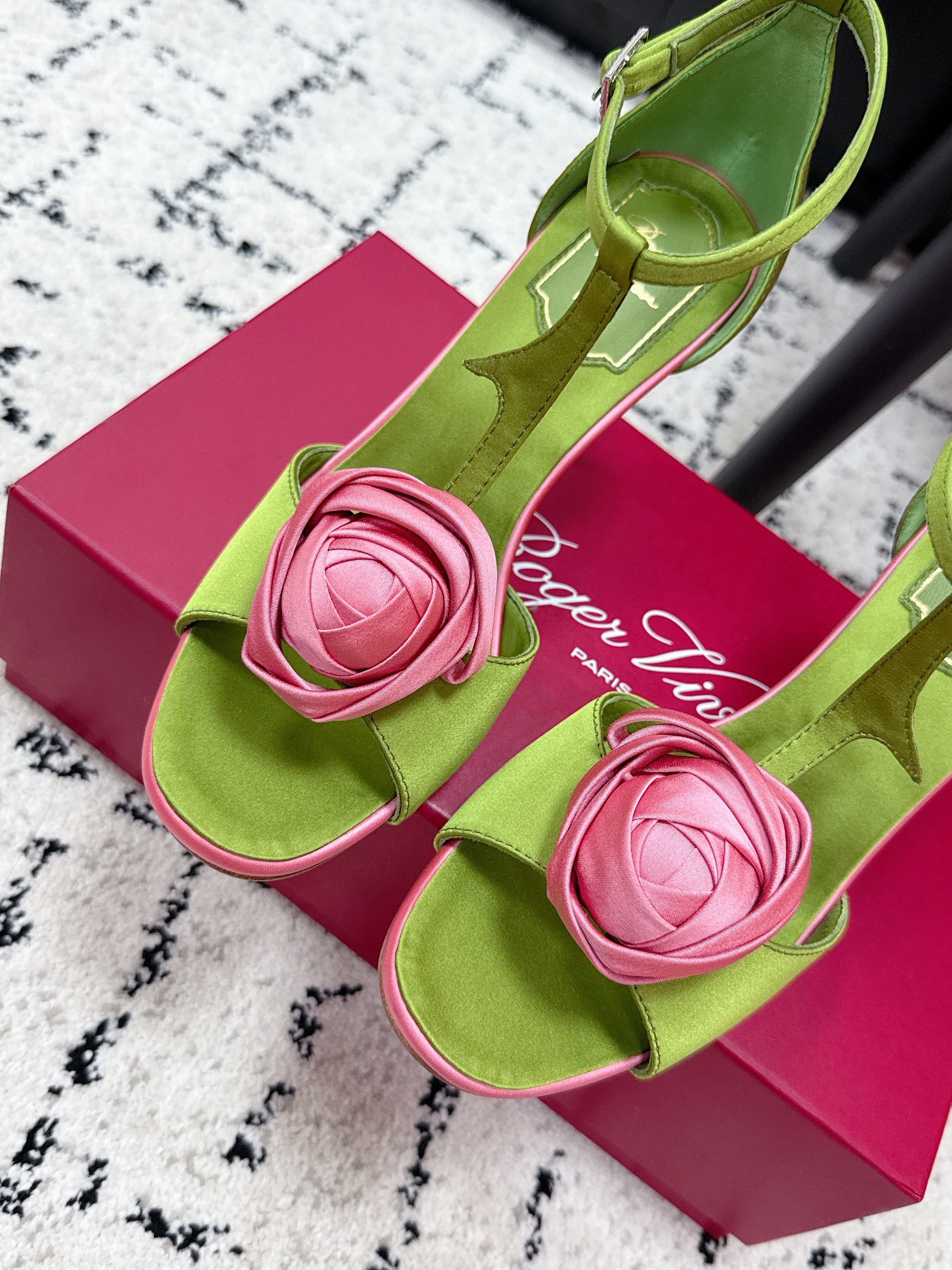 RV Rose Vivier Flower Sandal 10cm Pink Green Satin 617302