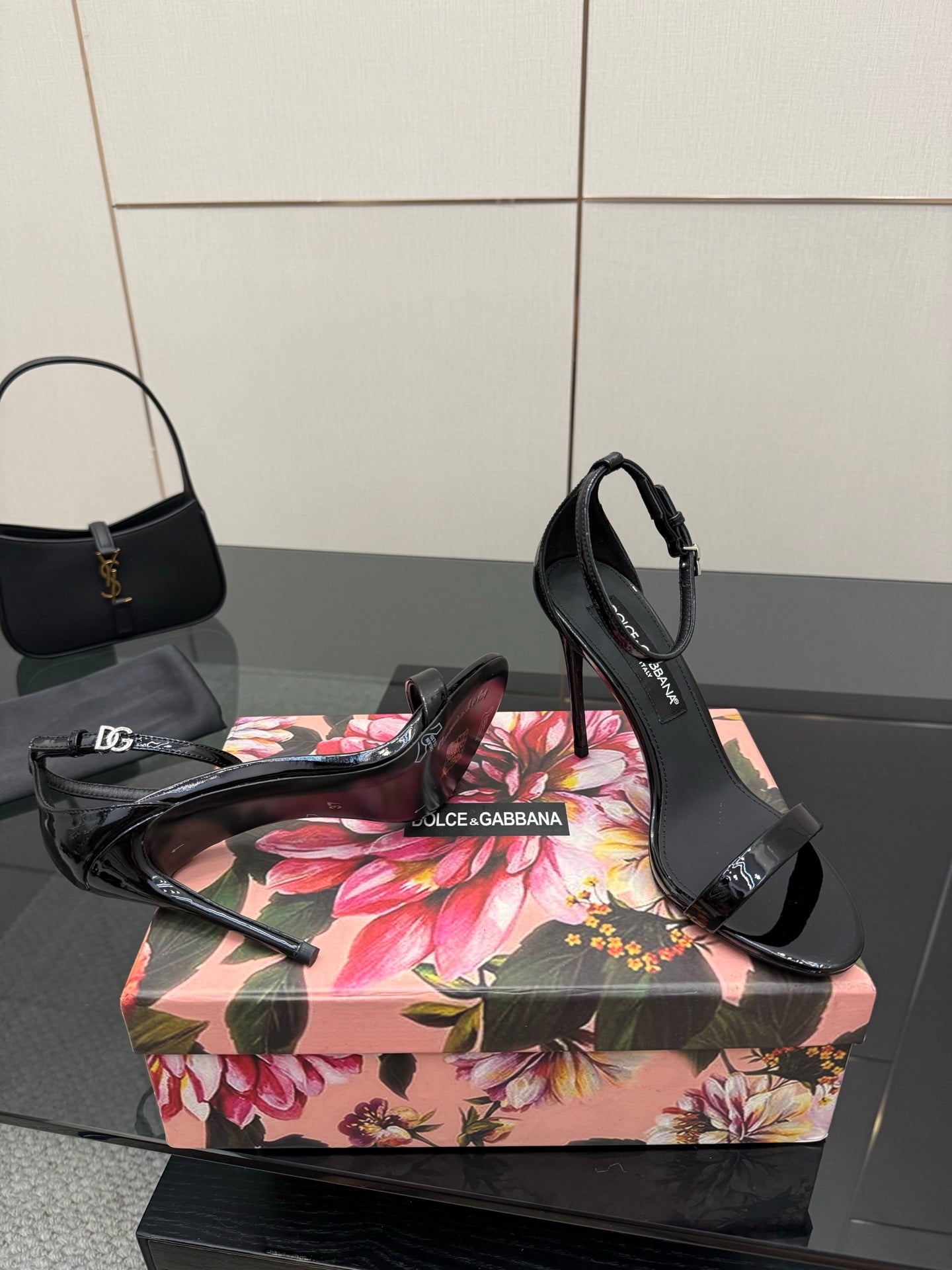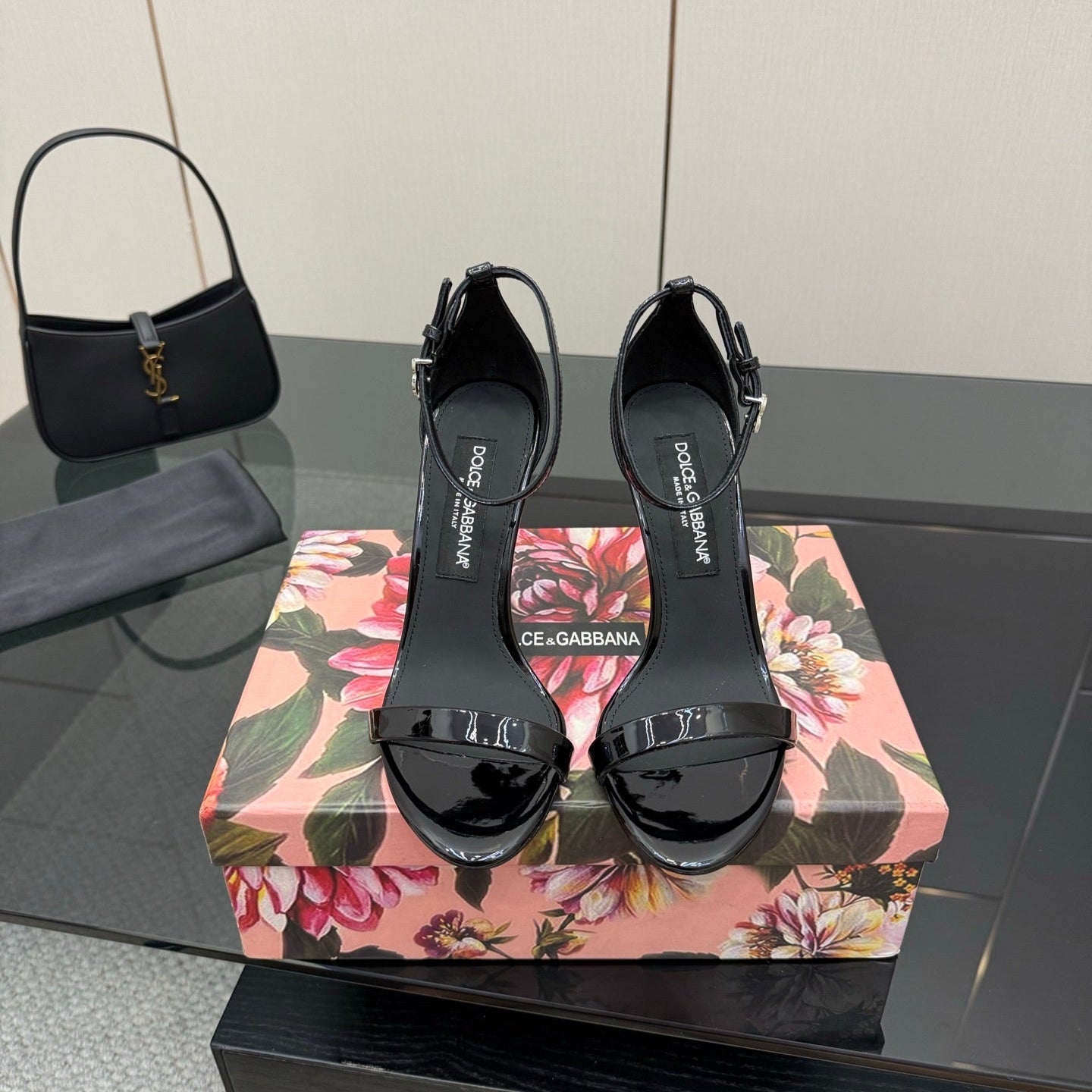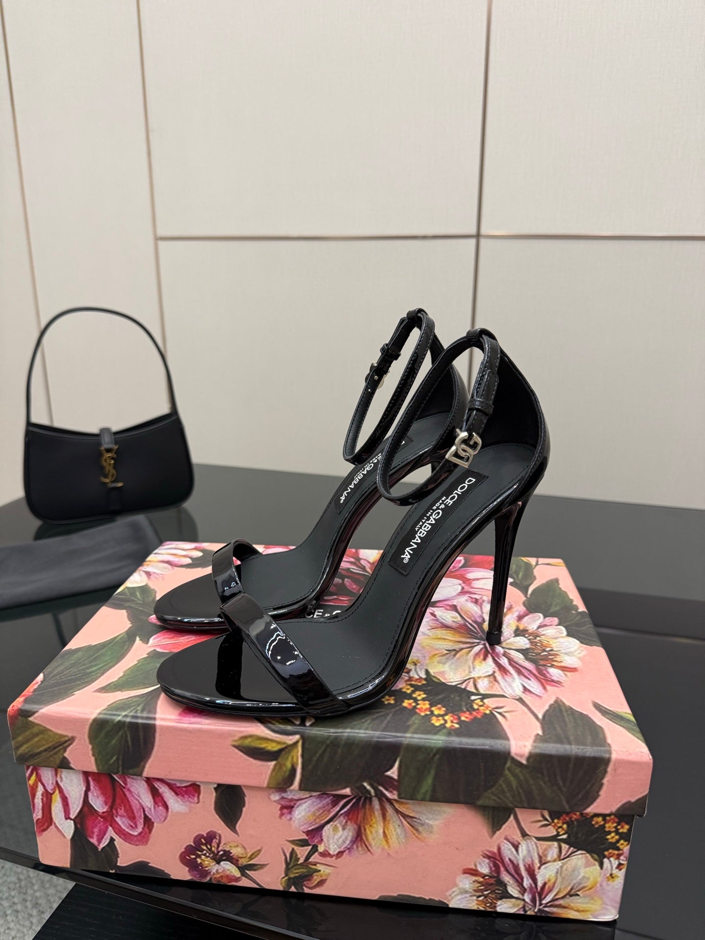 DC 25 Buckled High-Heeled Sandals Black Patent Leather & Sheepskin 326383