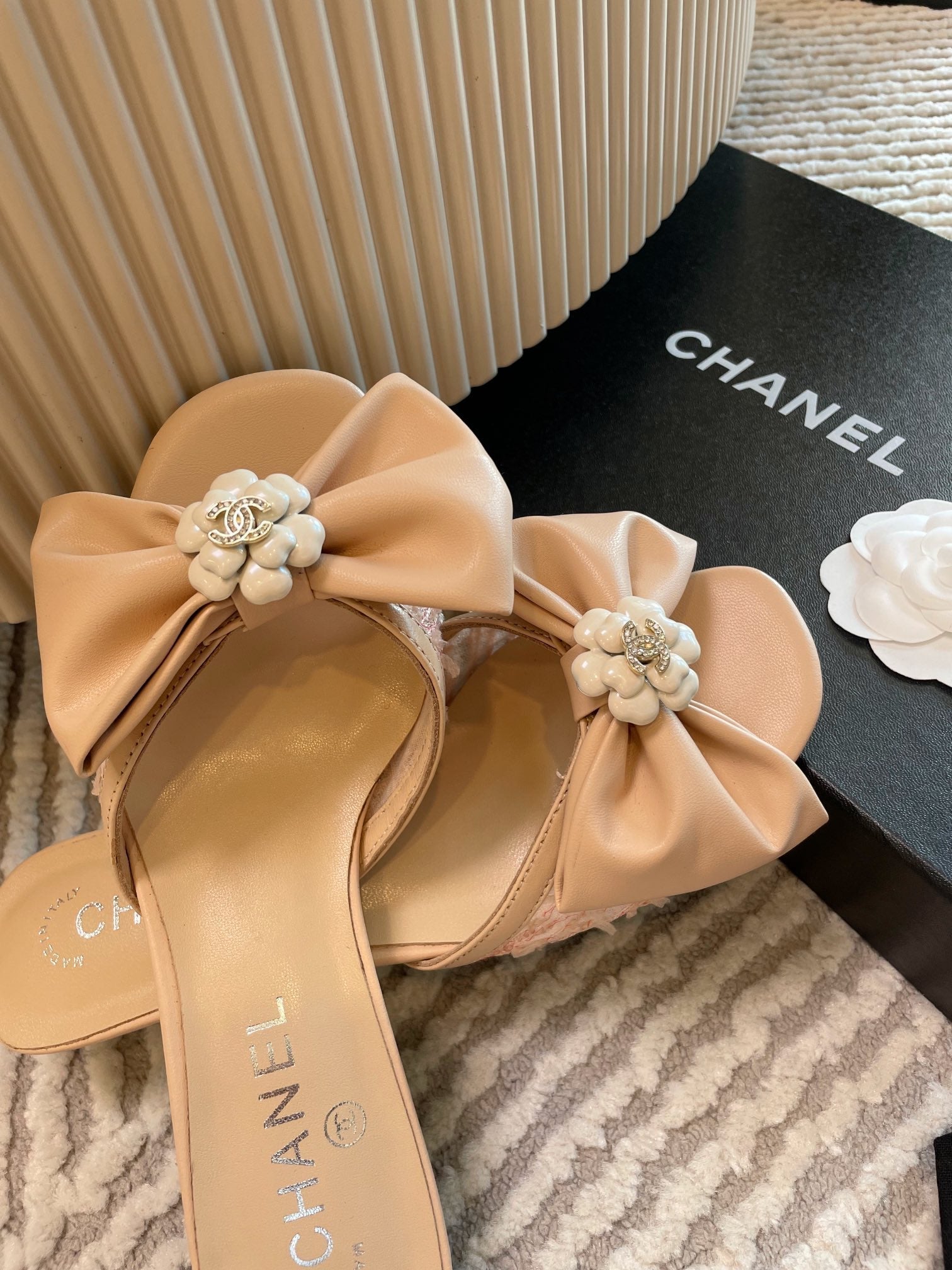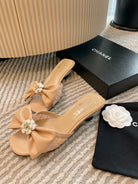 mule sandal bow flower beige calfskin