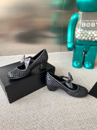 CC MARY JANES SHOES IN STEEL GRAY SATIN WITH BLACK RHINESTONES