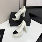 Chanel 25 Platform Thick Heel Shoe White Black Sheepskin