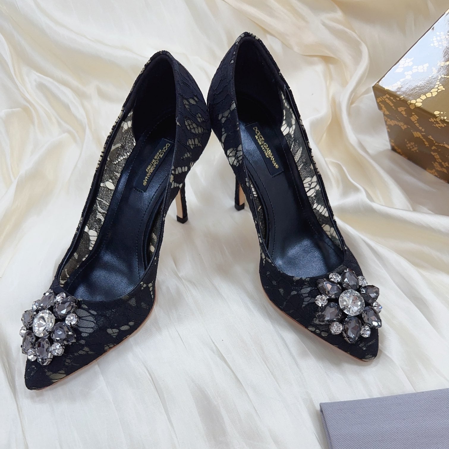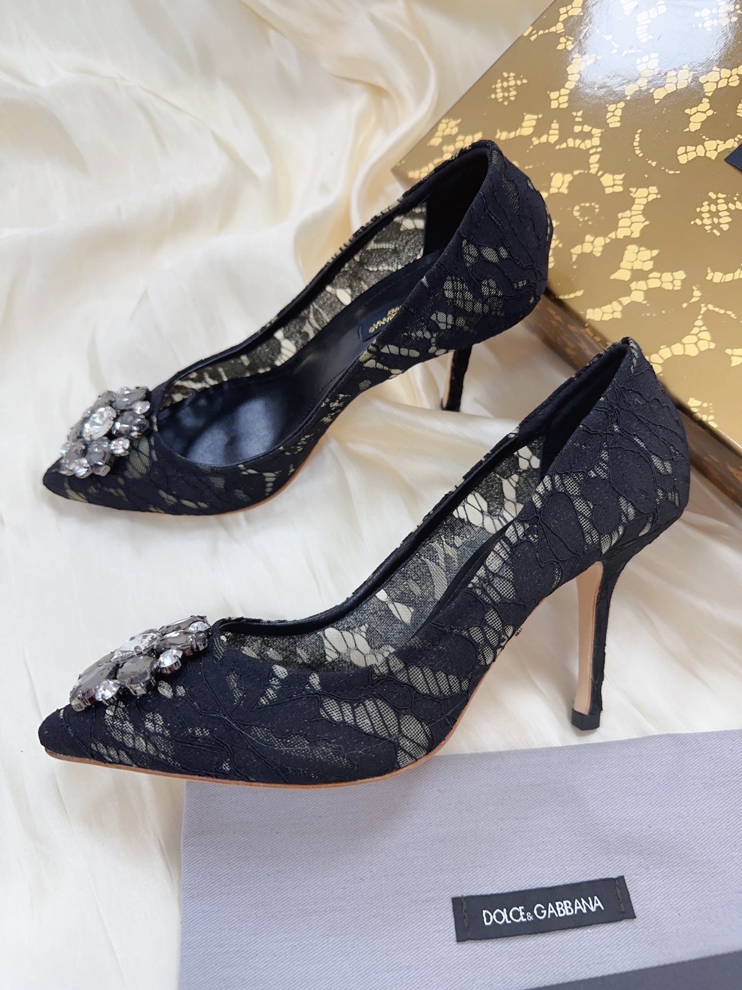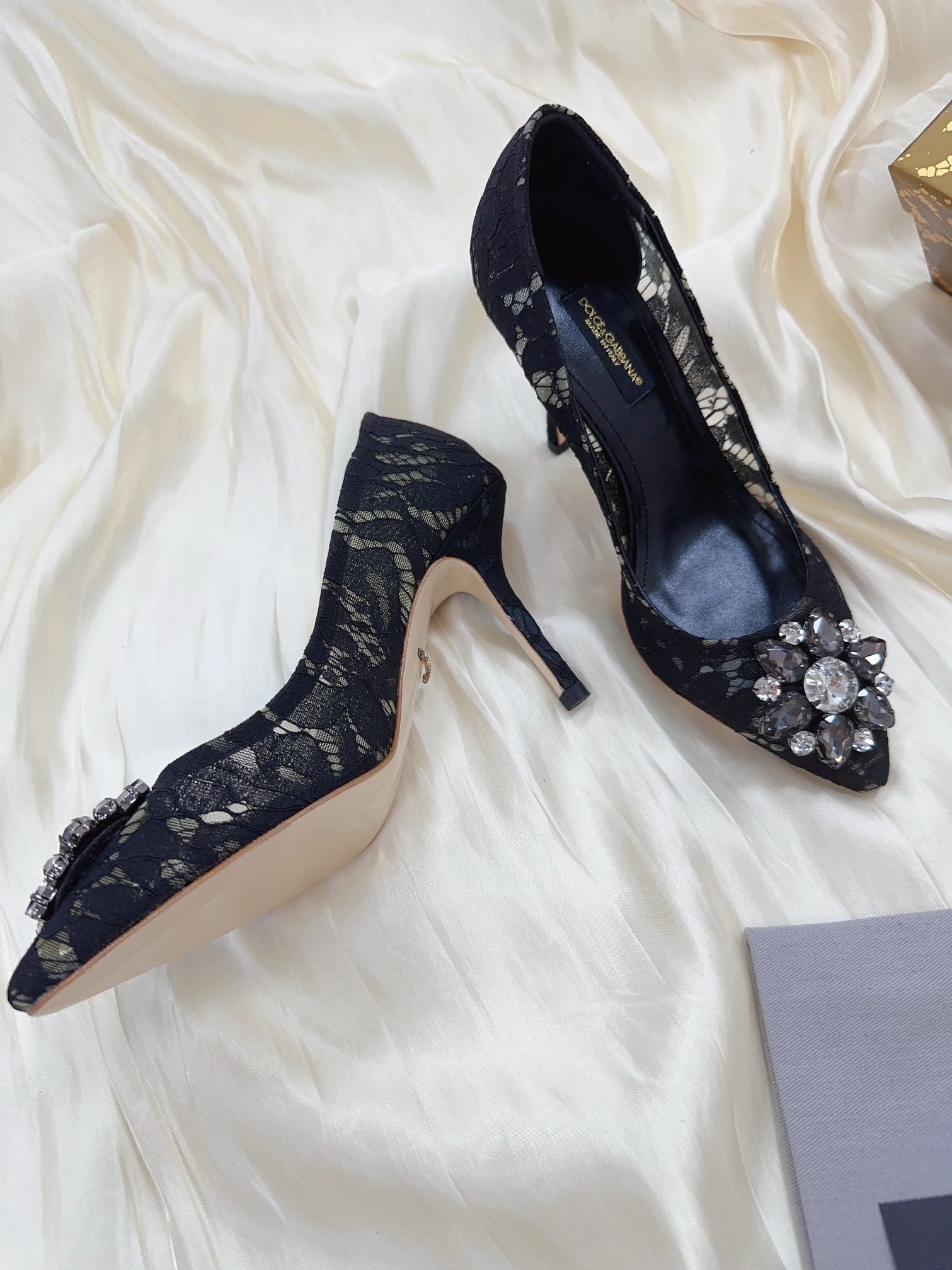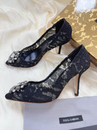 DC Floral Crystal Pumps Black Genuine Leather & Lace 324775