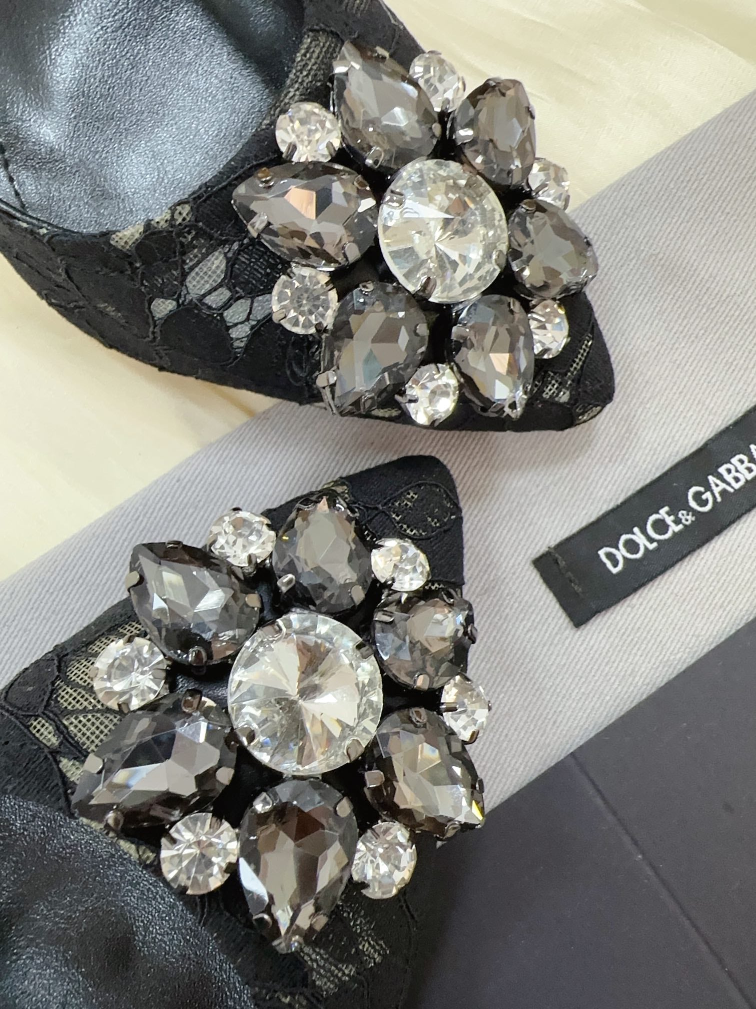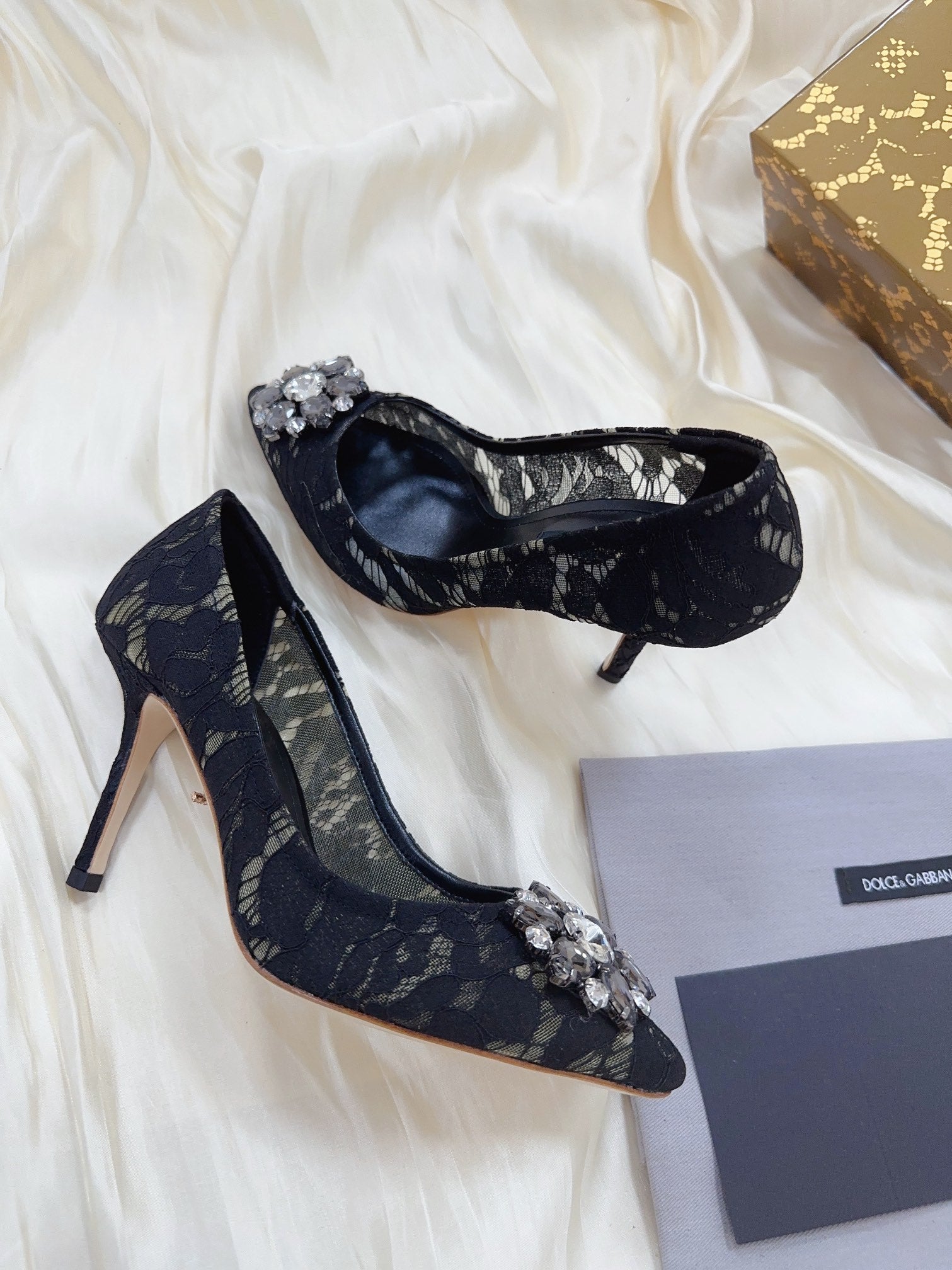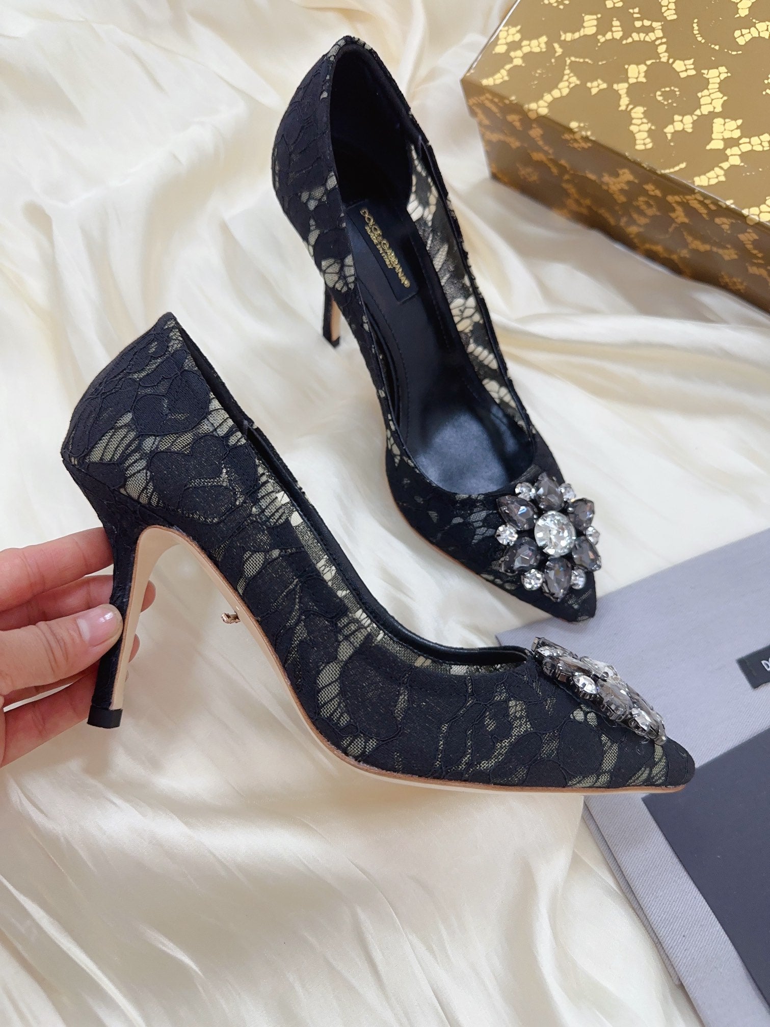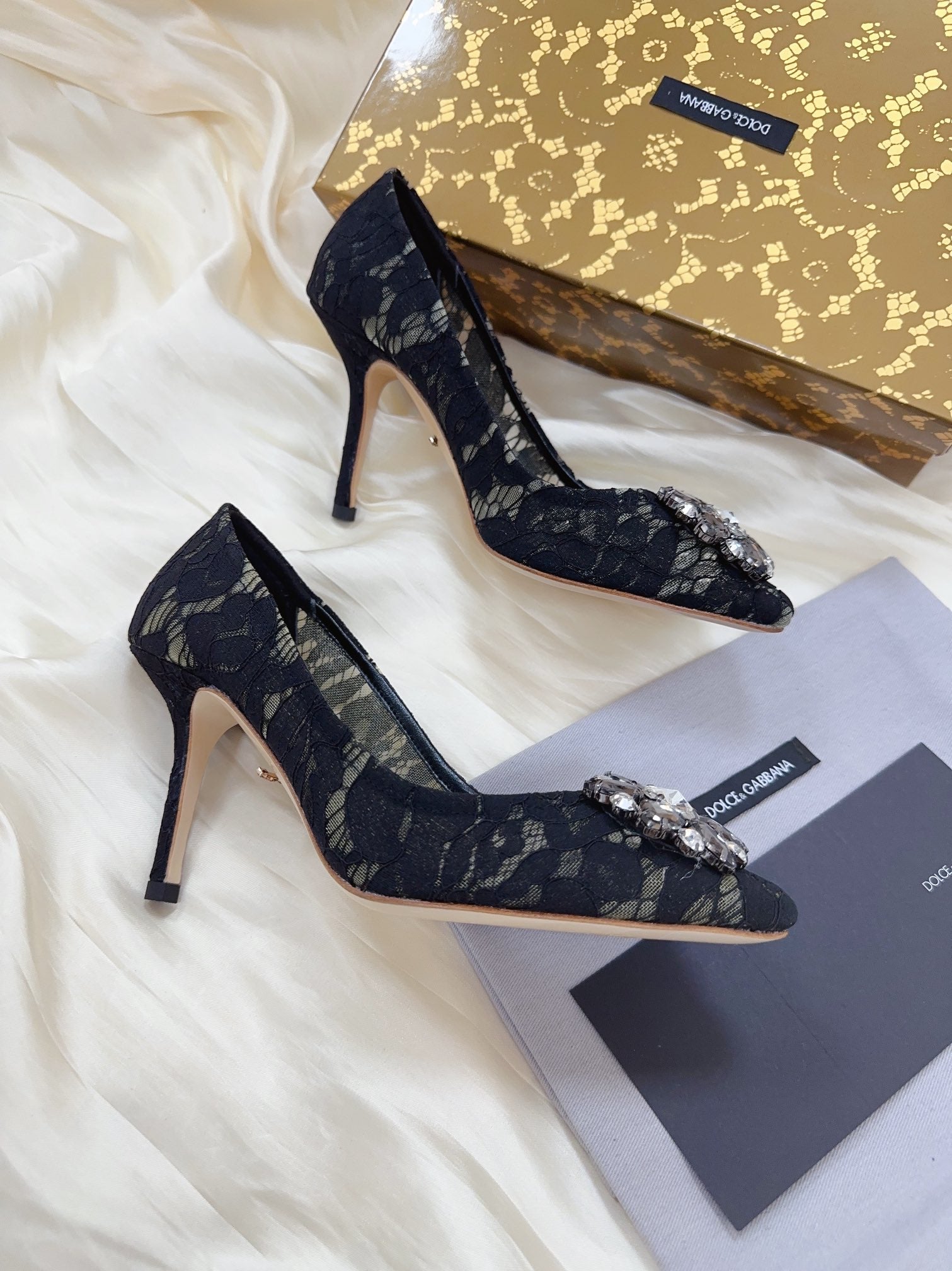DC Floral Crystal Pumps Black Genuine Leather & Lace 324775