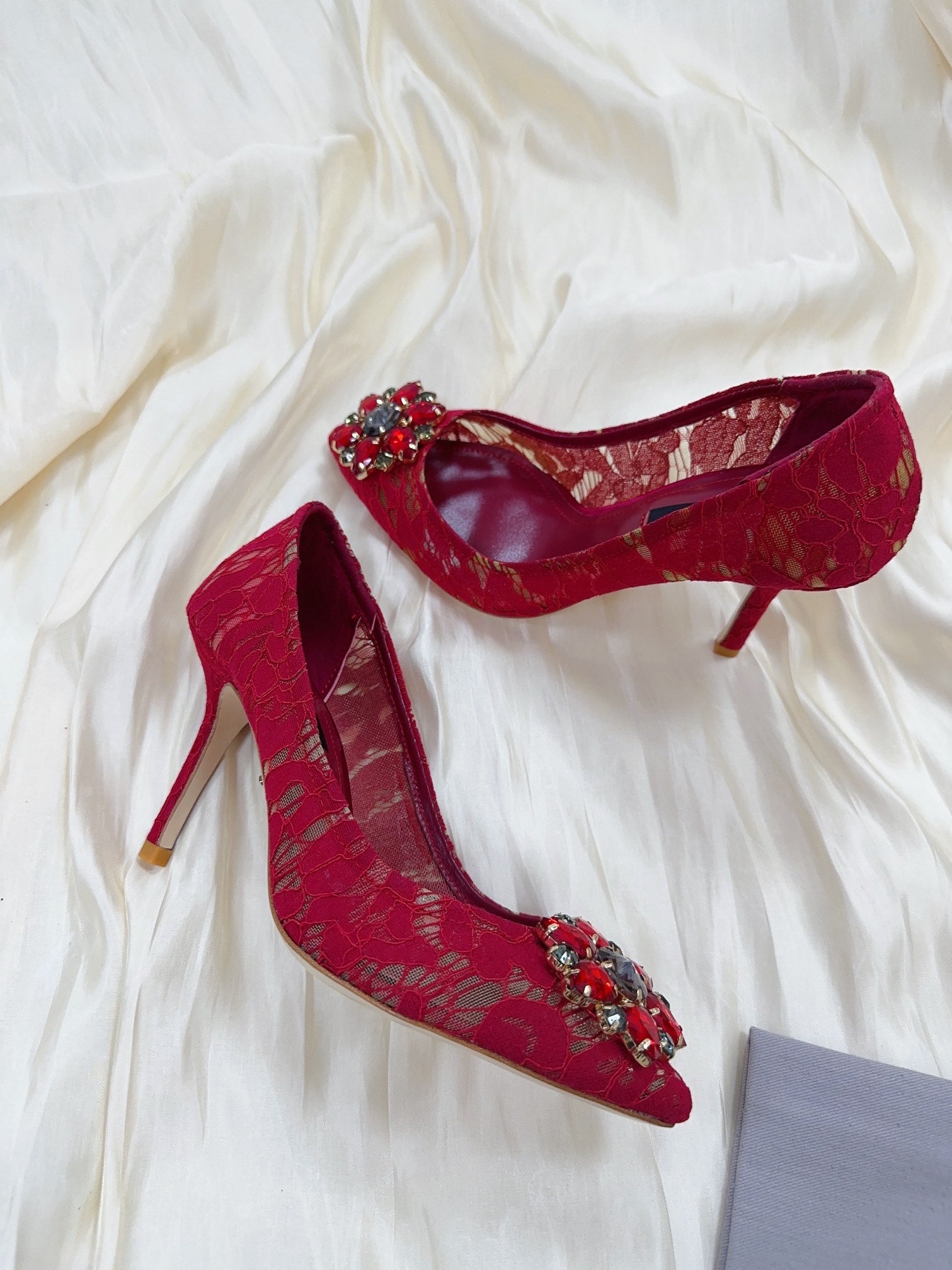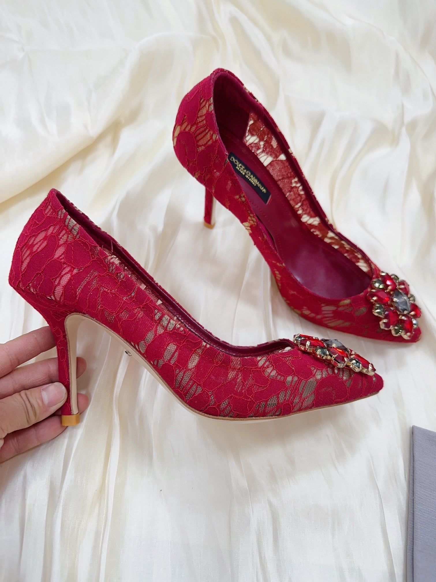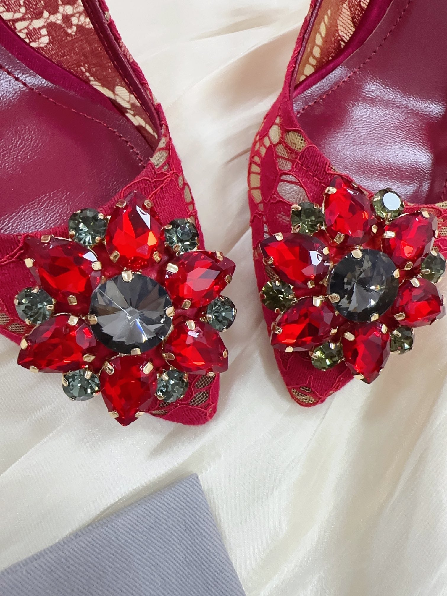 DC Floral Crystal Pumps Red Genuine Leather & Lace 324771