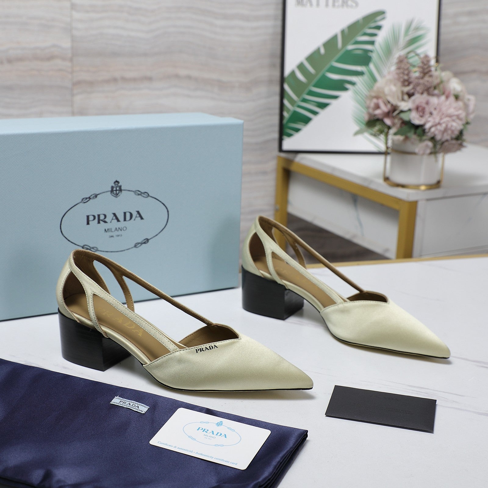 Prada Cutout Satin Pointy-Toe Pump 50mm Off-White Satin 456275