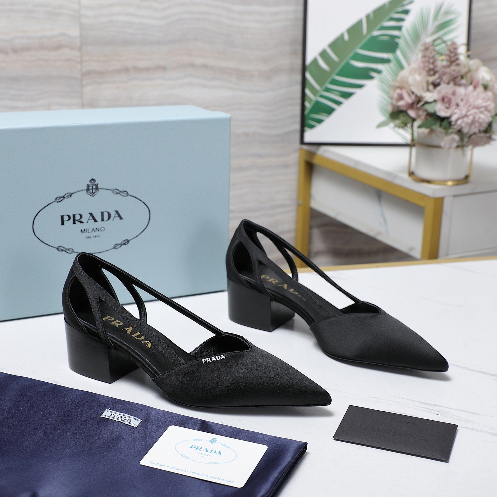 Prada Cutout Satin Pointy-Toe Pump 50mm Black Satin 456276
