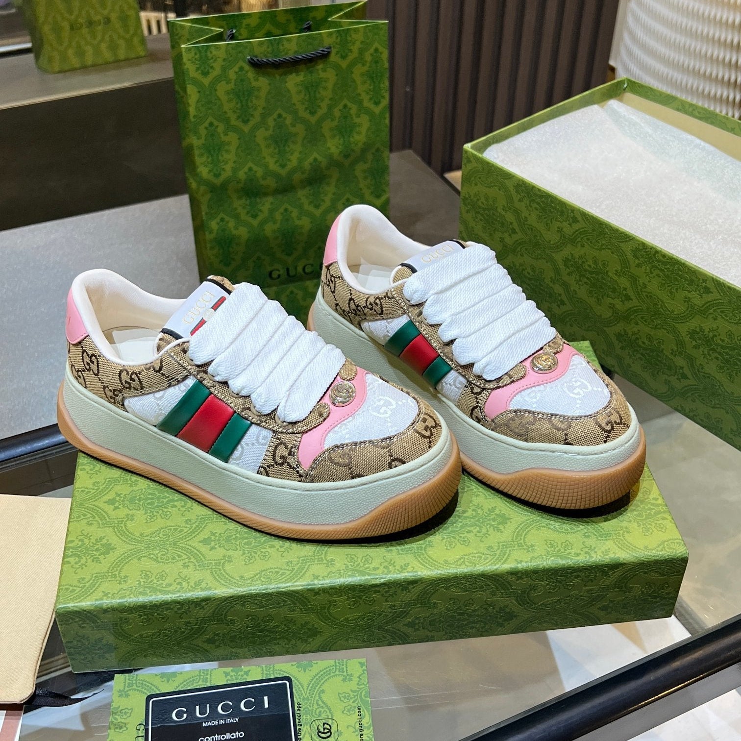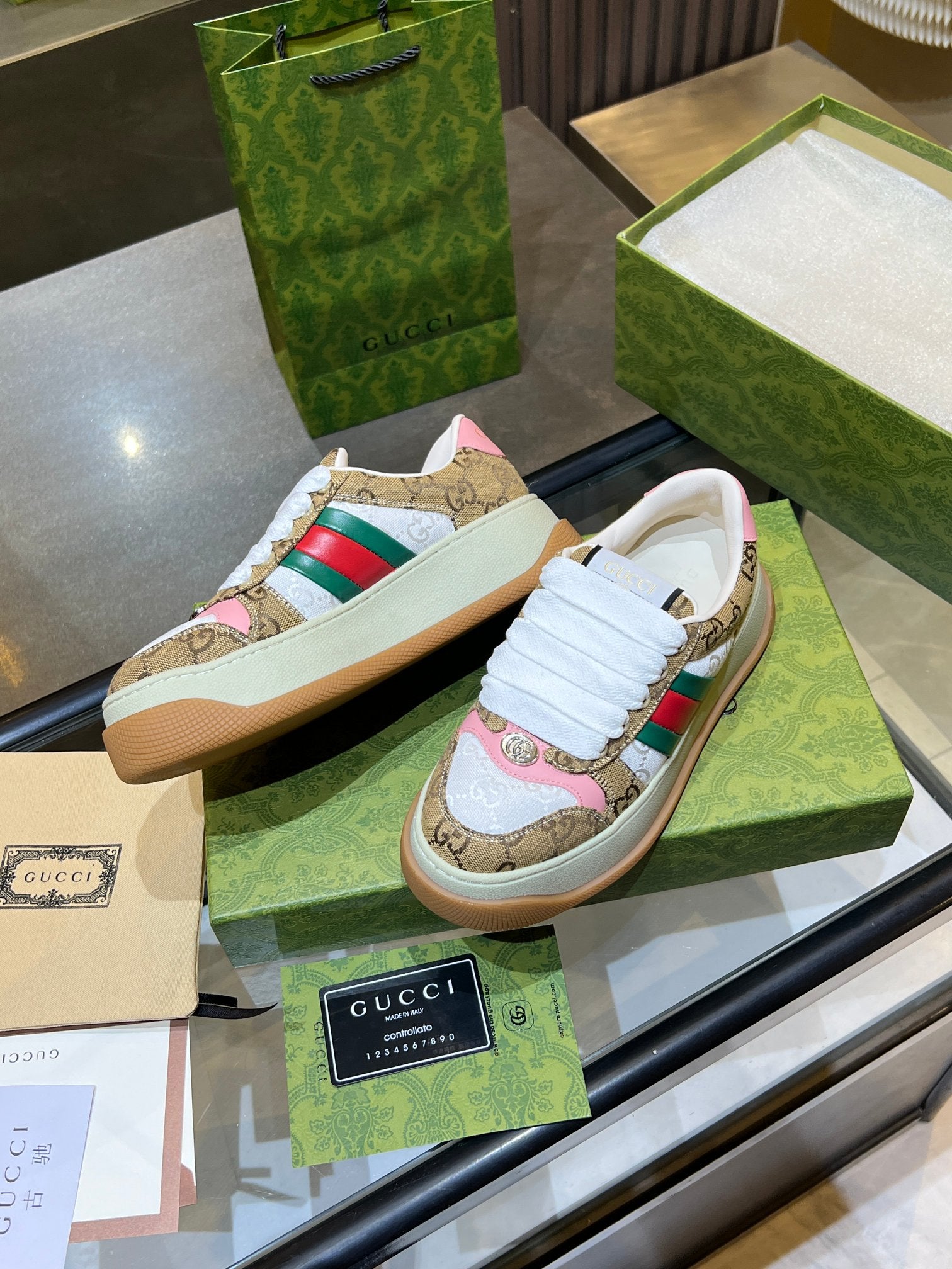 GG Men's Screener Sneaker Brown White Canvas Sheepskin 523601