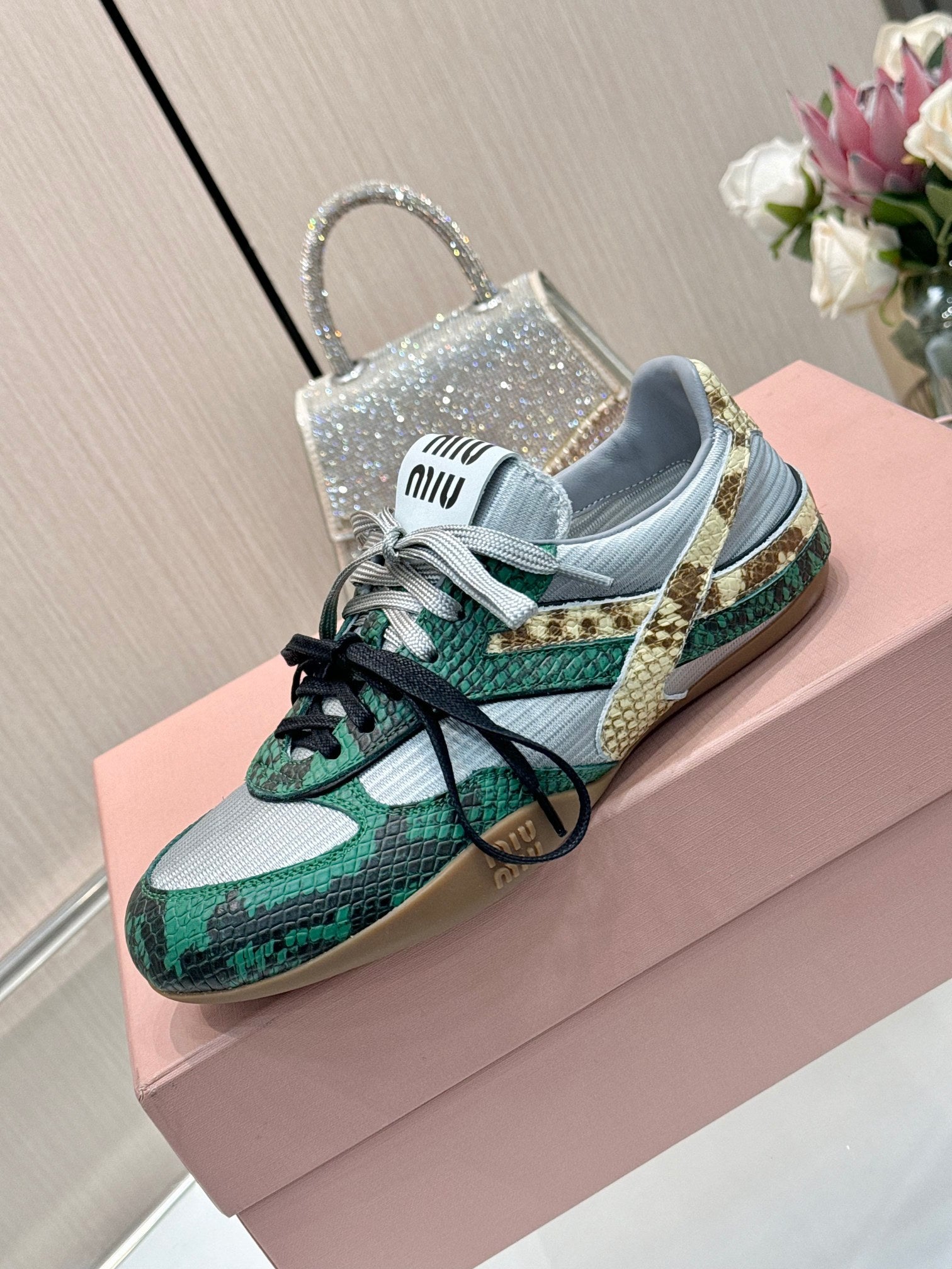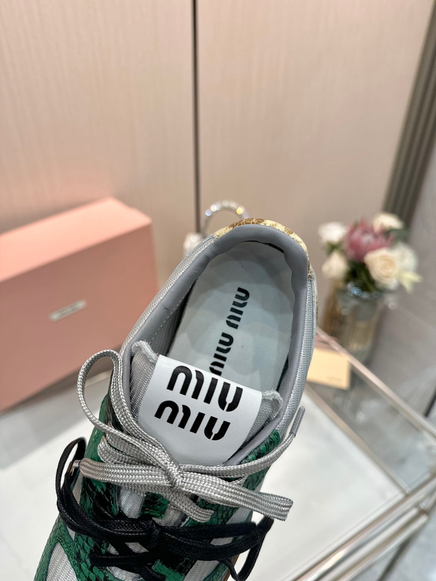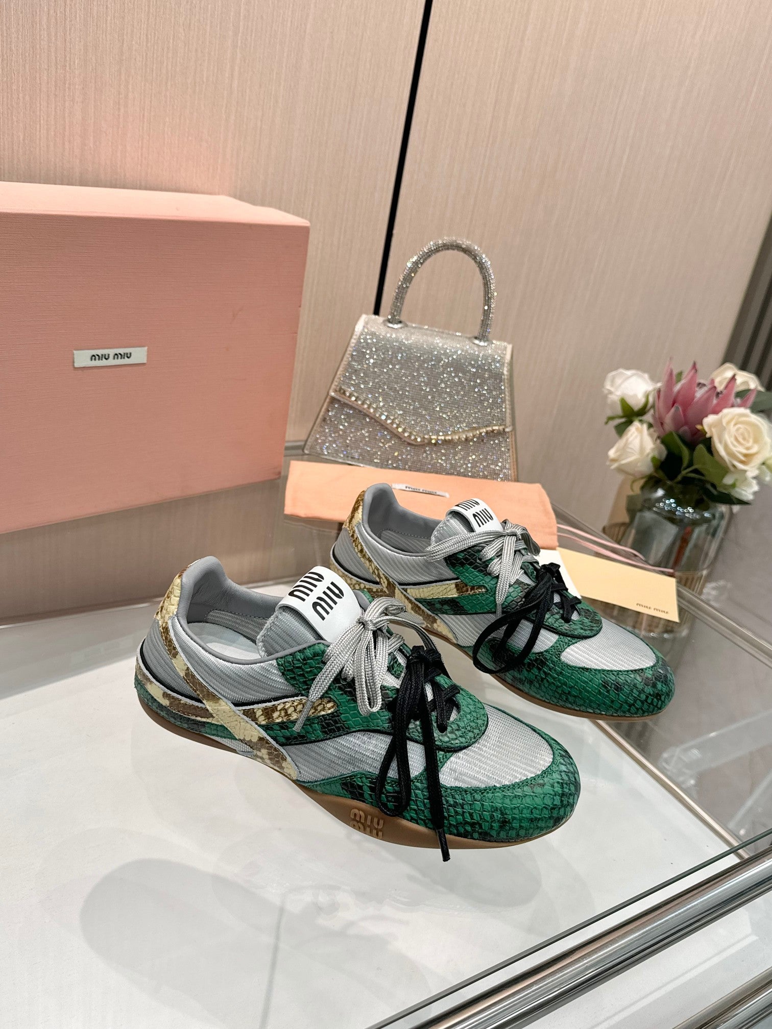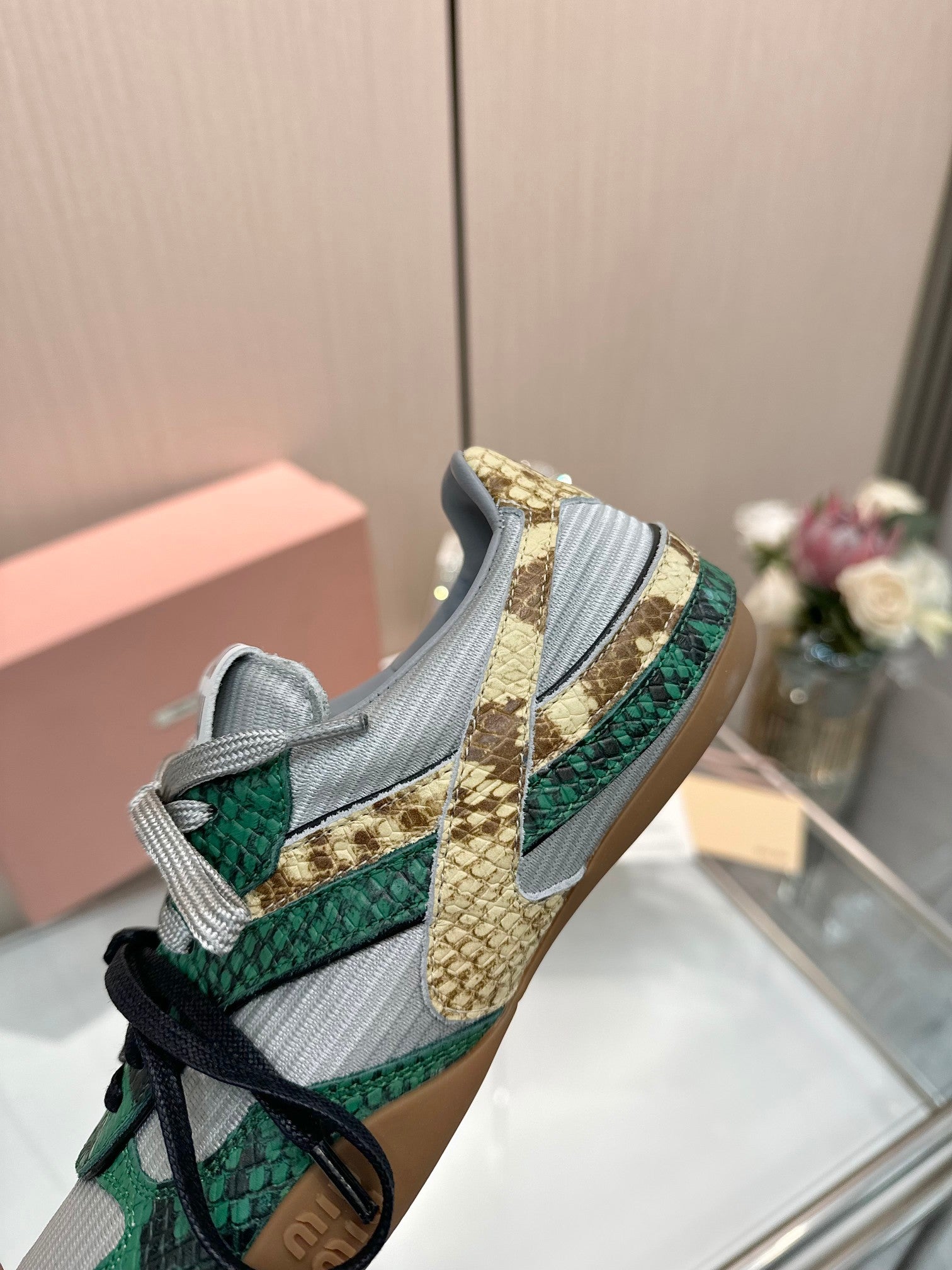 Miu 26SS Gymnasium Sneaker Fir Green Grey Python-print Sheepskin 655768