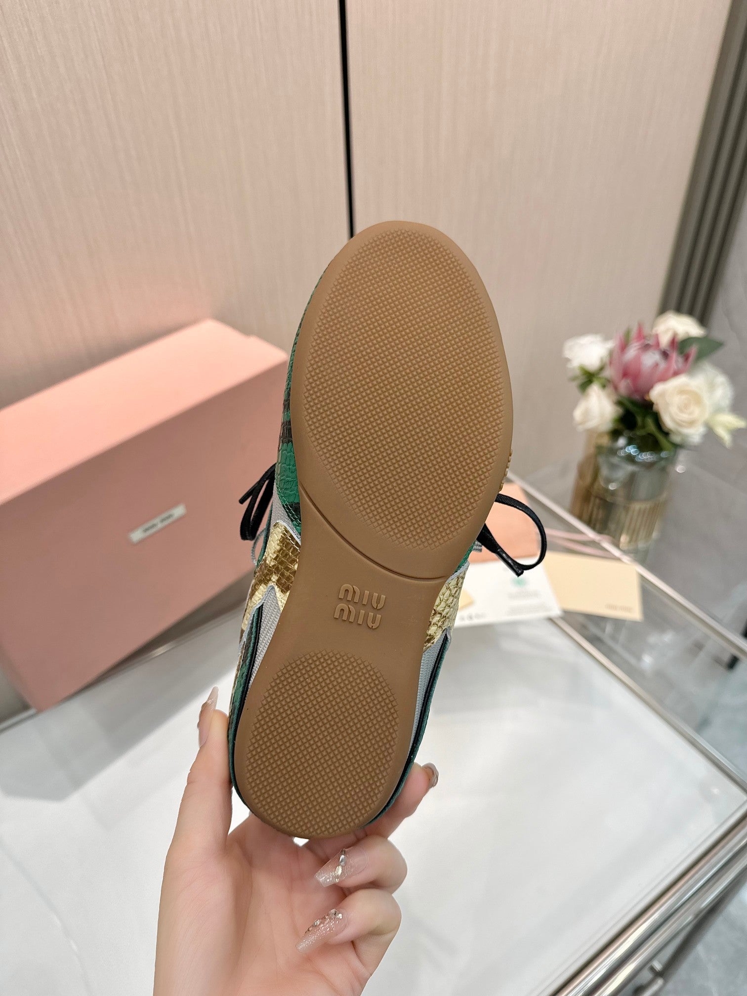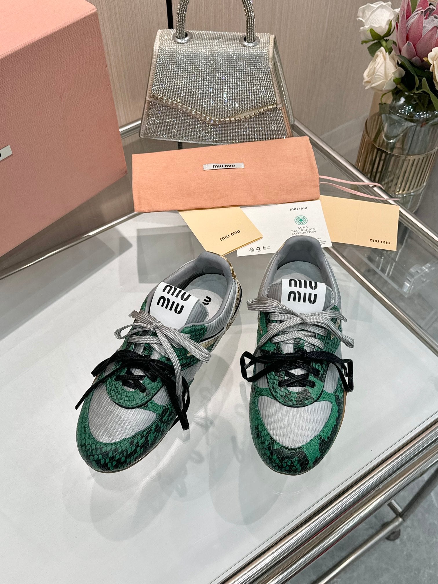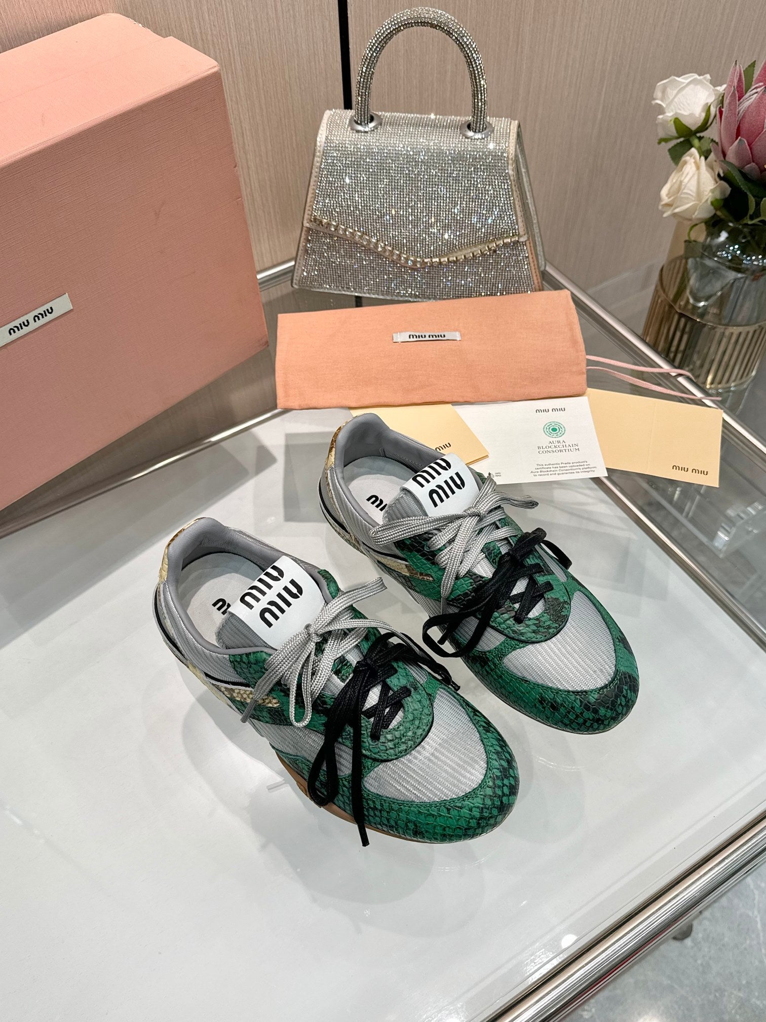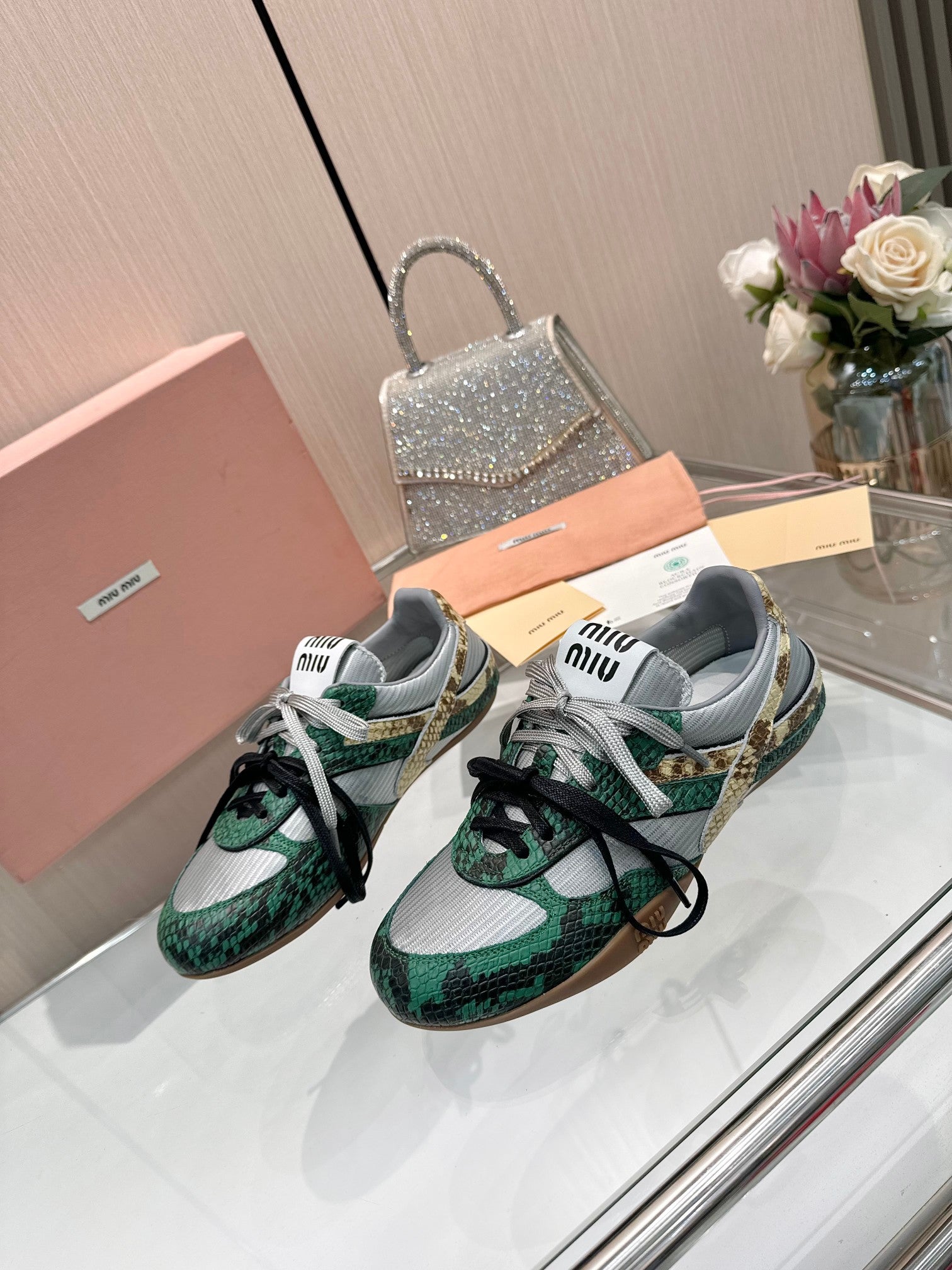 Miu 26SS Gymnasium Sneaker Fir Green Grey Python-print Sheepskin 655768