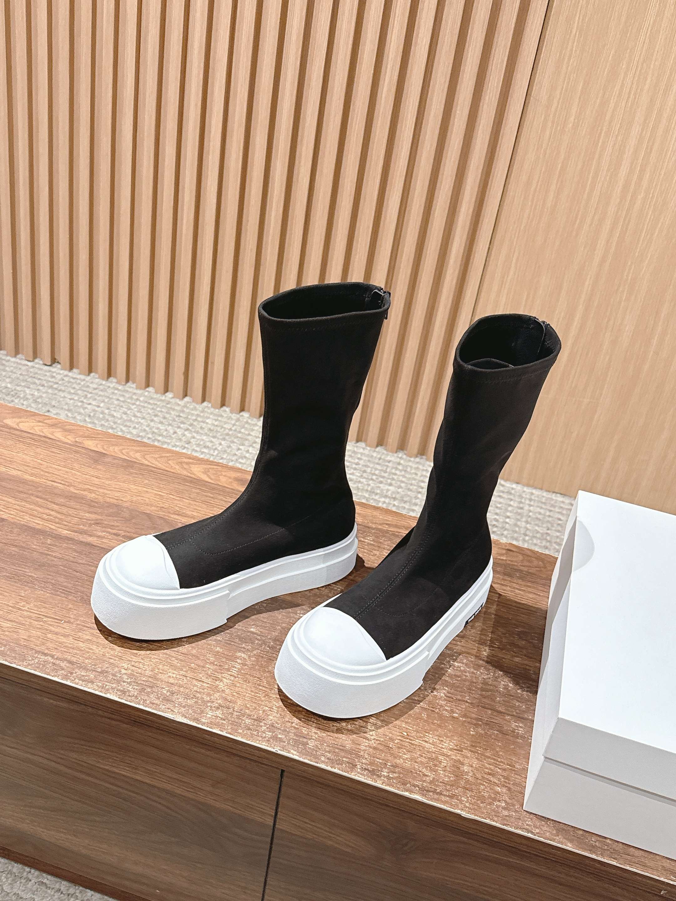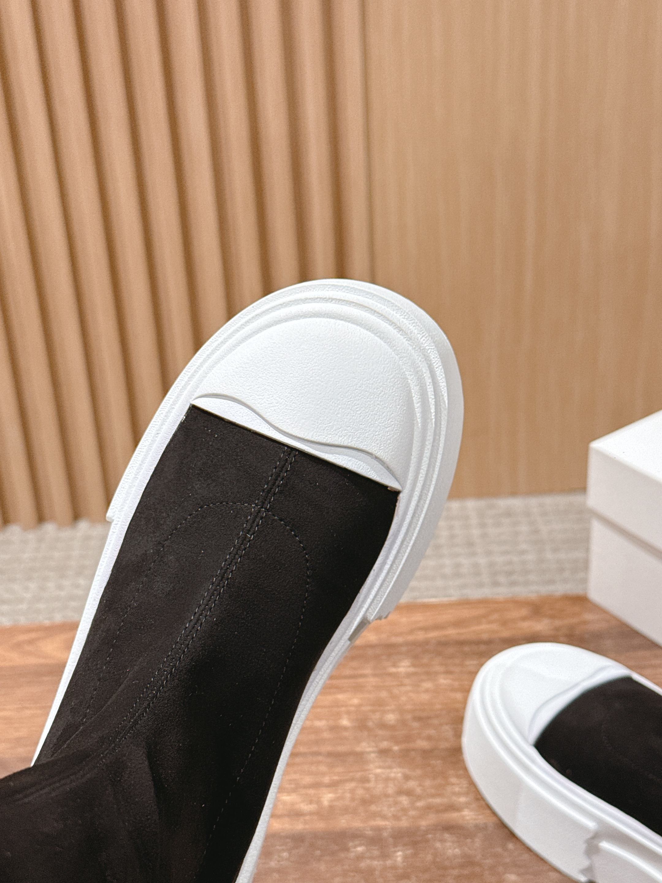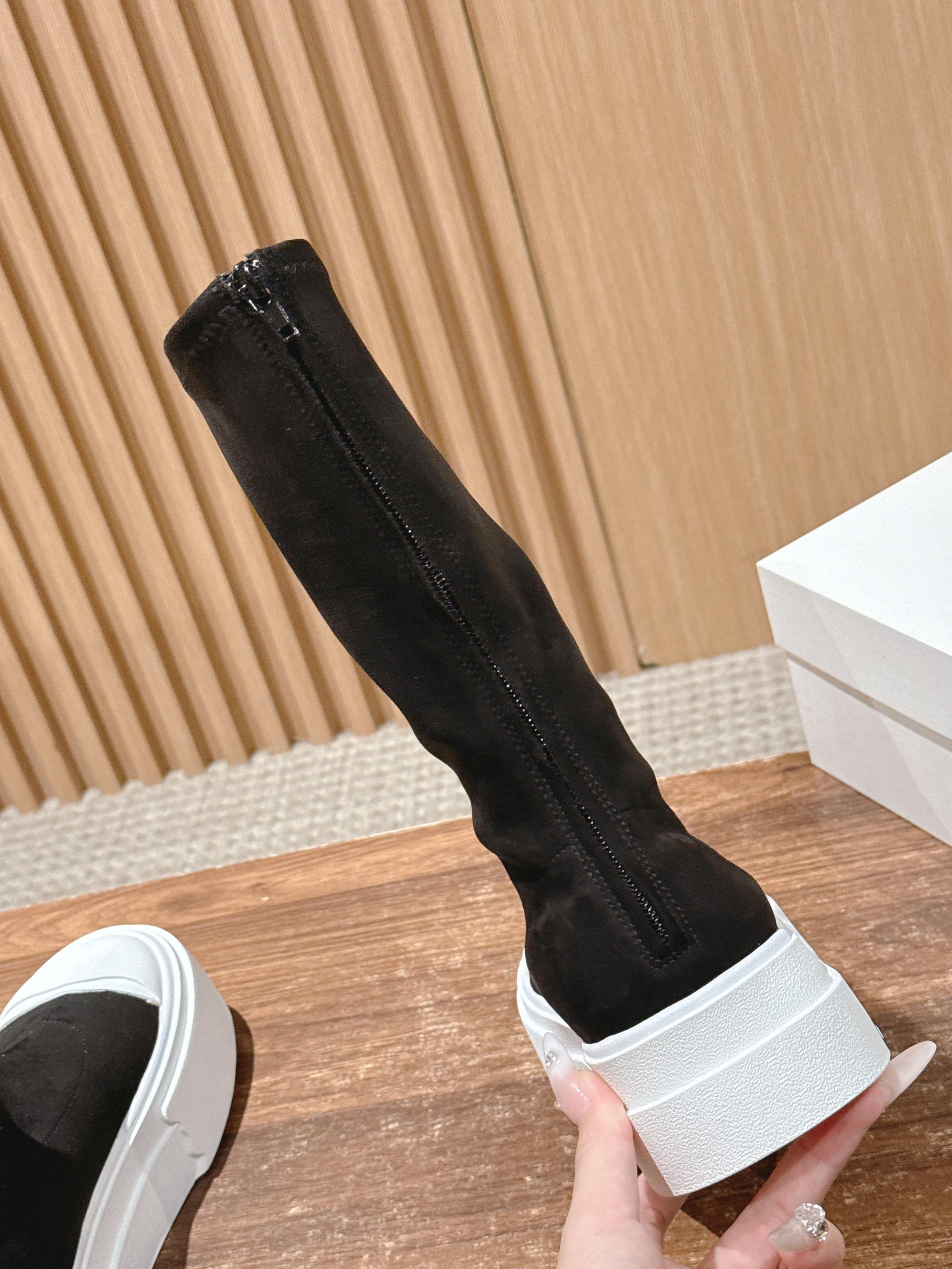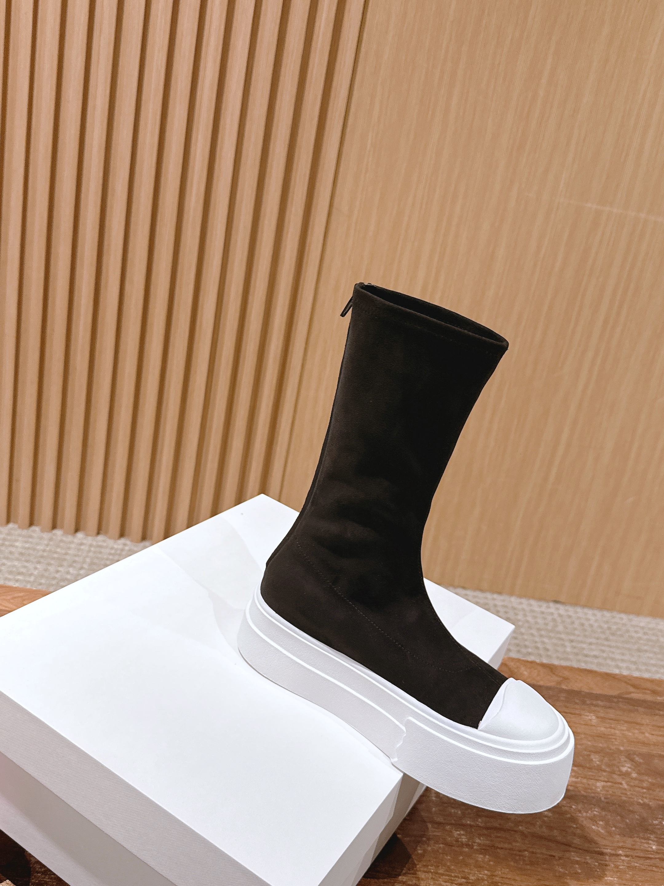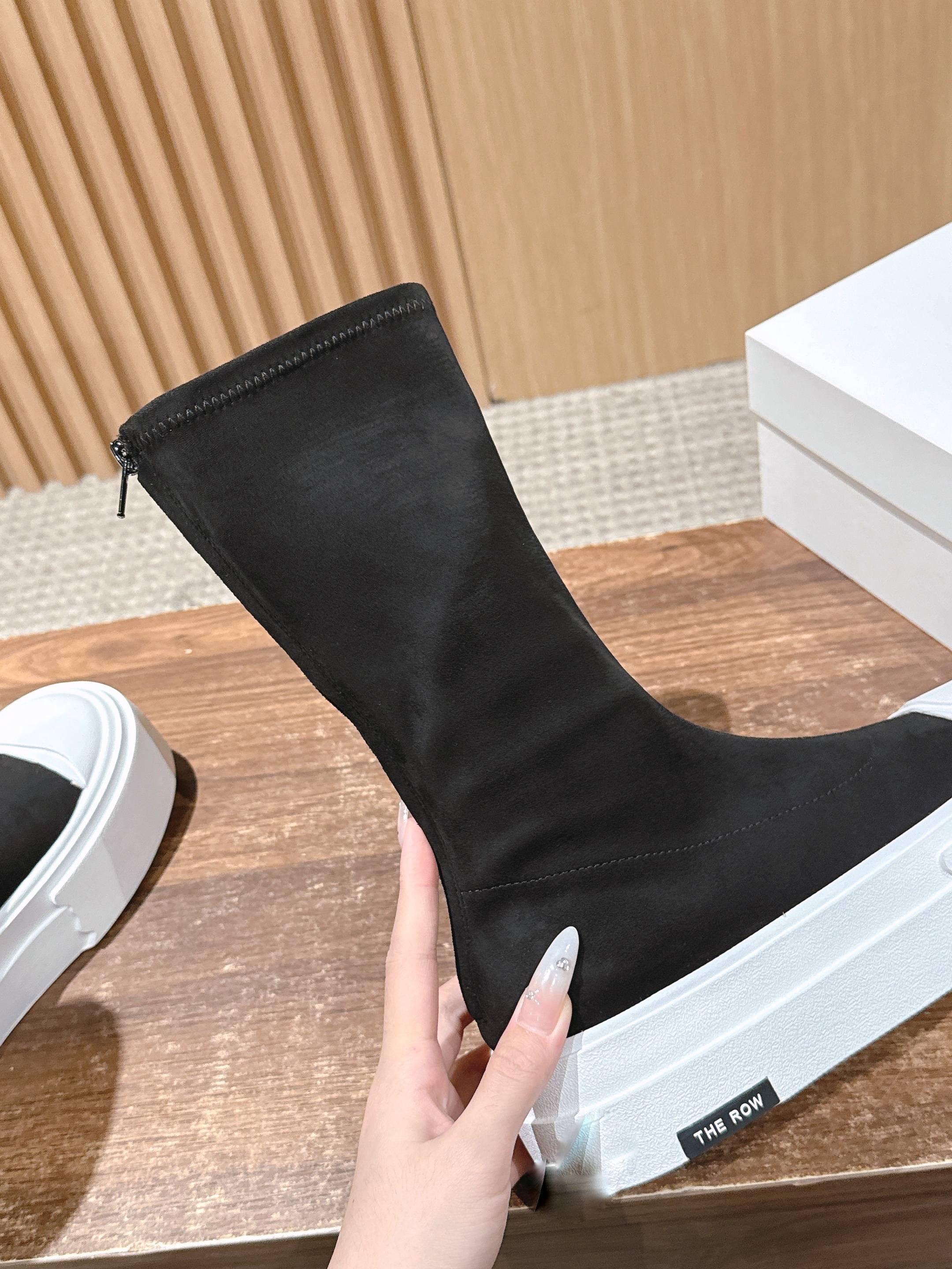 The Row Thick-soled Classic Round Toe Stretch Boots Black White Suede 444176