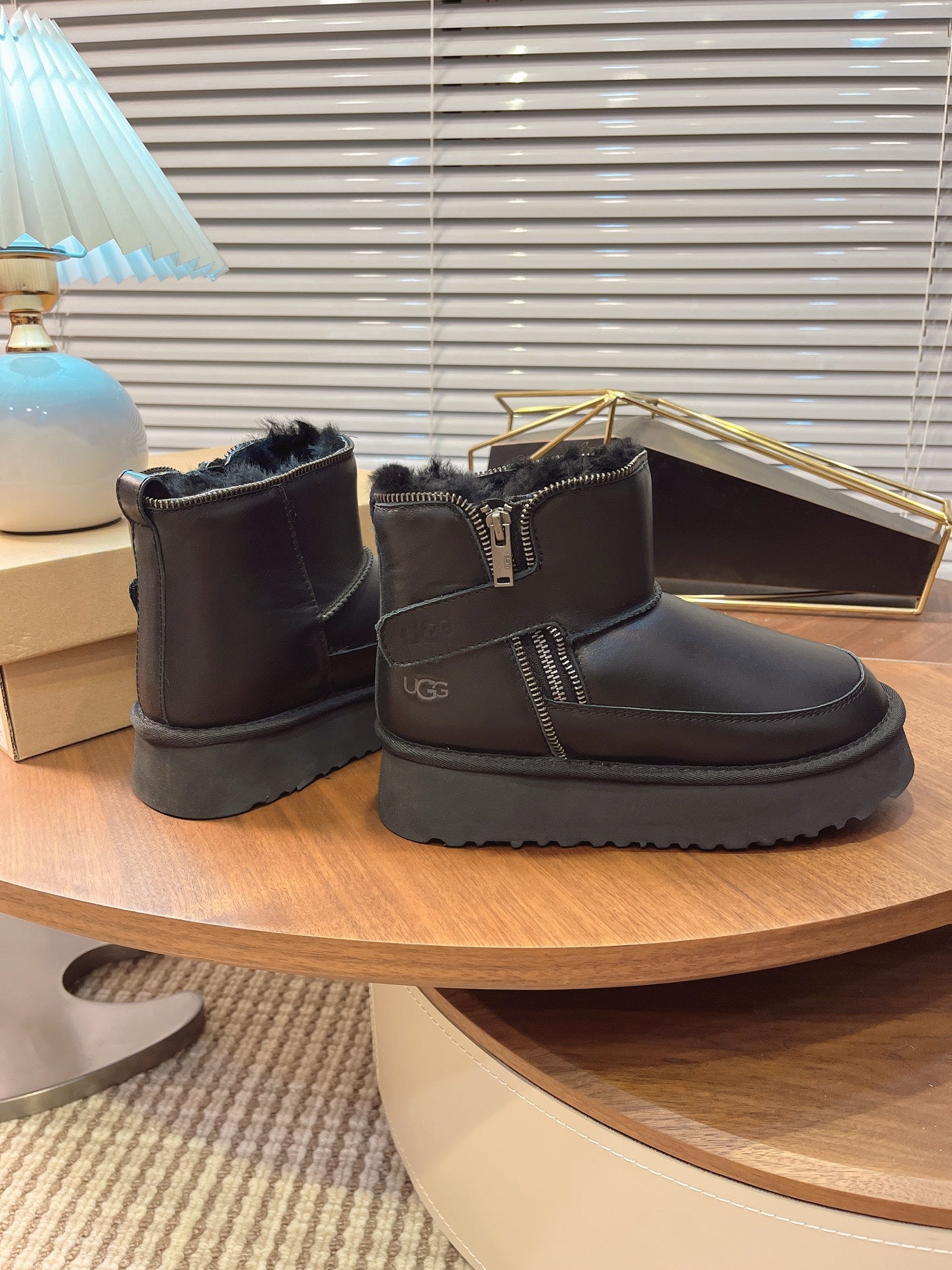 UGG Classic Rebel Biker Mini Boots Black Cowhide Fur